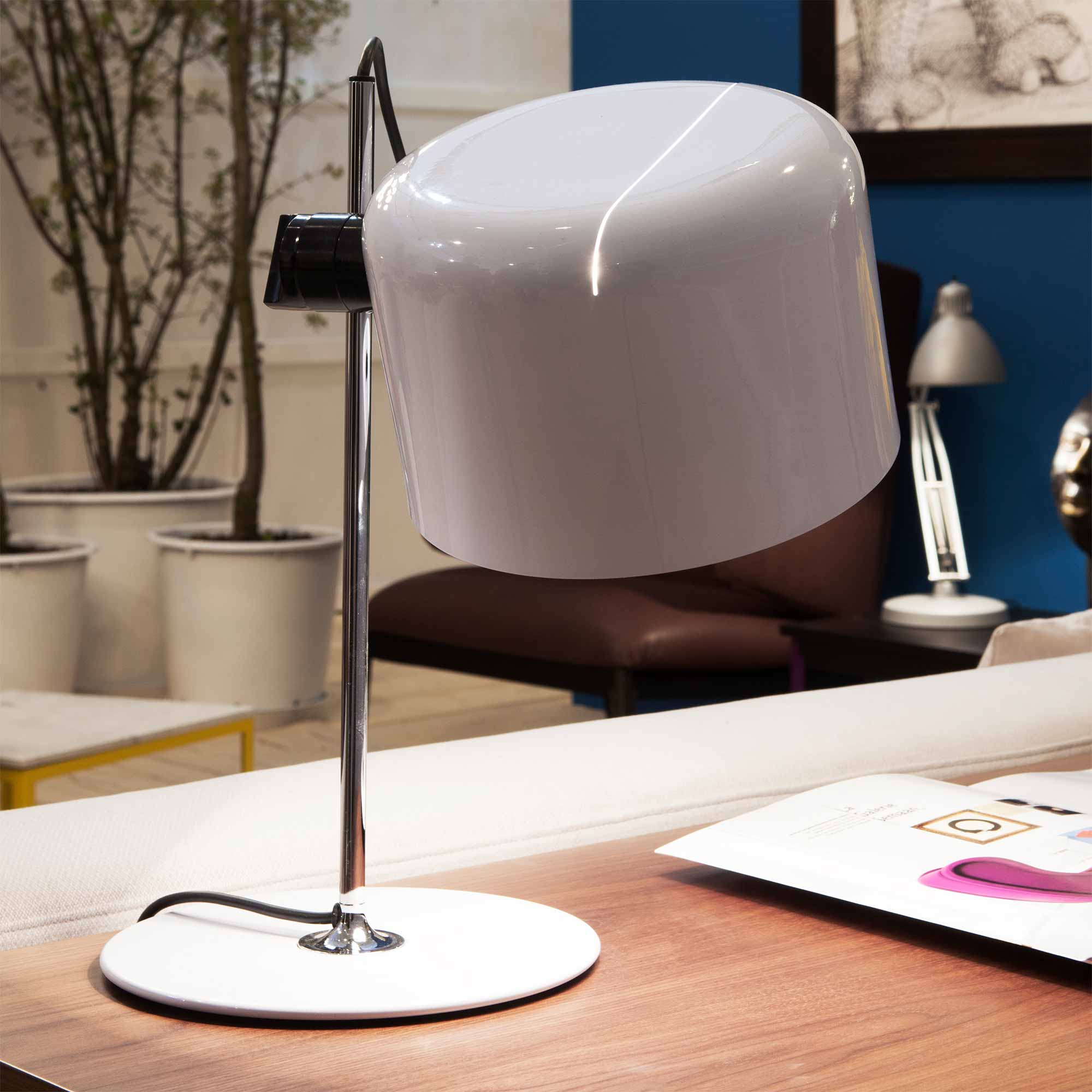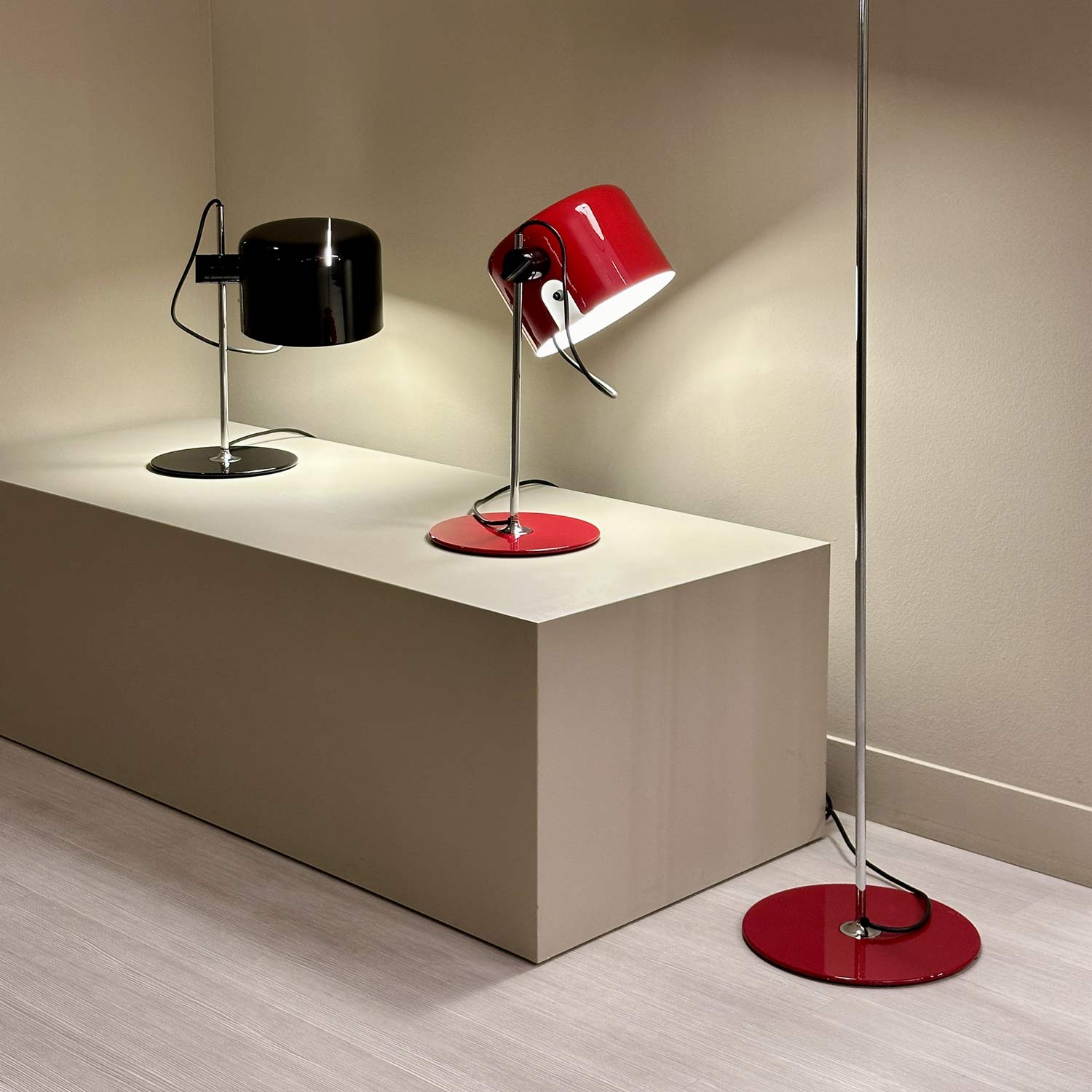 The Coupé series, designed by Joe Colombo, was initially conceived as a variation of the Spider family, created by the same designer, of which it has kept its base and stem. The simple, ingenious mechanism that connects the stem to the head makes it possible to direct the beam in several directions, by moving the dome up, down and sideways. In 1968, Coupé won the ”International Design Award” of the American Institute of Interior Designers in Chicago. It is part of the permanent collection at both the MoMA in New York and the ”Neue Sammlung” Museum in Munich. Available in two versions, with either a semi-cylindrical or a semi-spherical dome, over the years, many models of Coupé have been created (ranging between the historic table lamp to the floor and wall lamps), becoming one of the most renowned and appreciated Oluce collections.