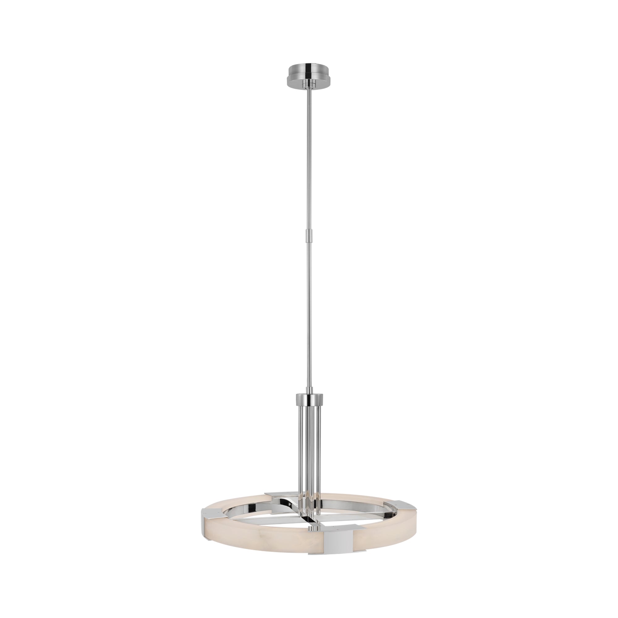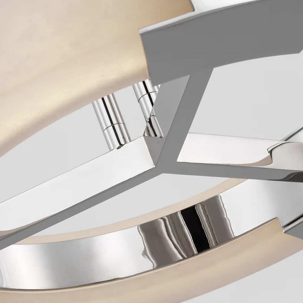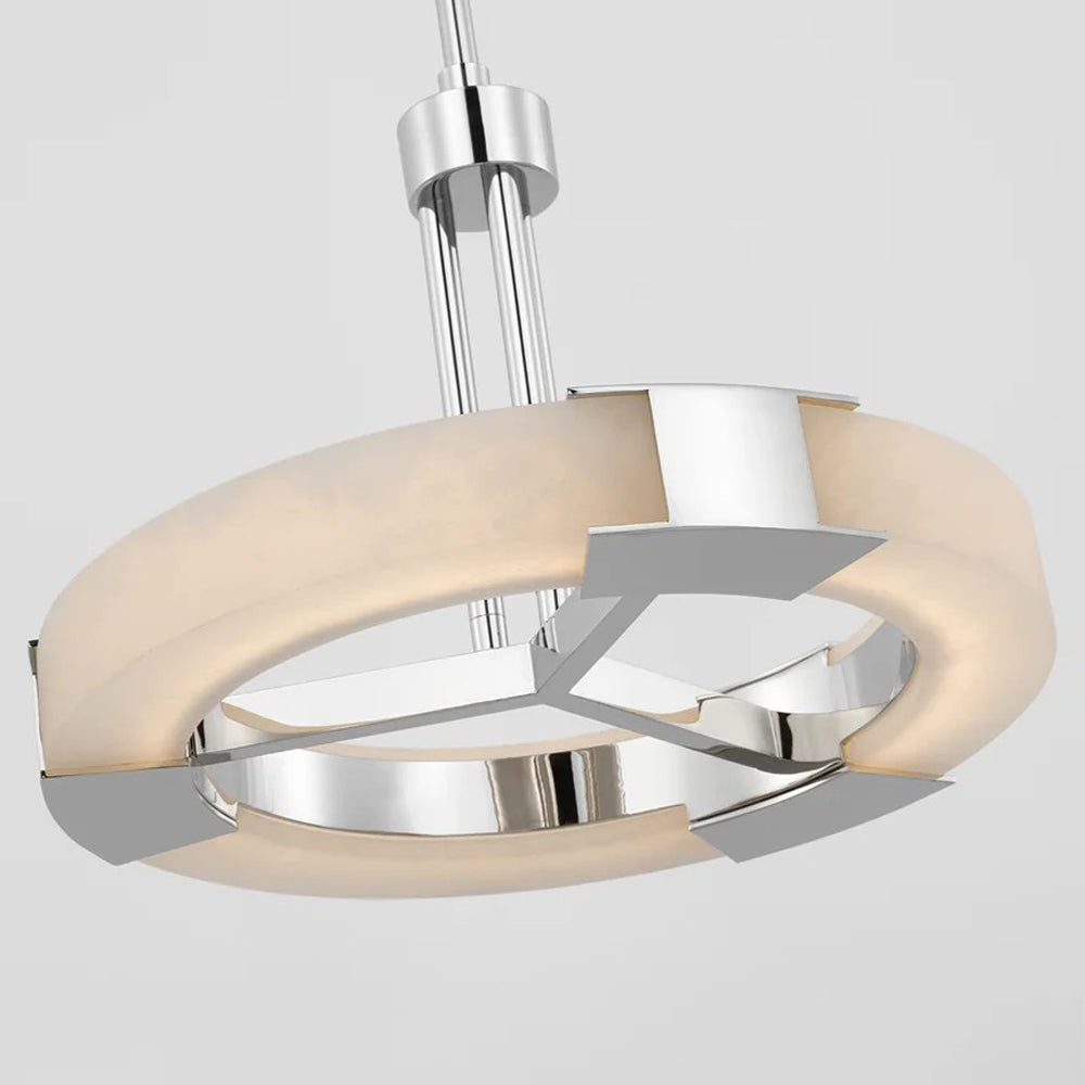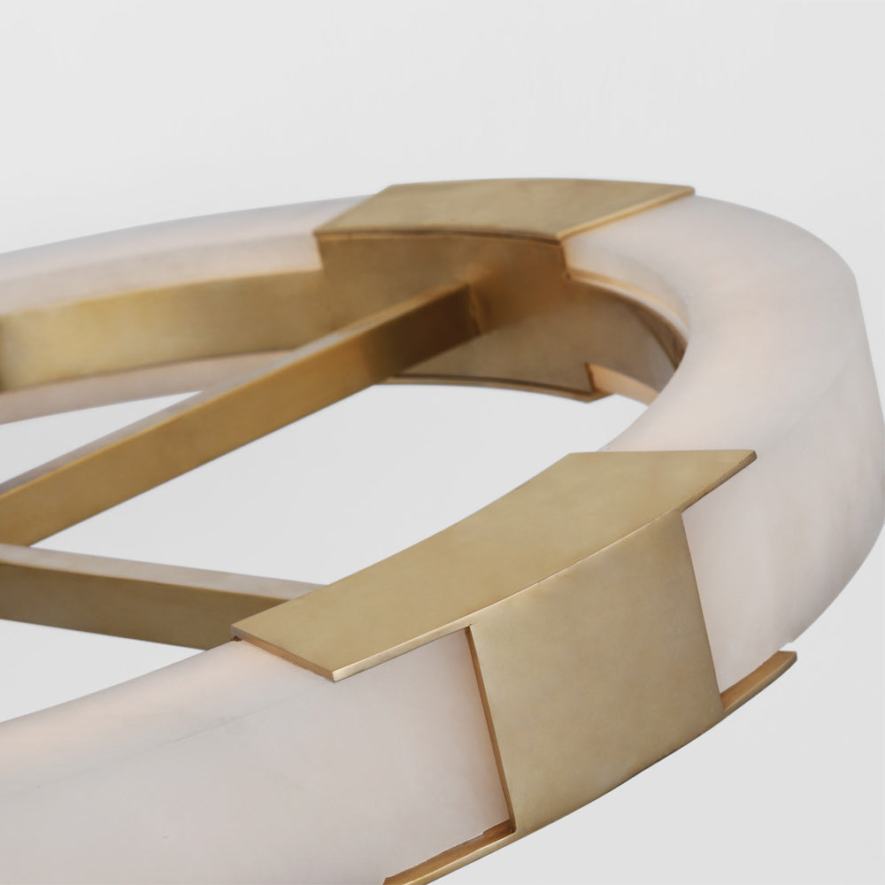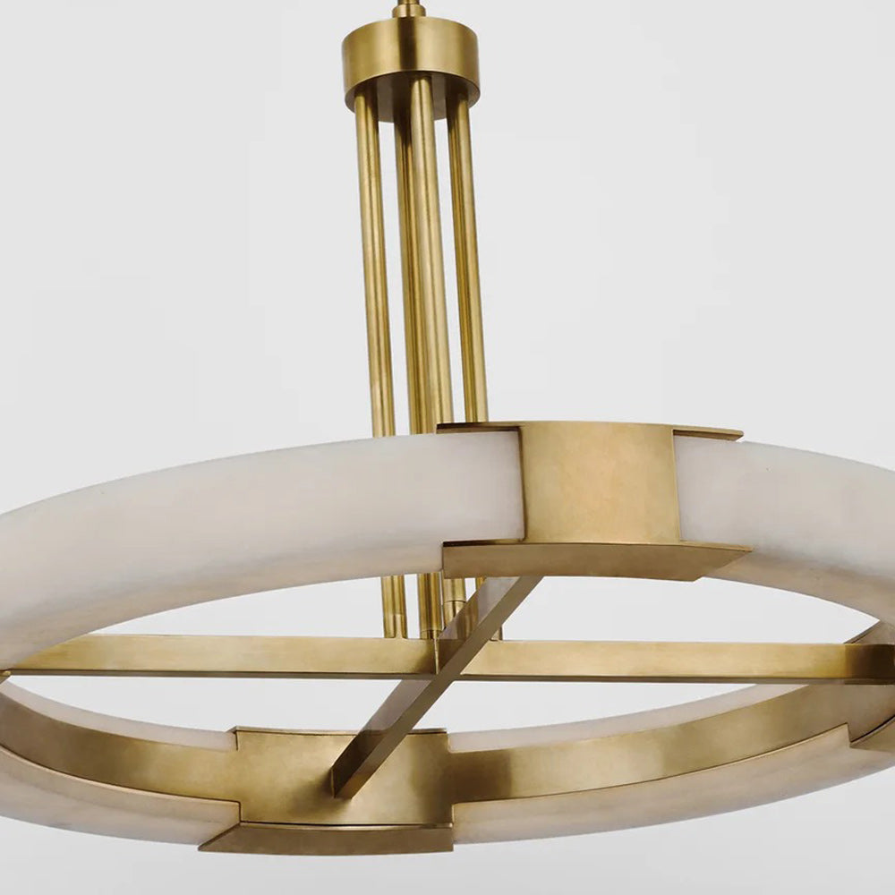 The Covet Ring LED Chandelier from Visual Comfort Signature experiments with industrial styling and produces a simple yet fitting look in fixtures. A round frame with dedicated LED lighting is complemented with crossbar elements, emphasizing the crisp minimalist look with surprisingly elegant materials.