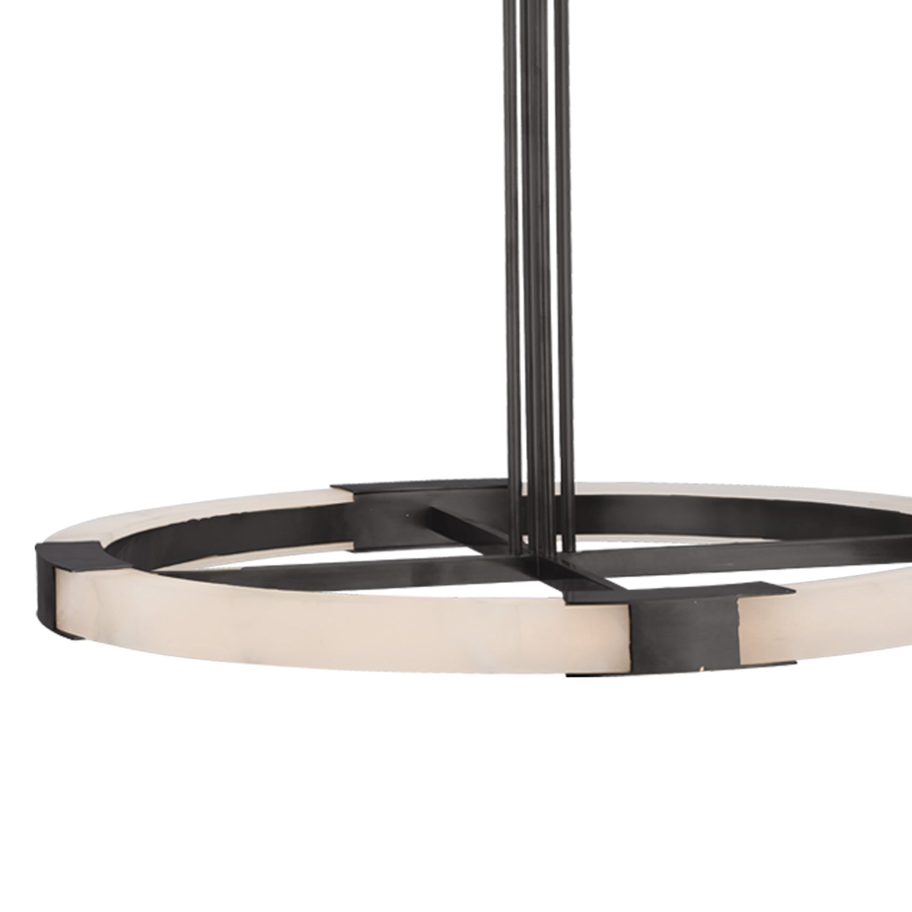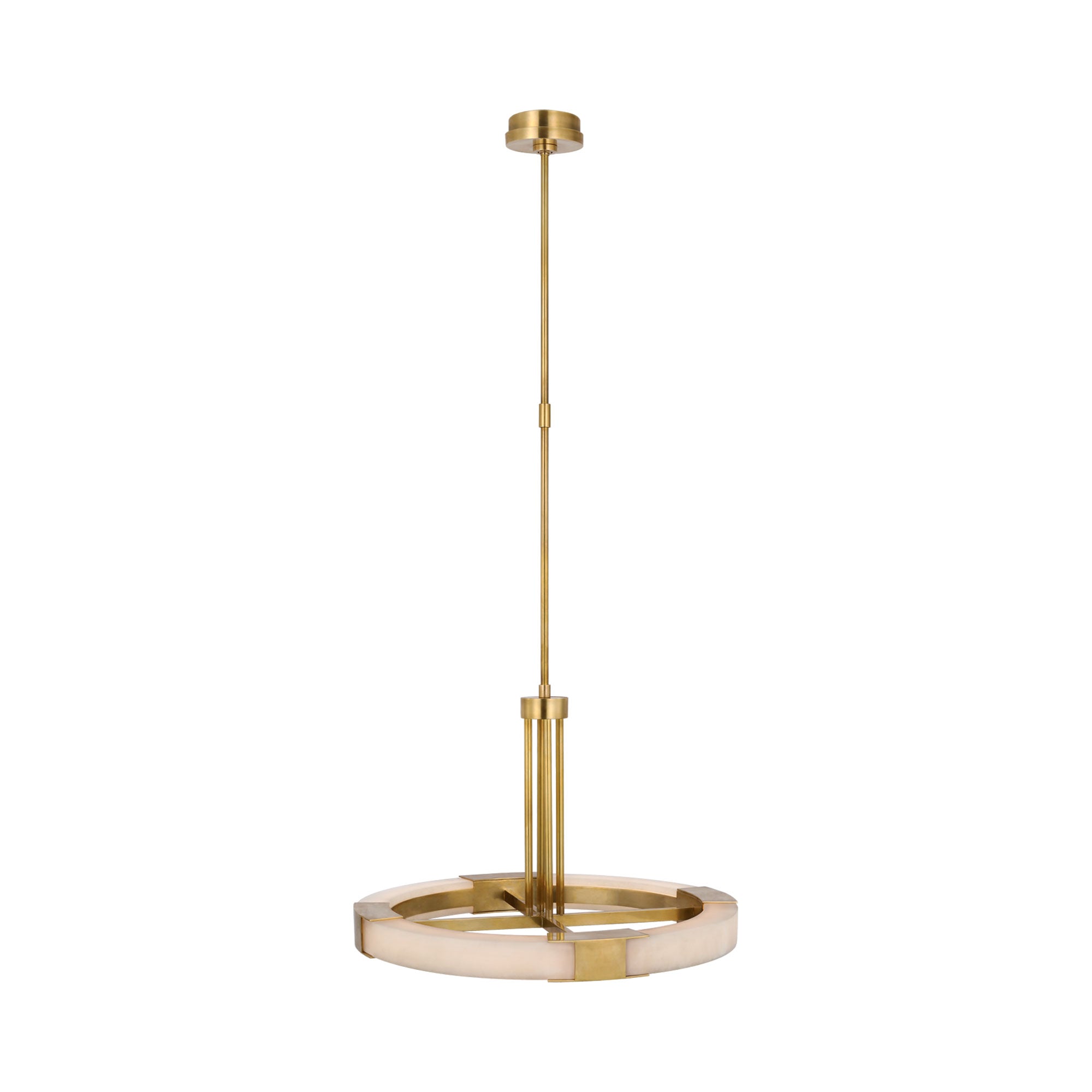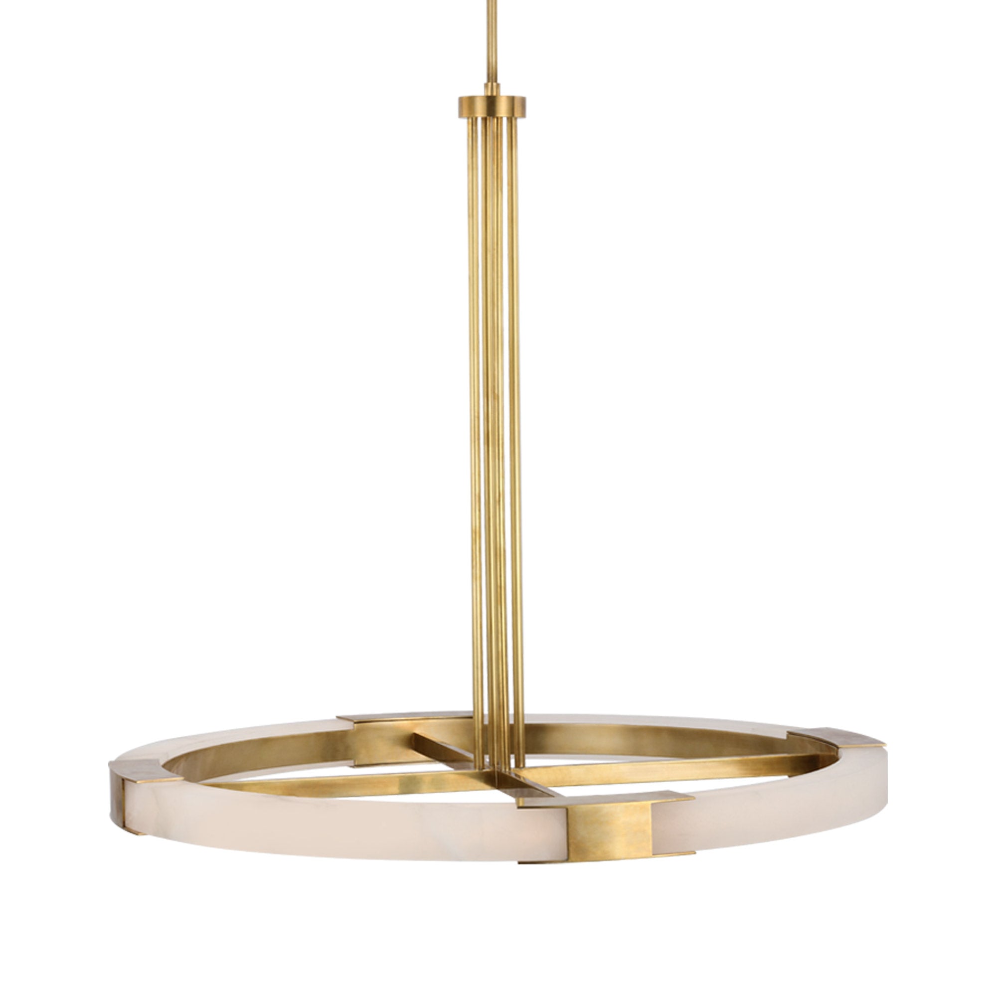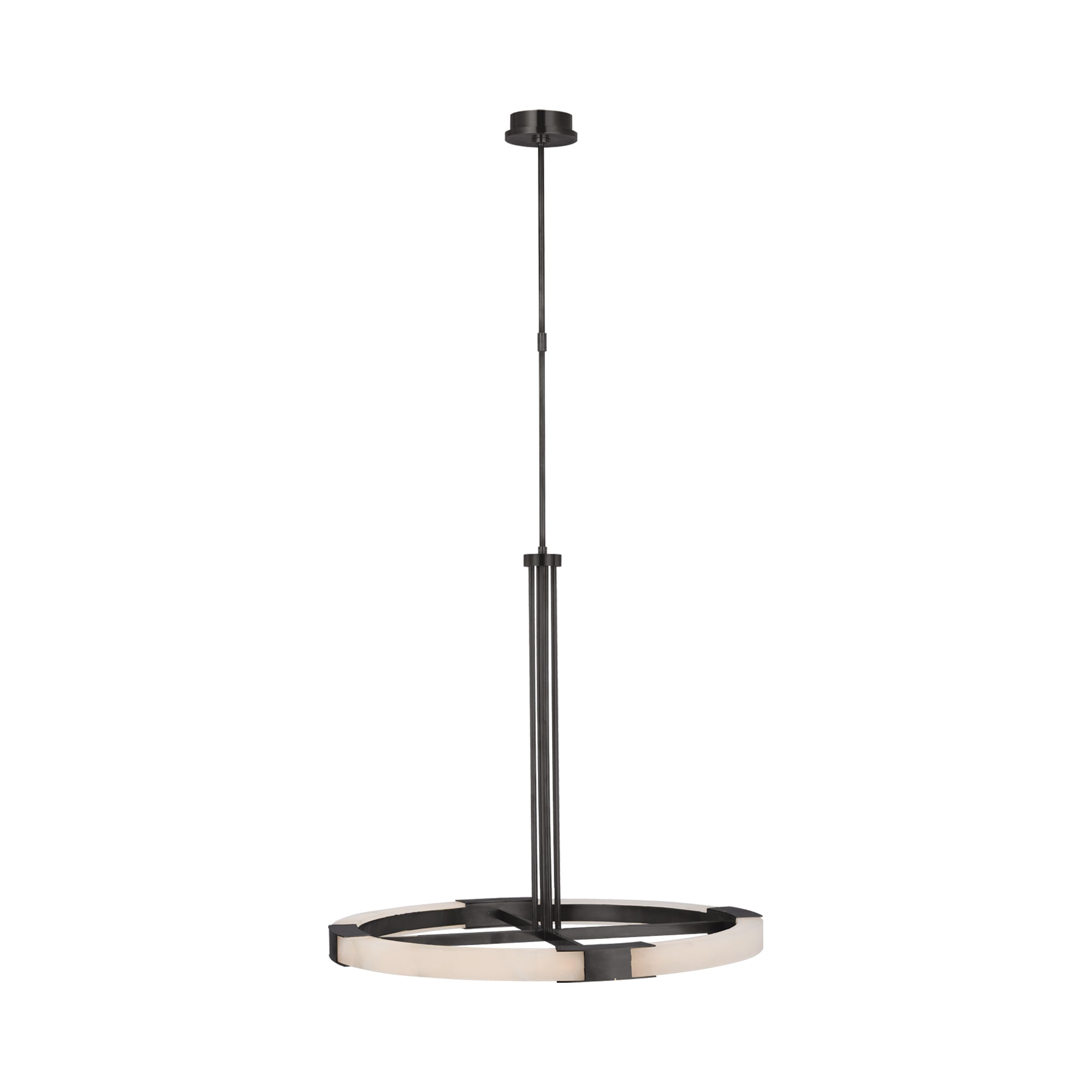 The Covet Ring LED Chandelier from Visual Comfort Signature experiments with industrial styling and produces a simple yet fitting look in fixtures. A round frame with dedicated LED lighting is complemented with crossbar elements, emphasizing the crisp minimalist look with surprisingly elegant materials.