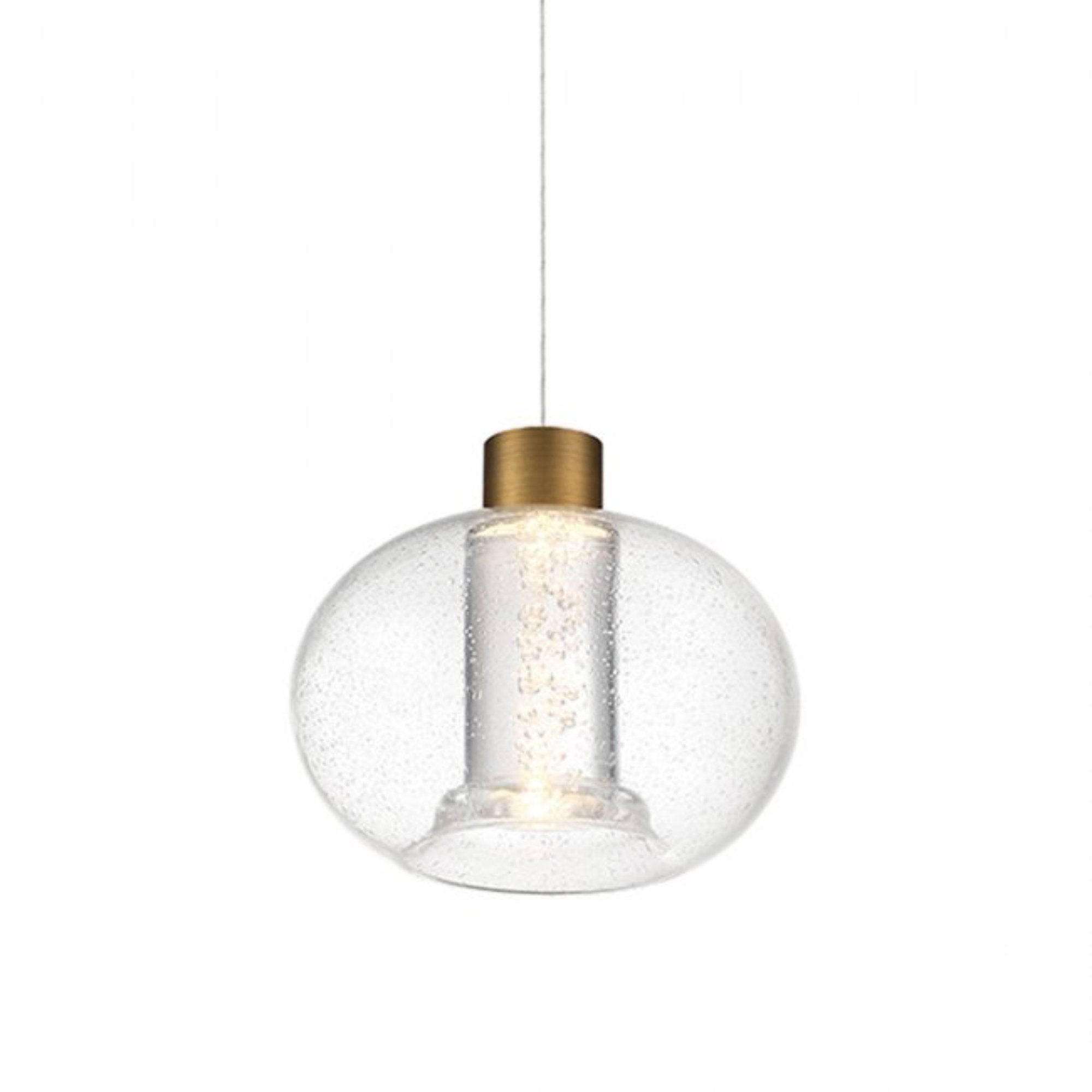 A study in sleek architectural aesthetics forms the Crater LED Mini Pendant Light from dweLED and its clear glass shade with a bubbled acrylic diffuser suspended by a warm aged brass finish aluminum holder and stealth cord.