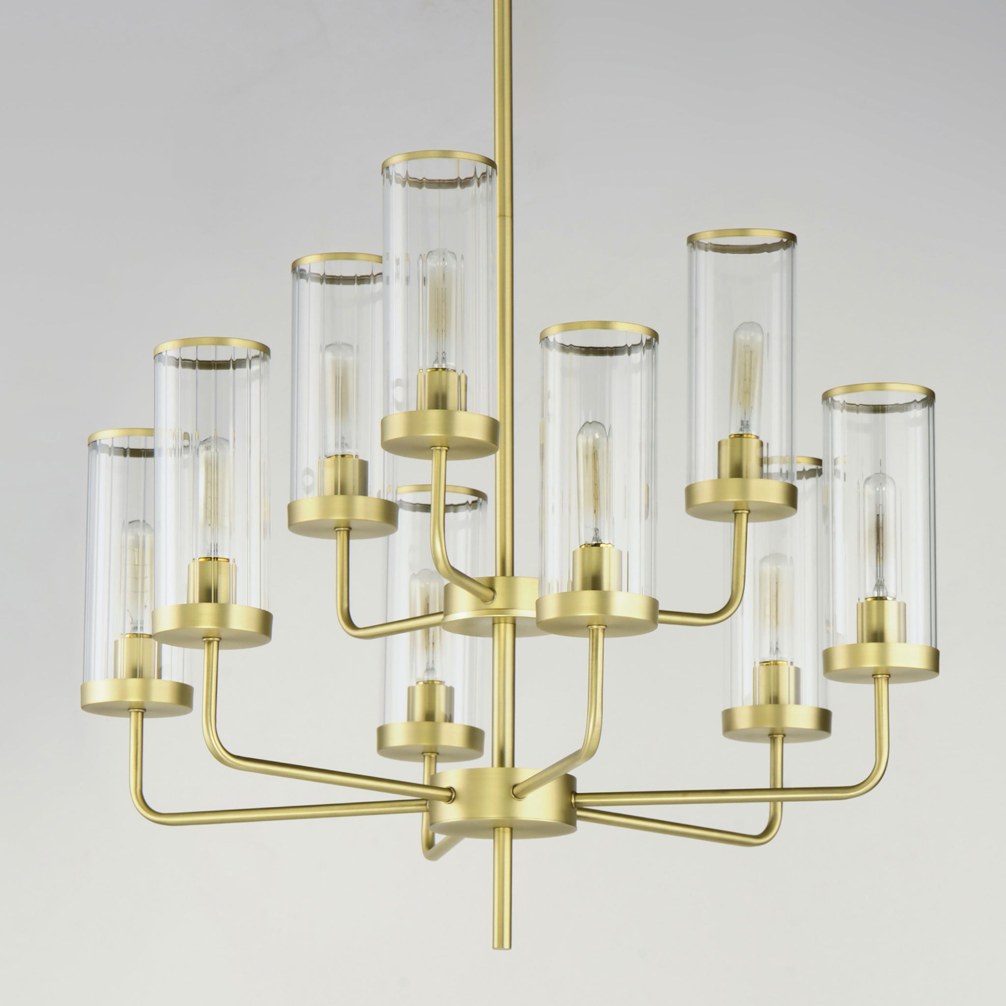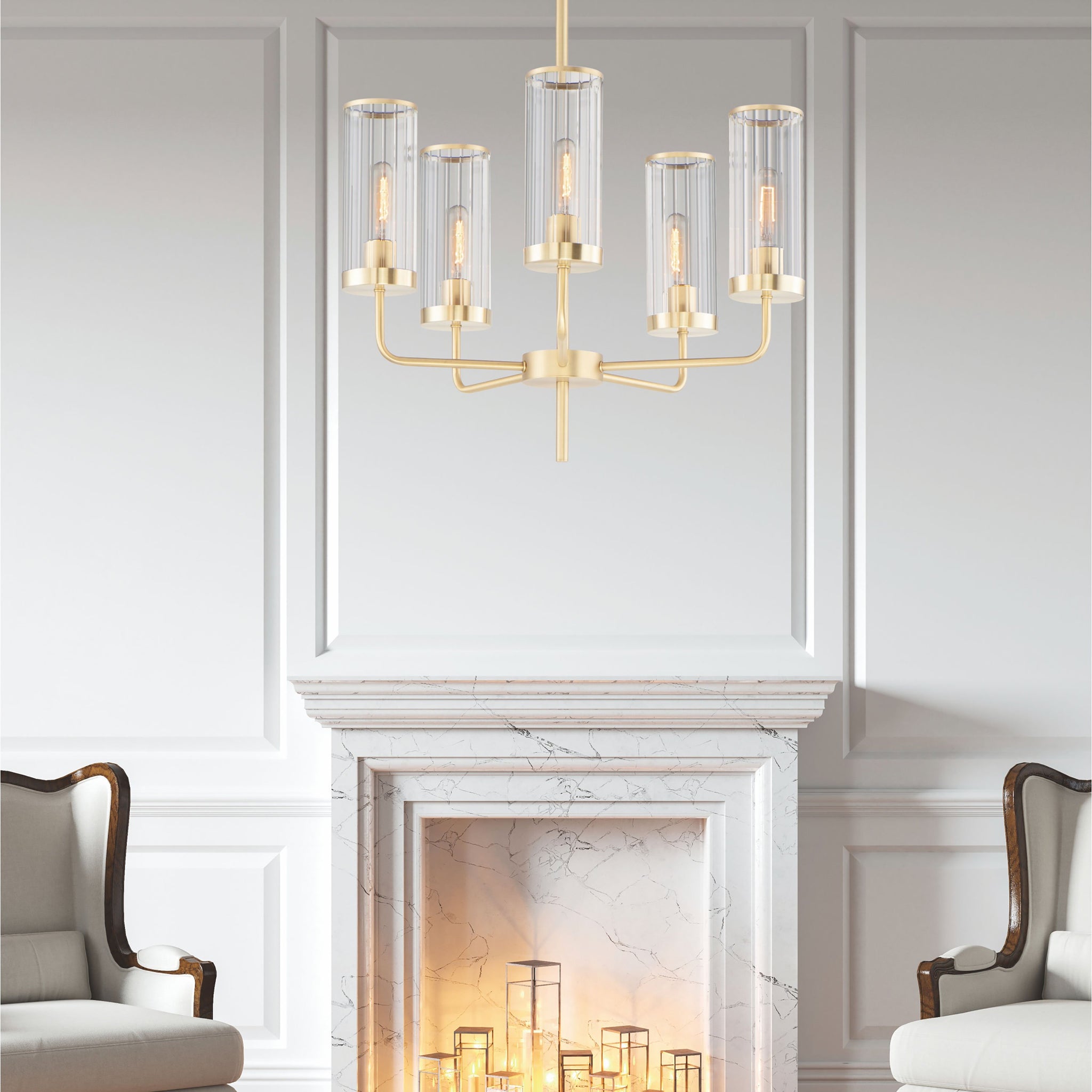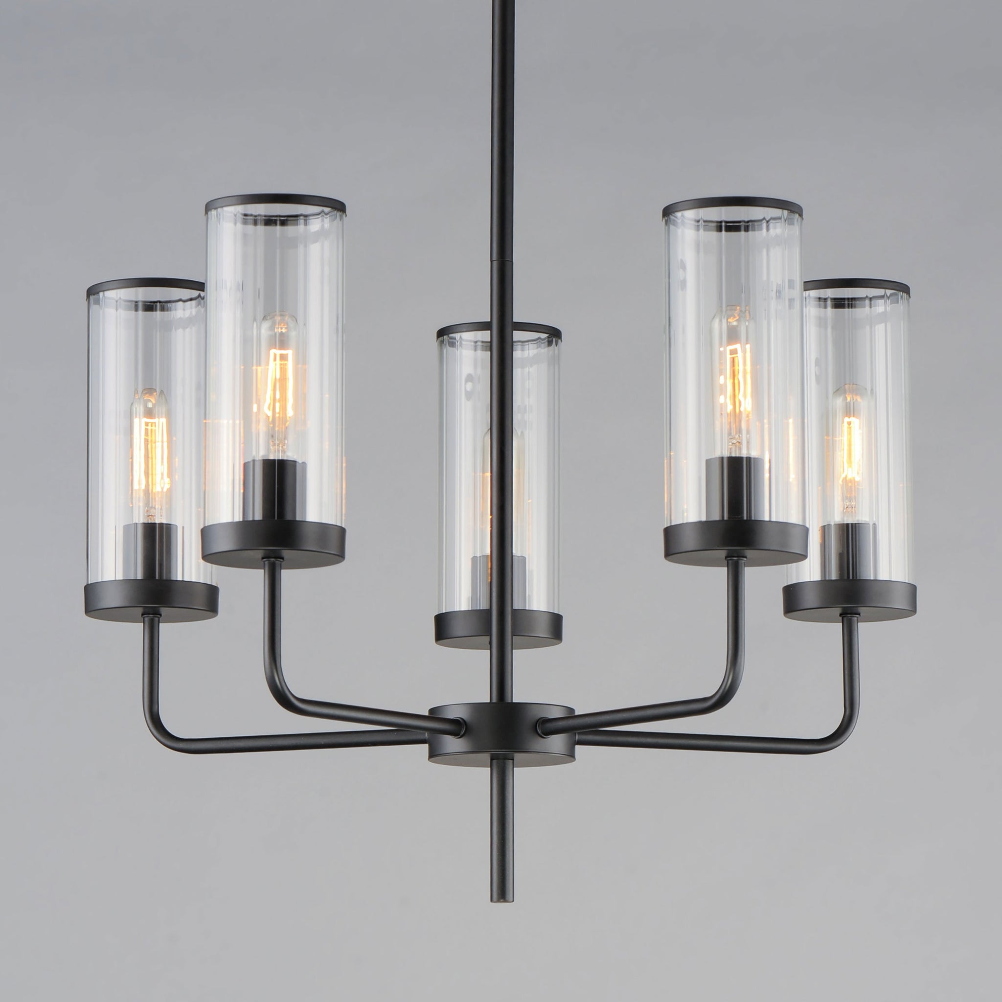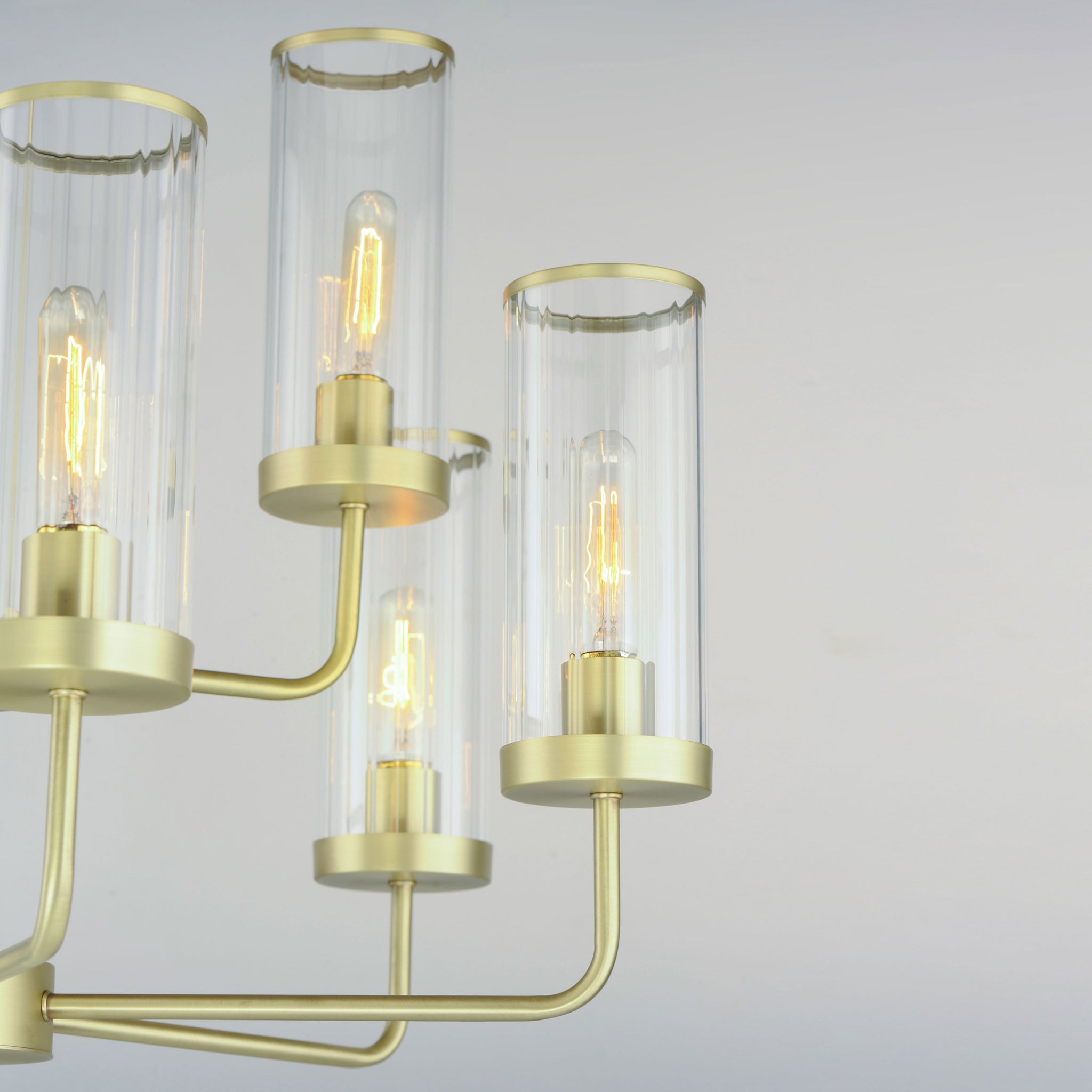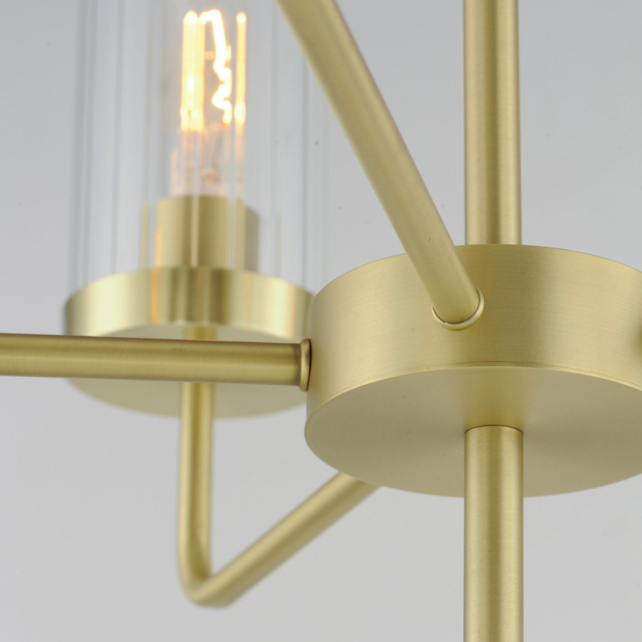 Simple, yet stylish, this minimal chandelier comes in your choice of Satin Brass or Matte Black bringing contemporary appeal. Clear Ribbed glass shades are fitted with rings in a coordinating color to complete the look.