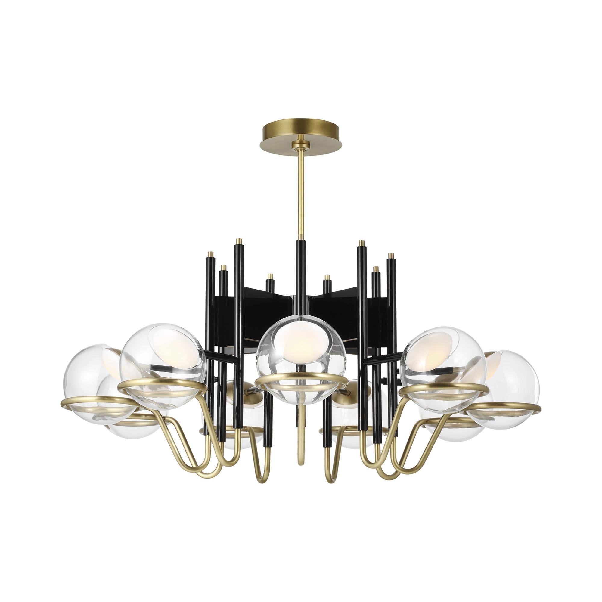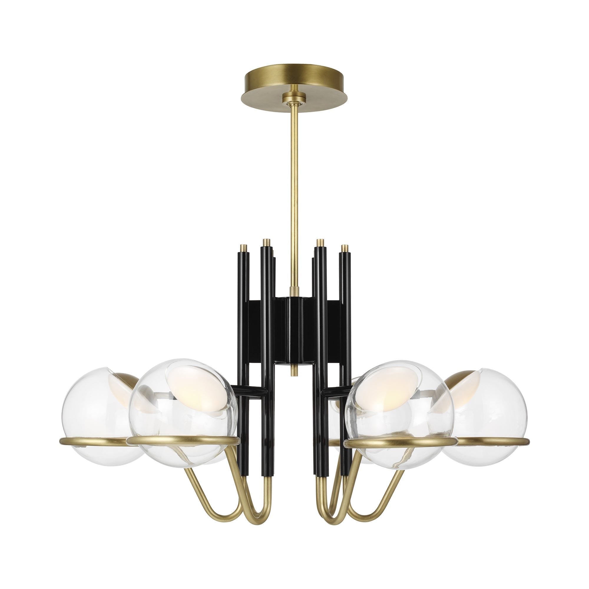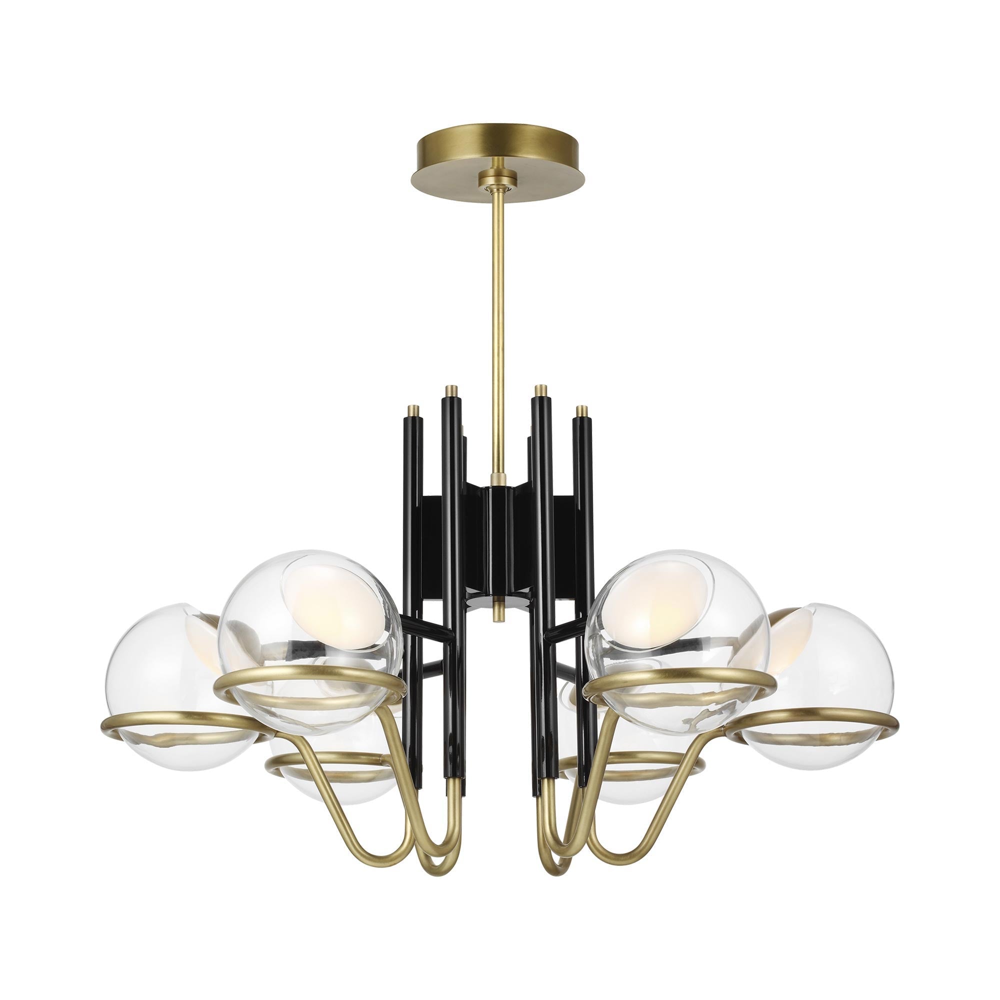 The Crosby LED Chandelier by AvroKO for Visual Comfort Modern blends the radiance of 1970's Italian flair, with a striking yet simple design. Distinctive to its musical delicacy, the glossy black metal armature yields to an elegant brass “harp” holding a glass globe dispersing light fluidly and illuminating any space with perfection.