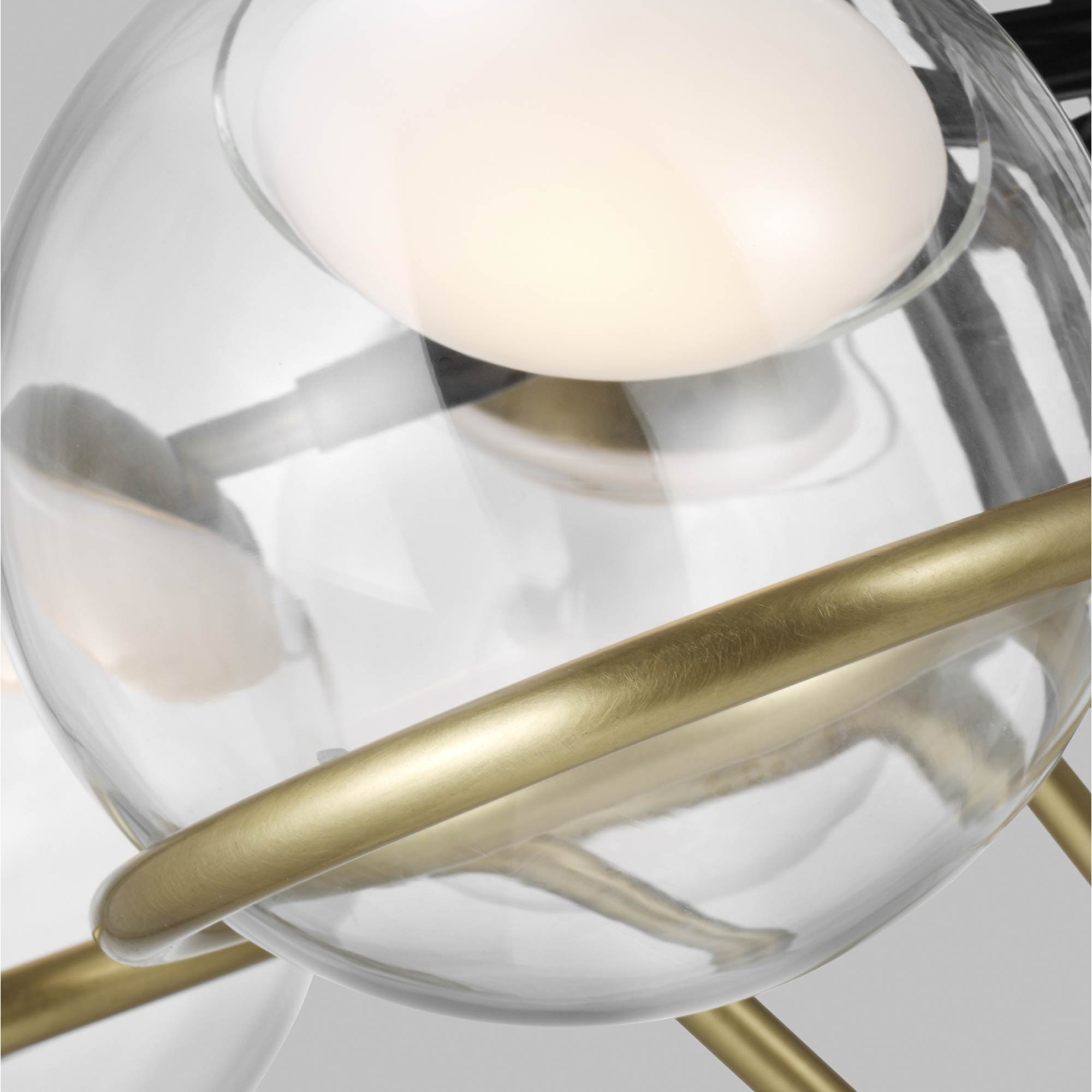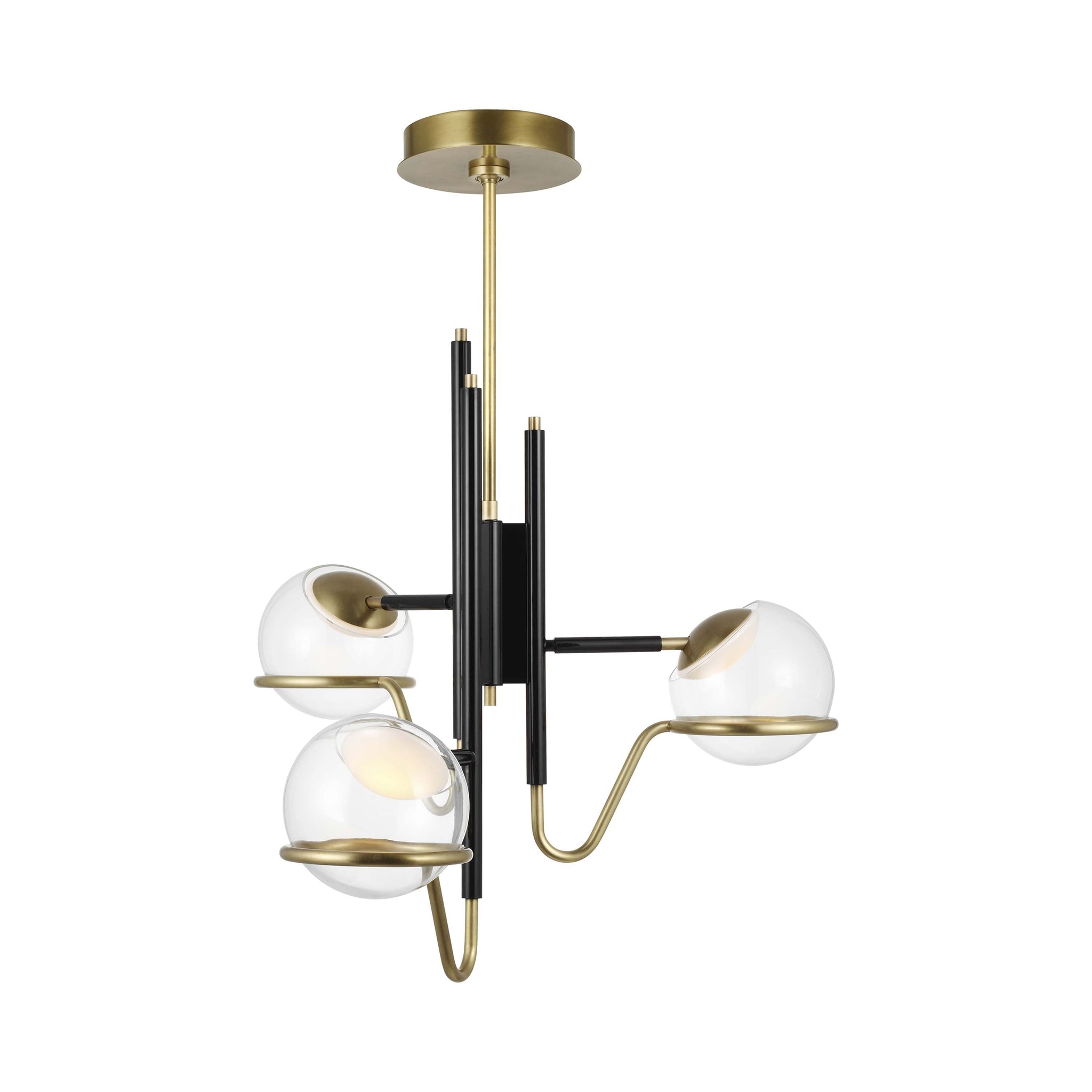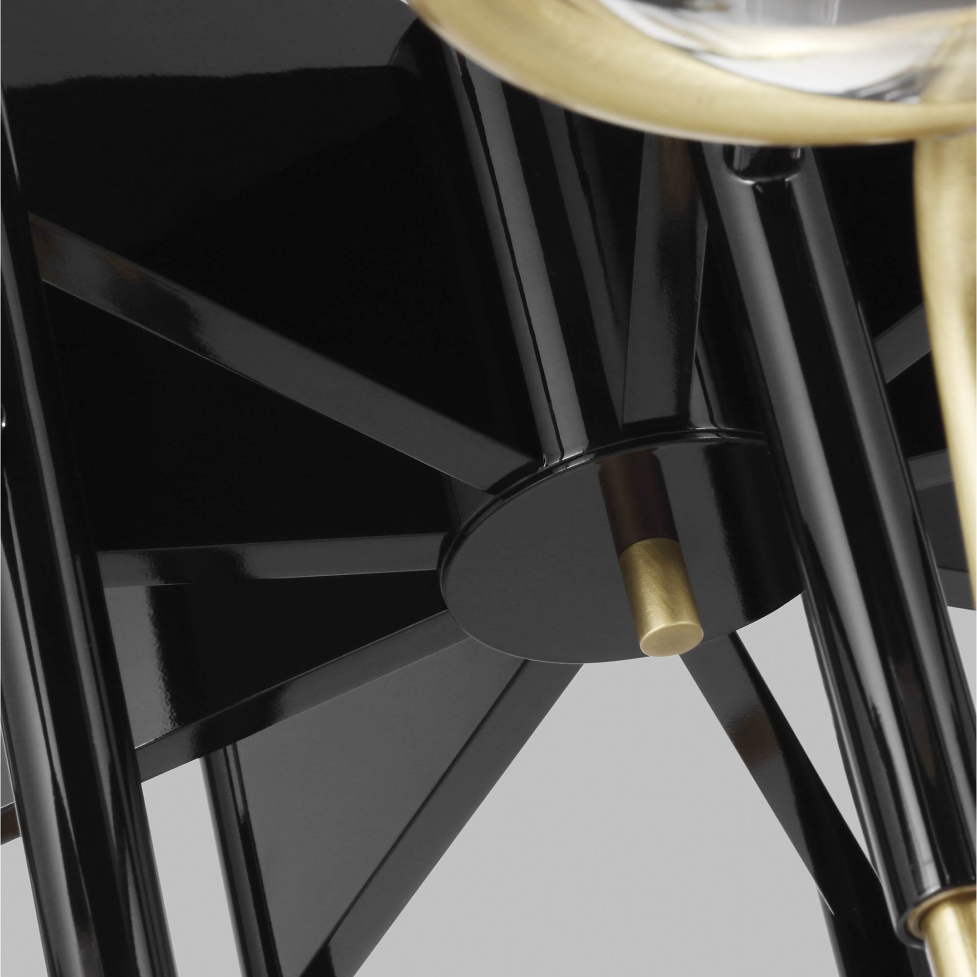 The Crosby LED Chandelier by AvroKO for Visual Comfort Modern blends the radiance of 1970's Italian flair, with a striking yet simple design. Distinctive to its musical delicacy, the glossy black metal armature yields to an elegant brass “harp” holding a glass globe dispersing light fluidly and illuminating any space with perfection.