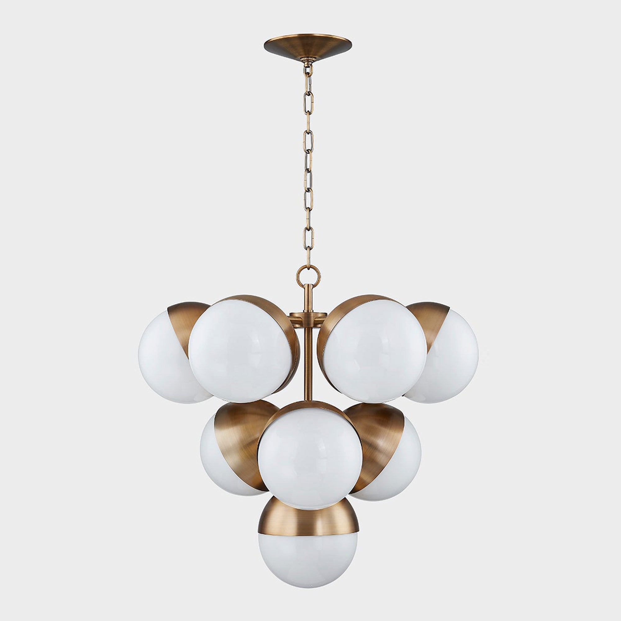 Striking dramatic influence tells a story worthy of hearing as the Cupertino Chandelier from Troy Lighting becomes a central focus wherever it's placed. Clustered globe shades resemble a grape bunch with more sophisticated materials, including gleaming patina brass finish metal holders. Make a splash to remember.