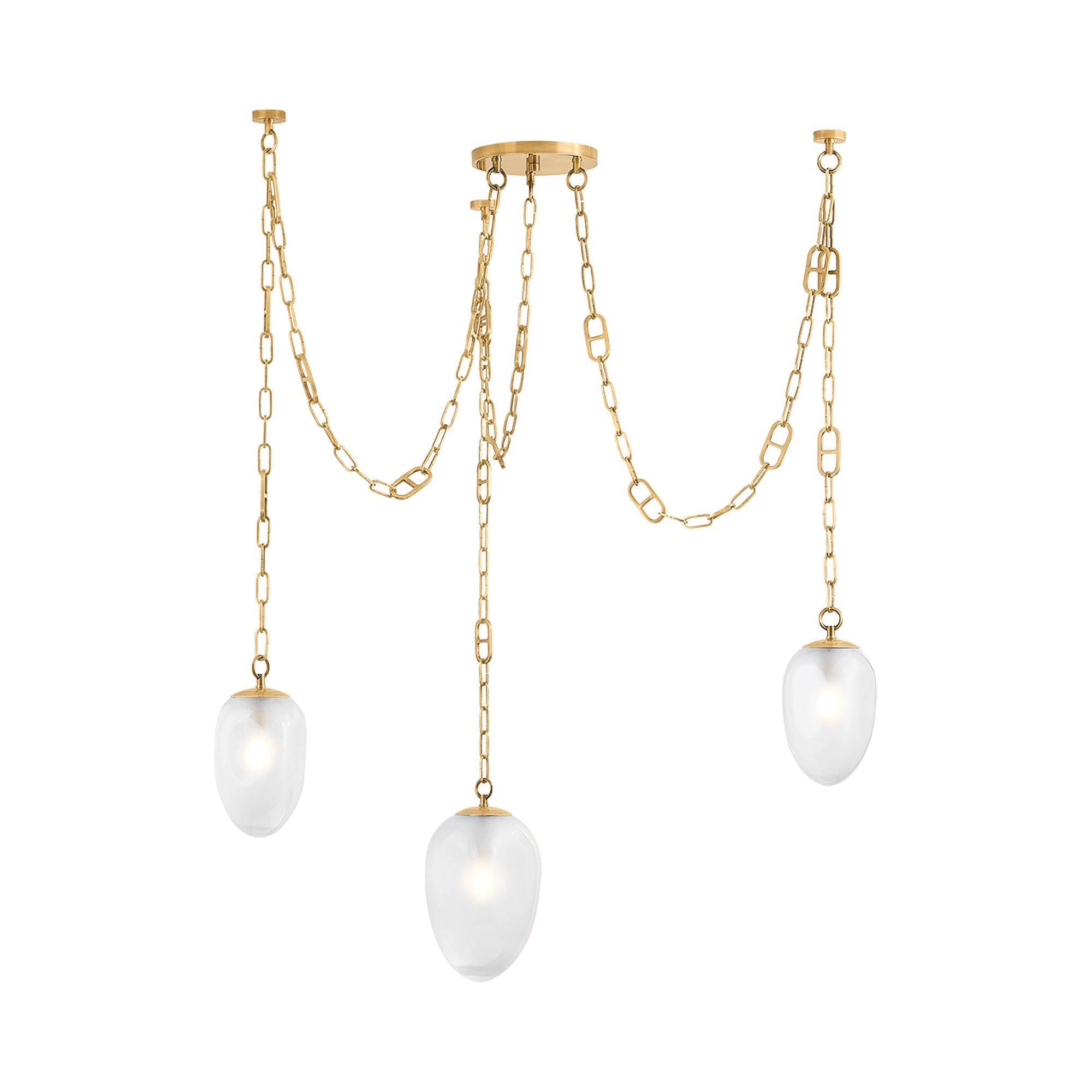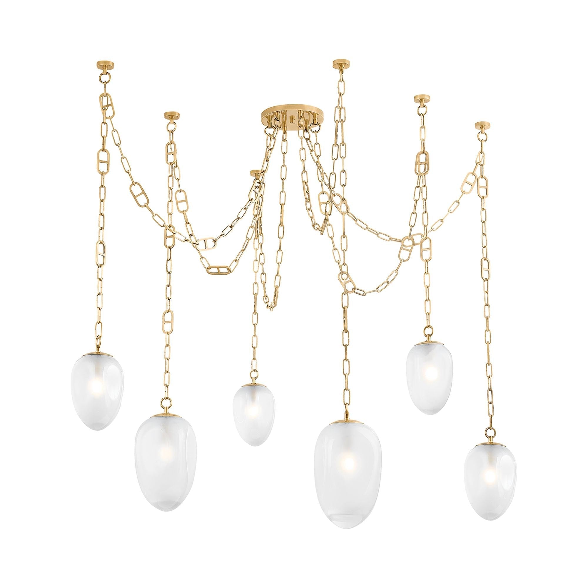 Distinctive droplets of thick, etched glass suspend from decorative mariner chains to bring graceful elegance and character to the Daith Chandelier from Corbett Lighting. A vintage brass finish creates richness and warmth, perfect for a stellar dining room or entry, creating a fresh, inviting ambiance perfect for welcoming friends and family.