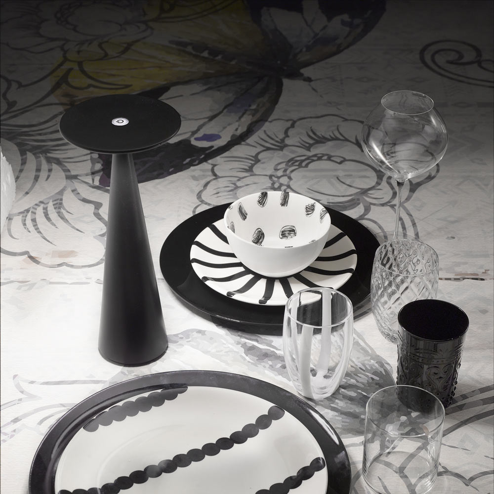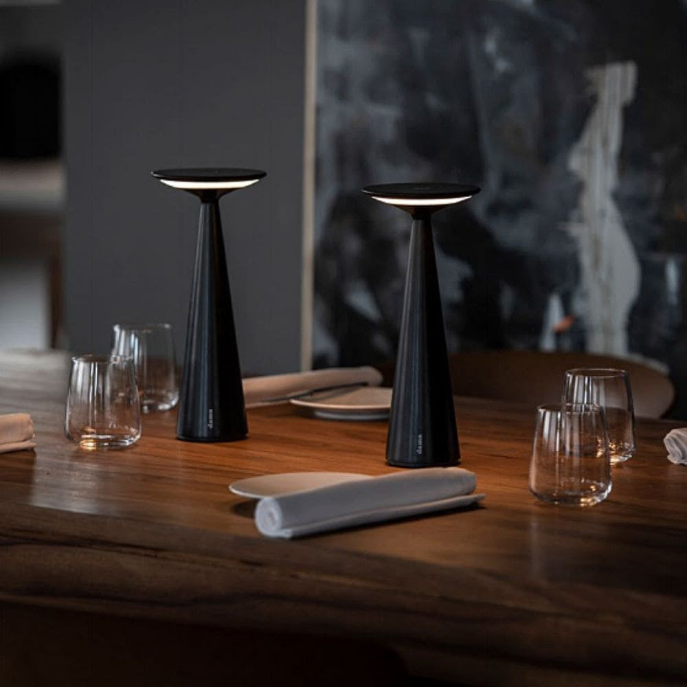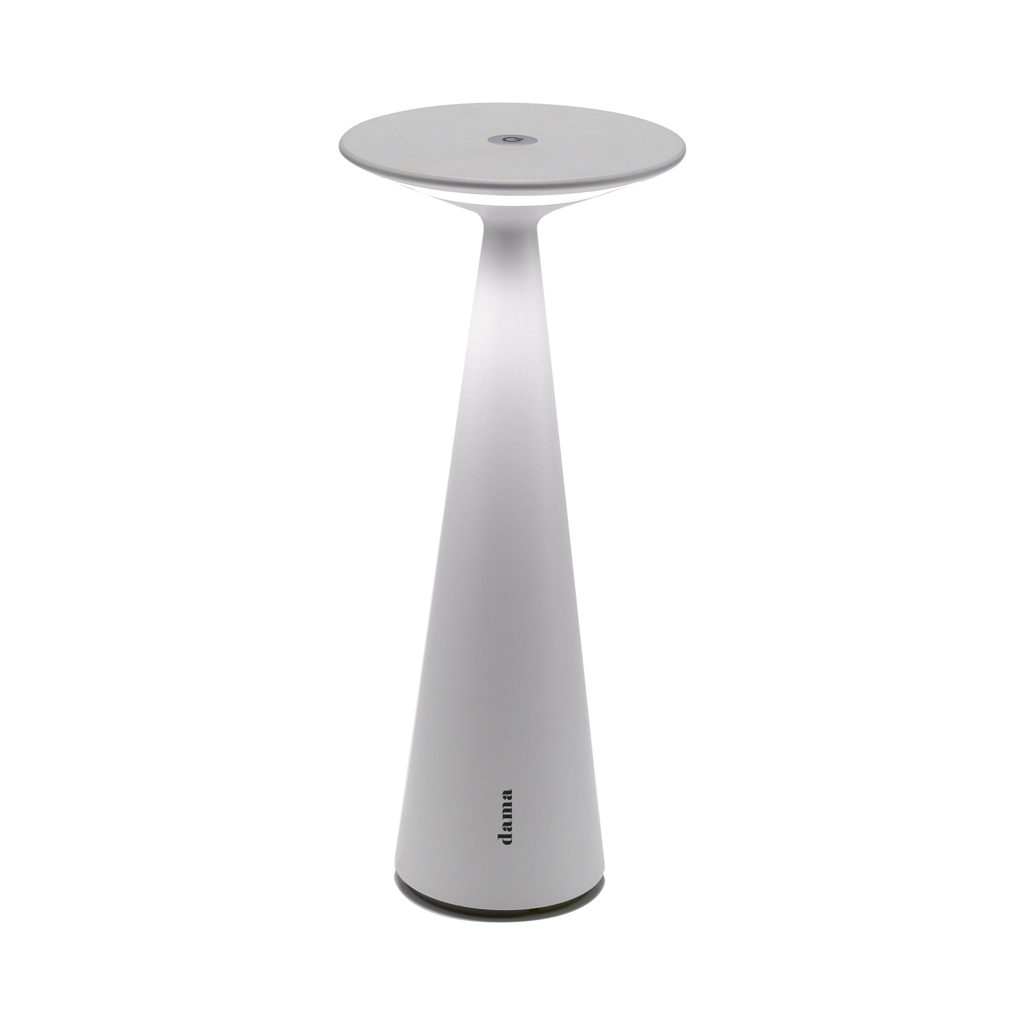 Dramatic silhouetting offsets the casual modern style endemic in the Dama LED Table Lamp from Zafferano America. A prominent mix of torchiere and conical shapes lends a contemporary boost to new-age, eco-friendly living settings, with tech features that make it worth a second look. With a die-cast aluminum body and shade, it maintains a chic design-forward look, embellished with rechargeable battery operation using a USB cable and charging cube and a built-in USB port allowing device-charging.