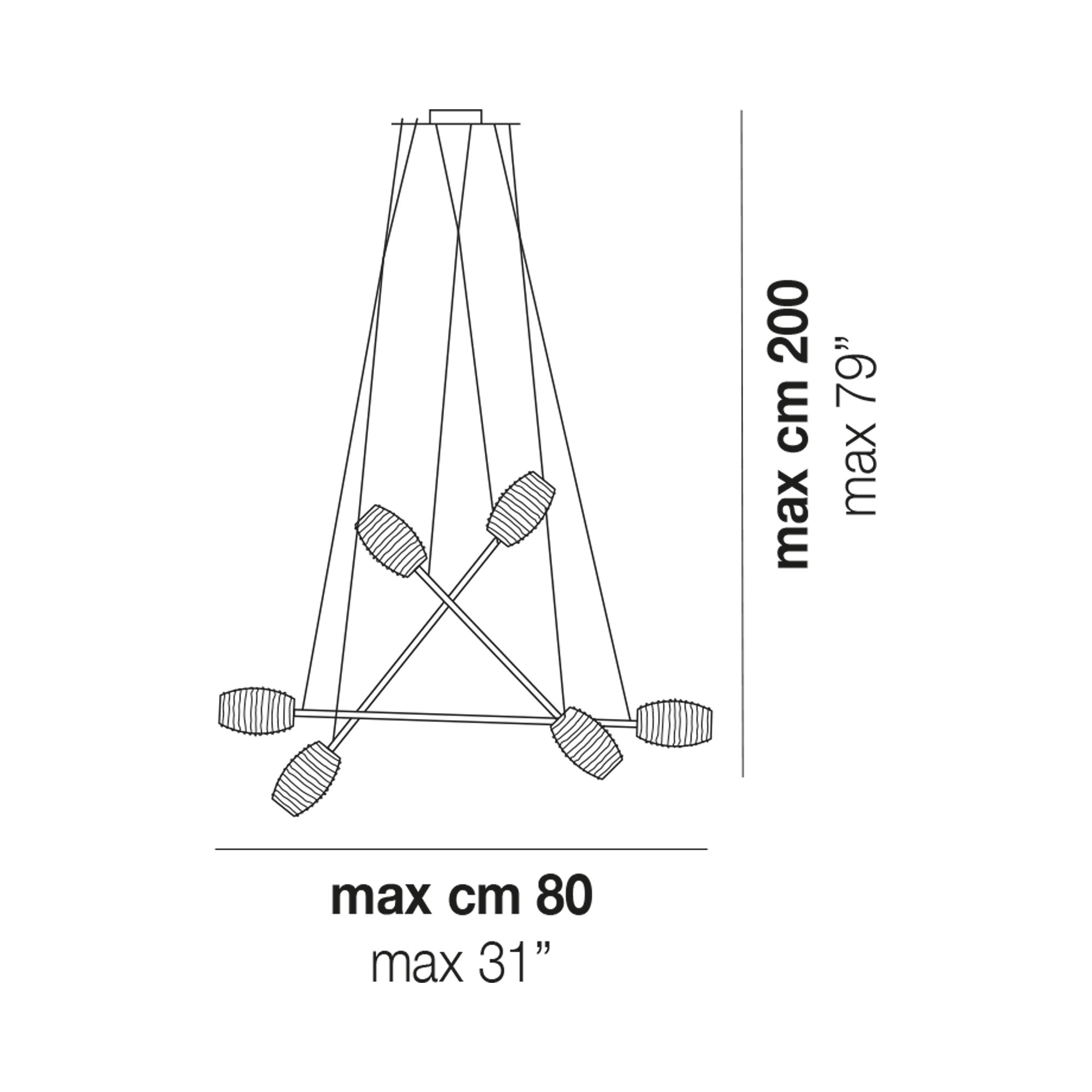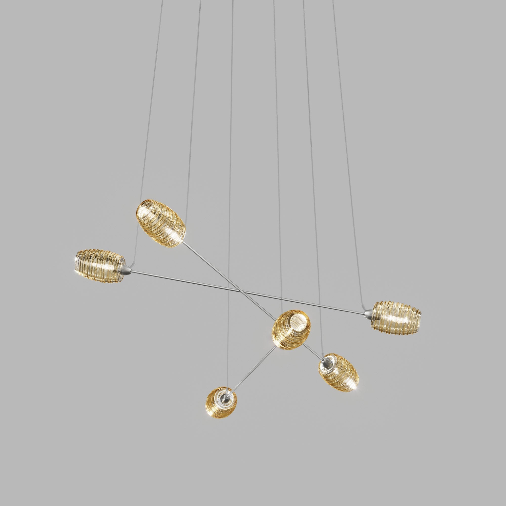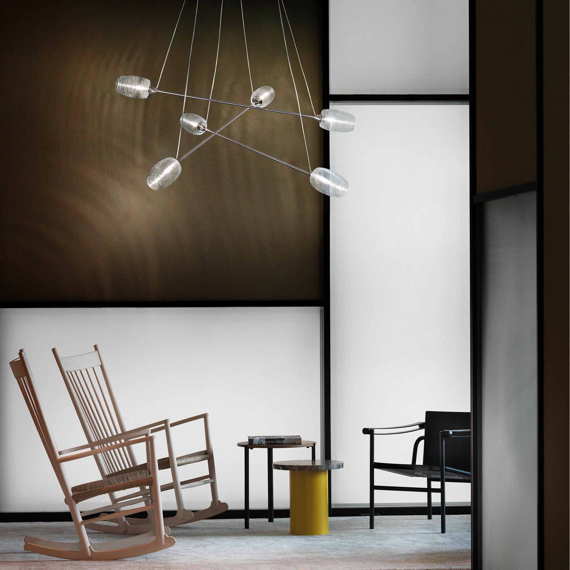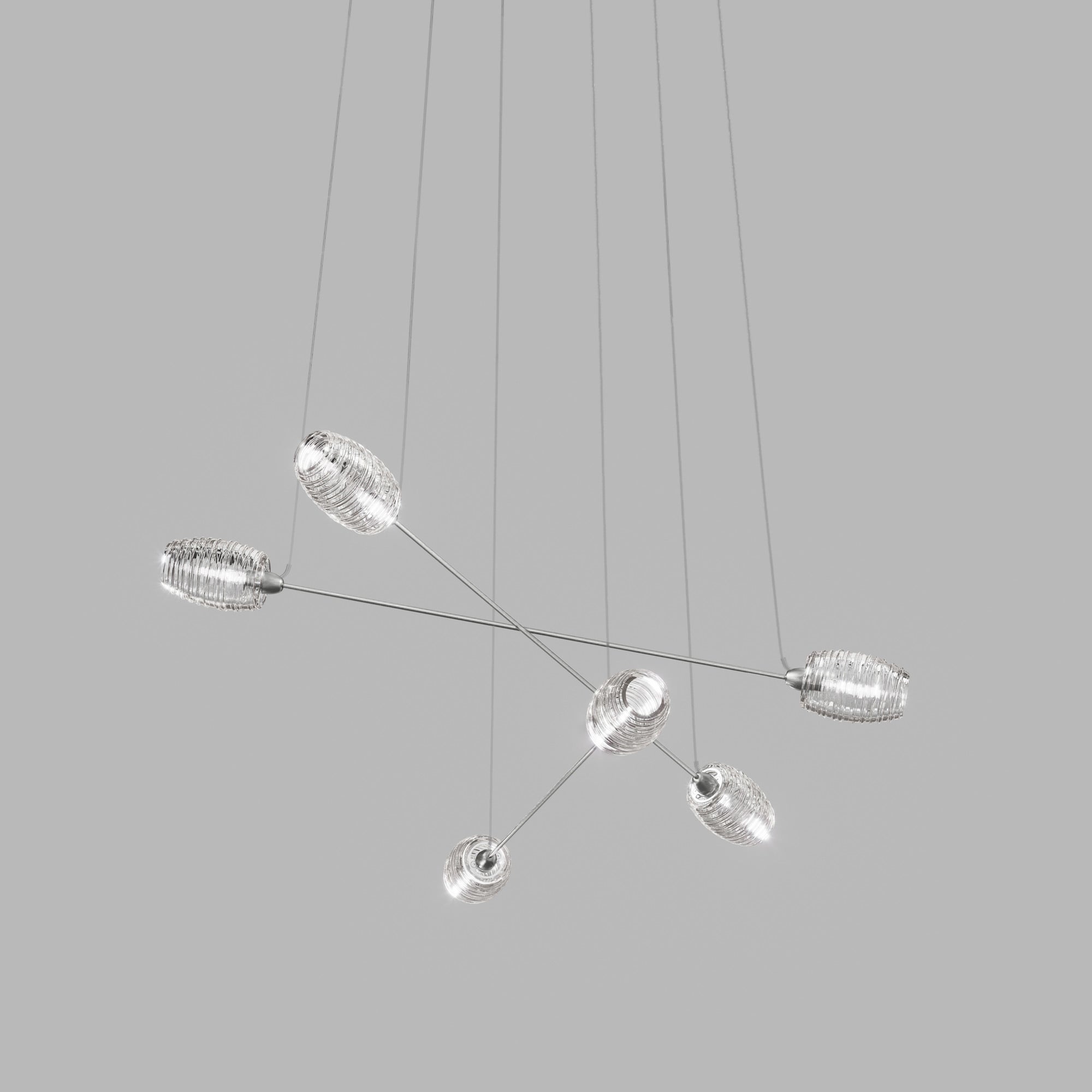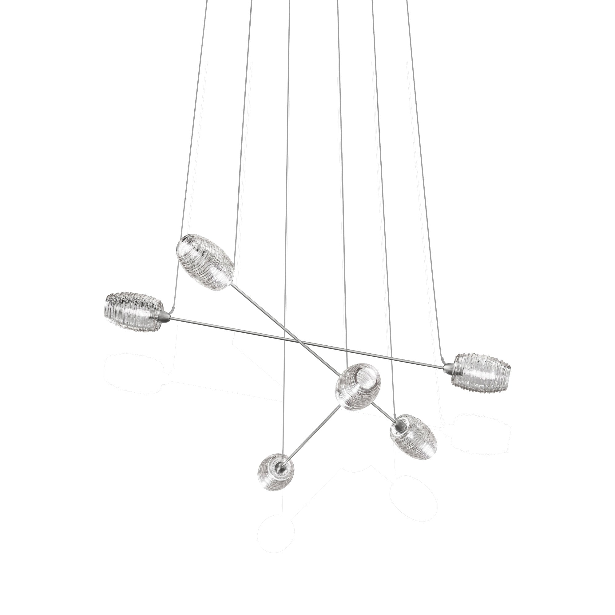 A tribute to random geometric style, the Damasco Chandelier from Vistosi offers a delightfully artistic arrangement of ribbed glass shades and a visually impacting aesthetic ideal for a modern space. Petite, slender metal bars cross to create a dynamic look, leaving a lasting impression with shade caps and cable suspension.