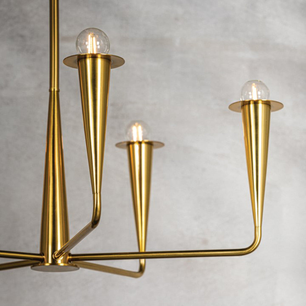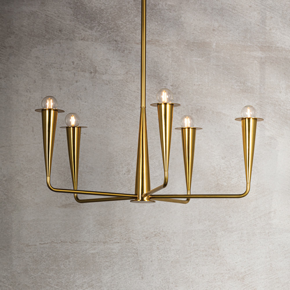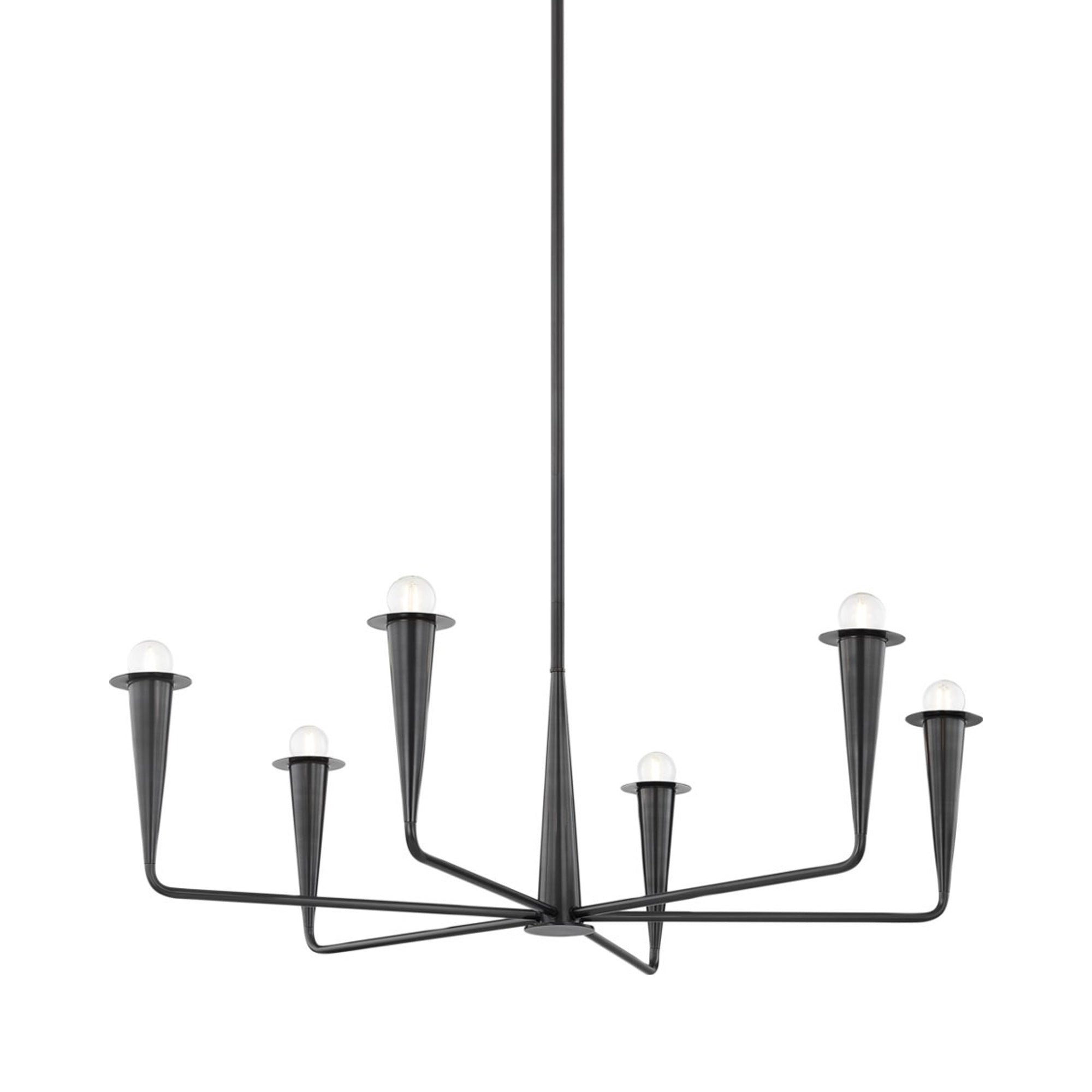 Sophisticatedly blending industrial and botanical, the Danna Chandelier from Mitzi is a delicate design with retro personality. Over a dining table it delivers a warm, rich glow, offering a chic finish and clean, flowing lines to create a spectacular silhouette. Tapering candlesticks evoke glowing torches while U-shaped arms add drama to balance the chic choice of clear glass orbs that provide inviting illumination.