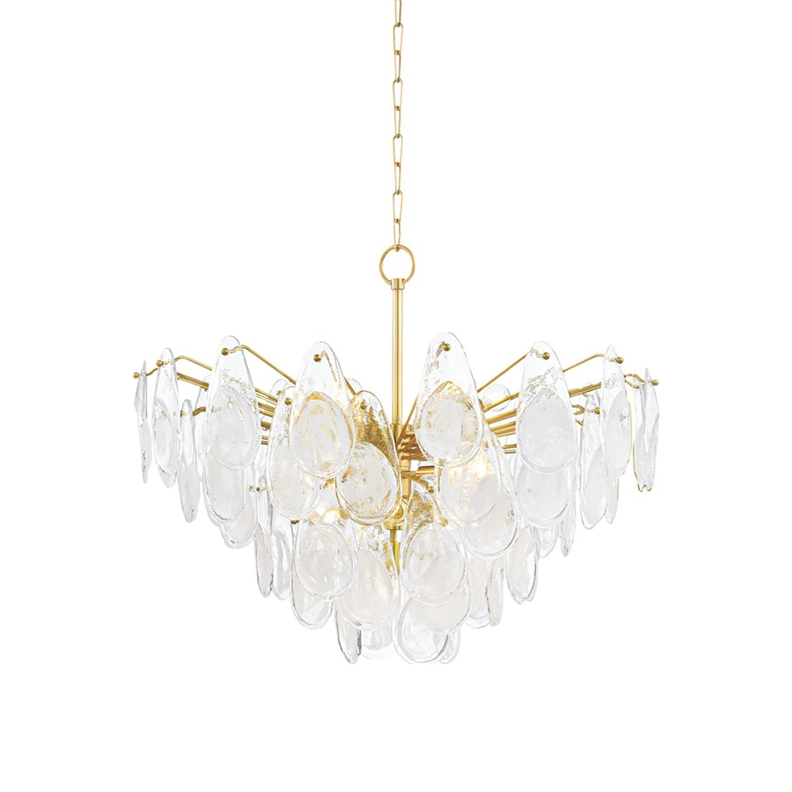 The illusion of icy elegance captures the delicate look of the Darcia Chandelier from Hudson Valley Lighting, delivering classic sophistication and gallery-inspired artisan flavor. Tapered layers of Blonchino Piastra glass teardrop shapes deliver an image of icicles, raindrops, or angel wings, depending on timely perspective. Beautifully rich aged brass framing and accents embellish an immeasurably warm quality.