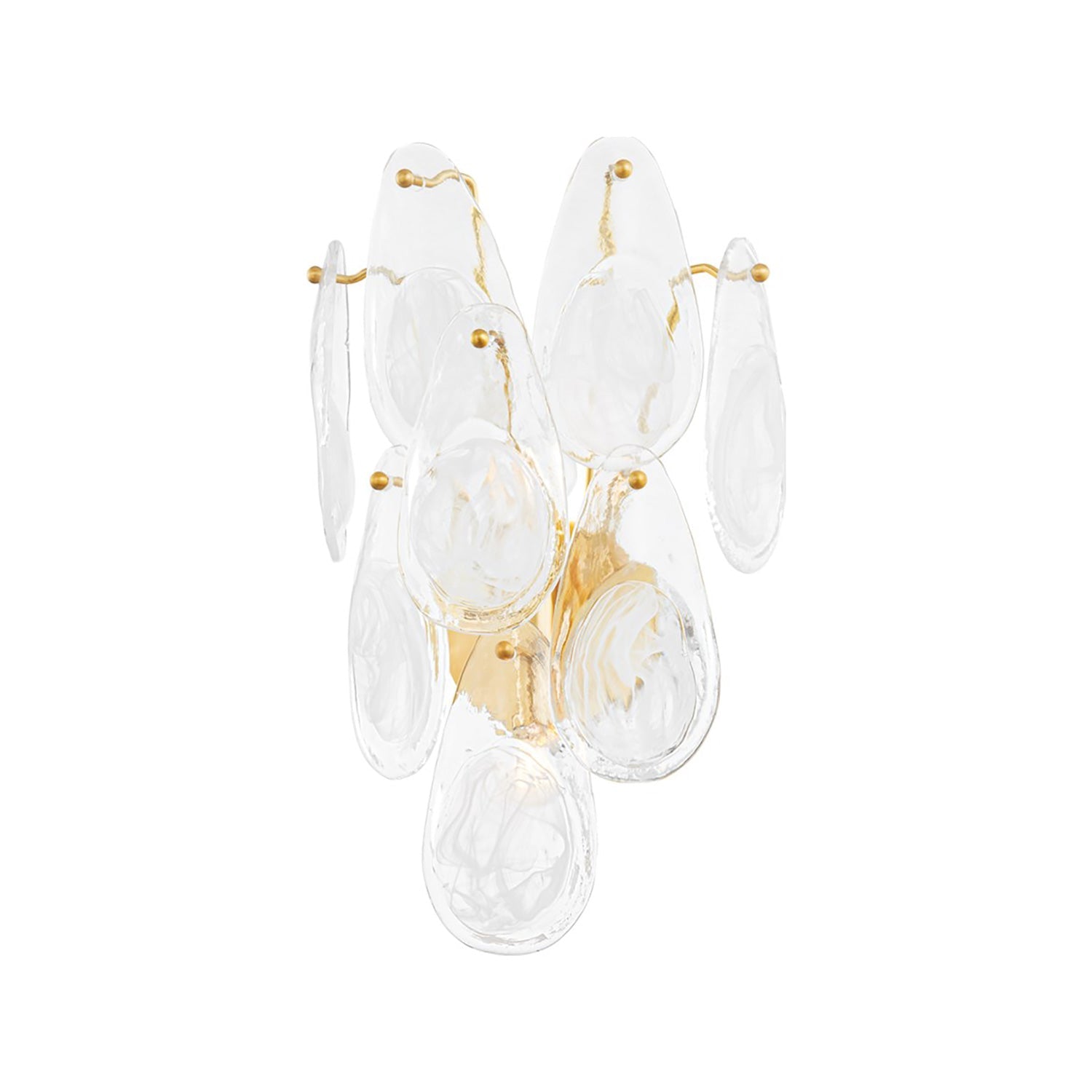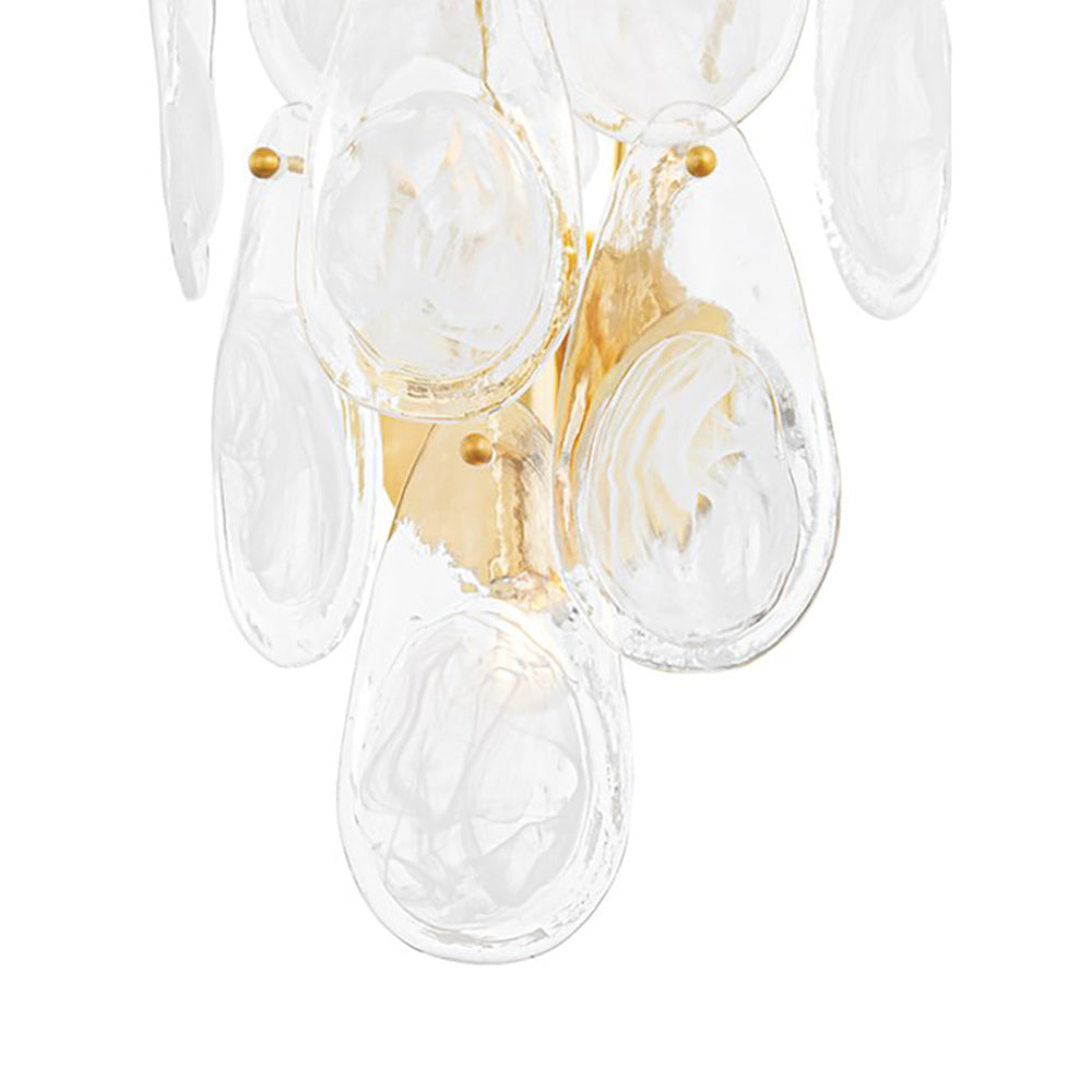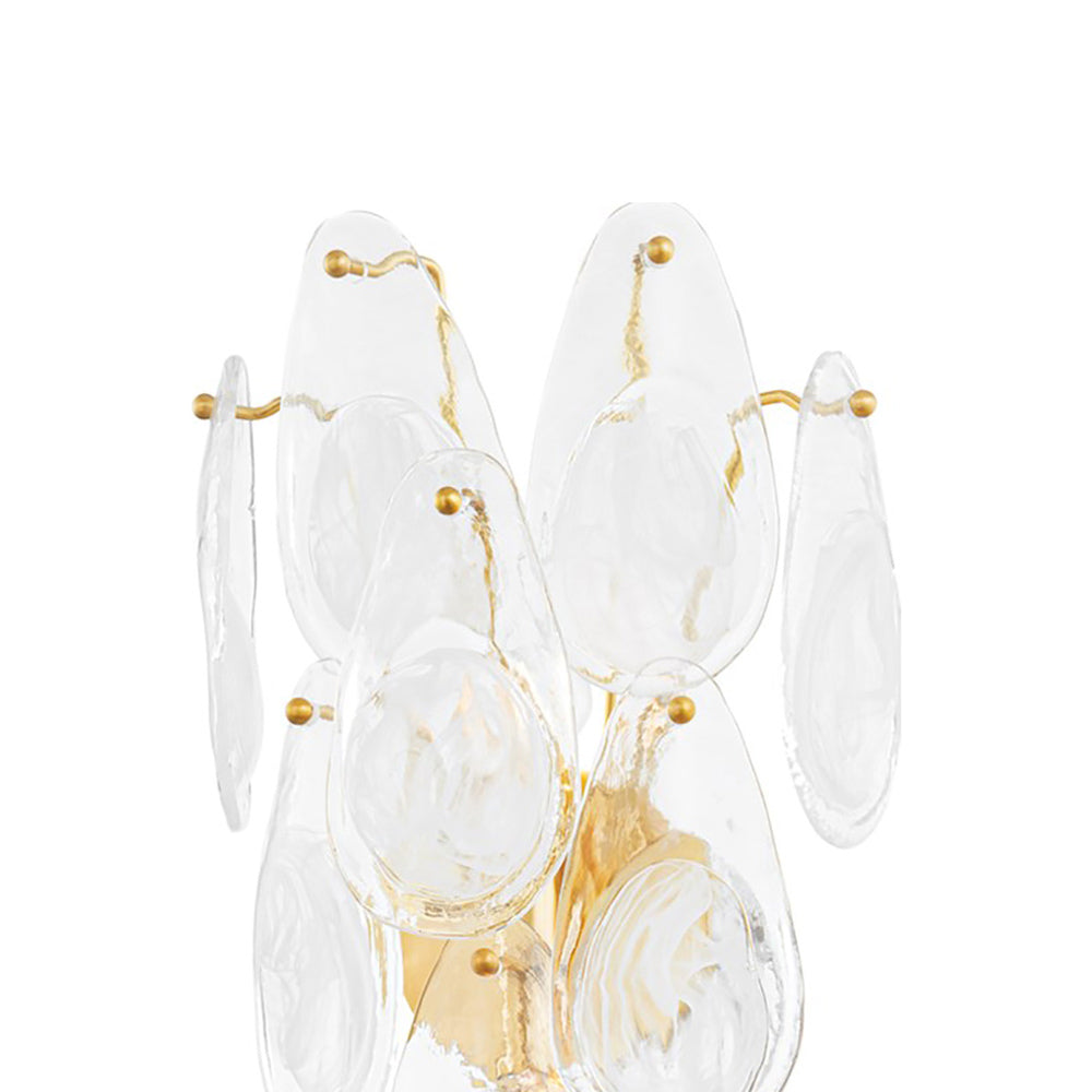 Influenced by the delicate look of teardrop-shaped ice panels, the Darcia Wall Light from Hudson Valley Lighting creates an illusory effect as it delivers soft lighting in a sophisticated upscale space. Hand-blown Blonchino Piastra glass shapes embellish radiant illumination, paired with arms and a wall plate fashioned of rich aged brass metal. Its loosely tiered silhouette invokes imagery of angel wings, shells, or ice pieces, creating a Rorschach-inspired guessing game and an unforgettable dose of sheer glam.