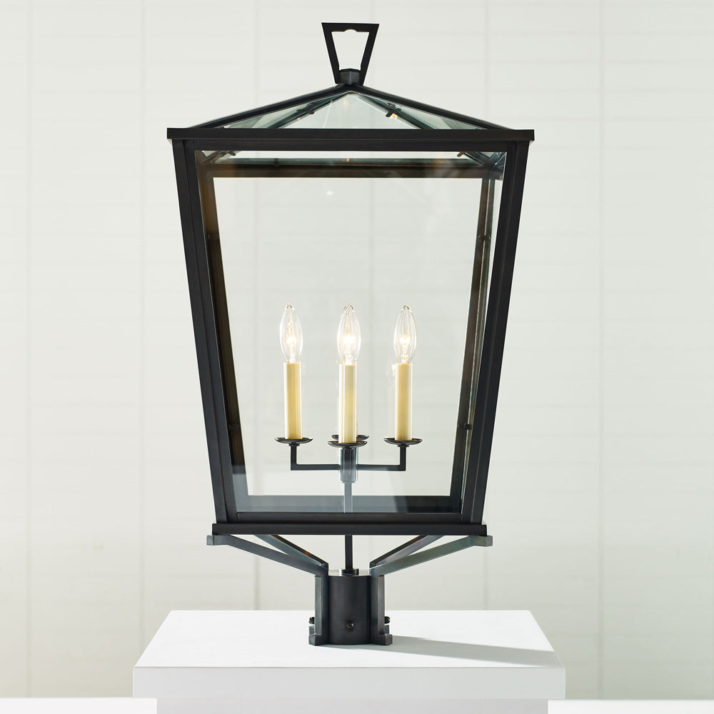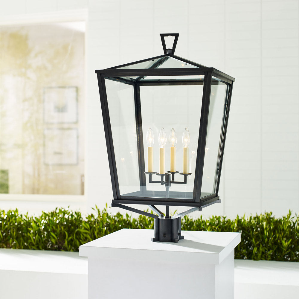 Embellish the exquisite natural beauty of a garden space or walkway with the Darlana Outdoor Post Light from Visual Comfort Signature. A lantern design offers iconic, legendary ambiance to a light fashioned of metal with clear glass panels. Petite candelabra bases soften and dramatize the storied traditional look of this outdoor fixture.