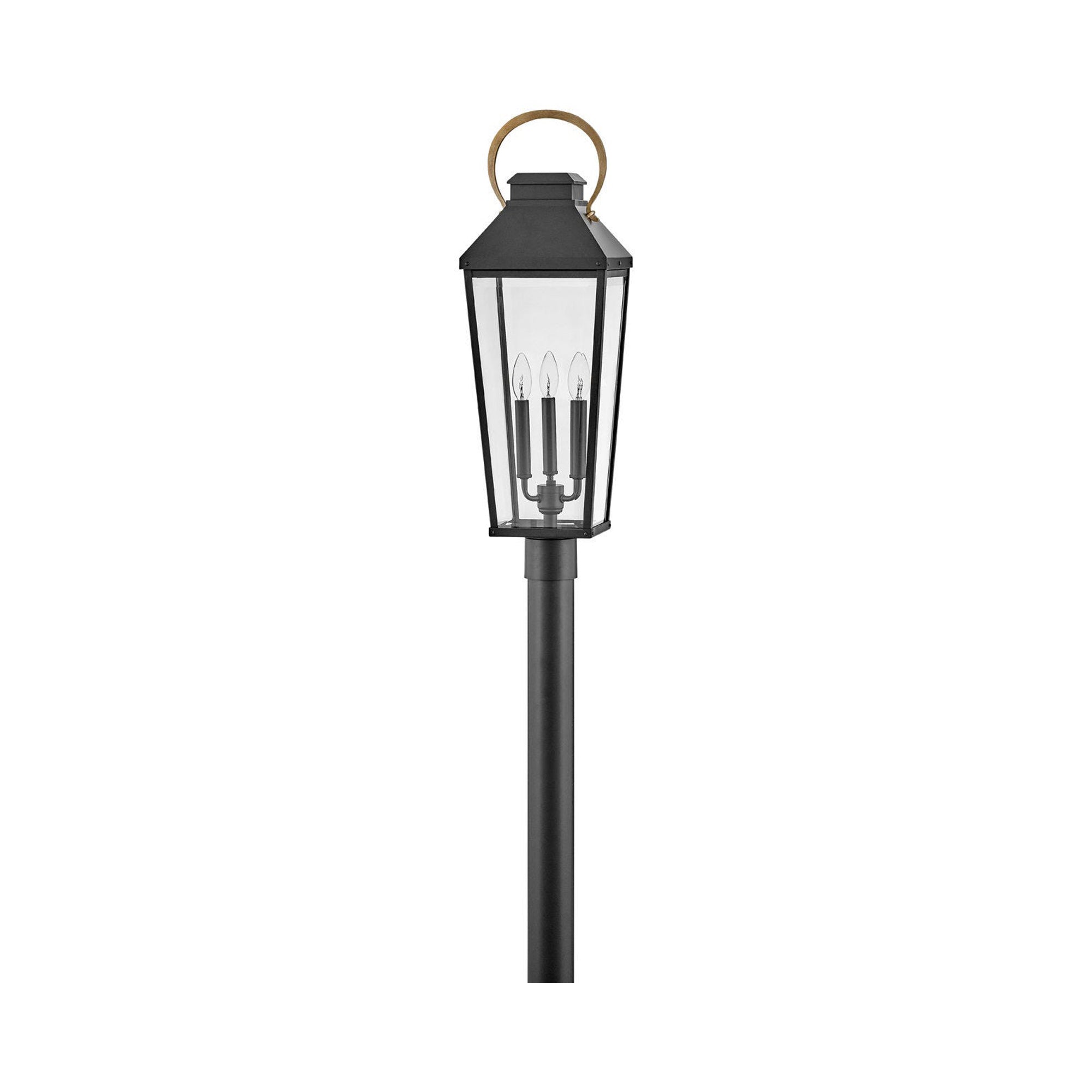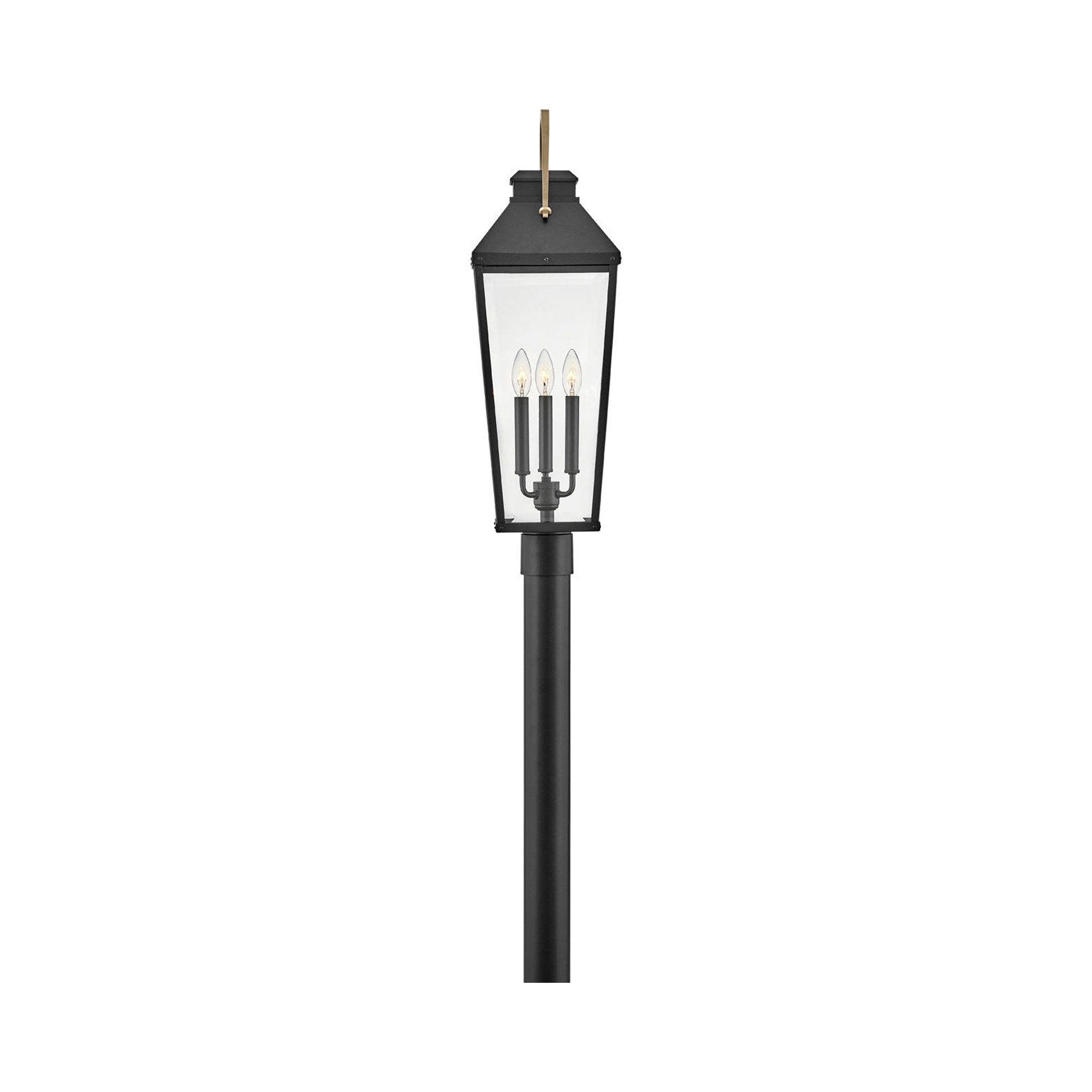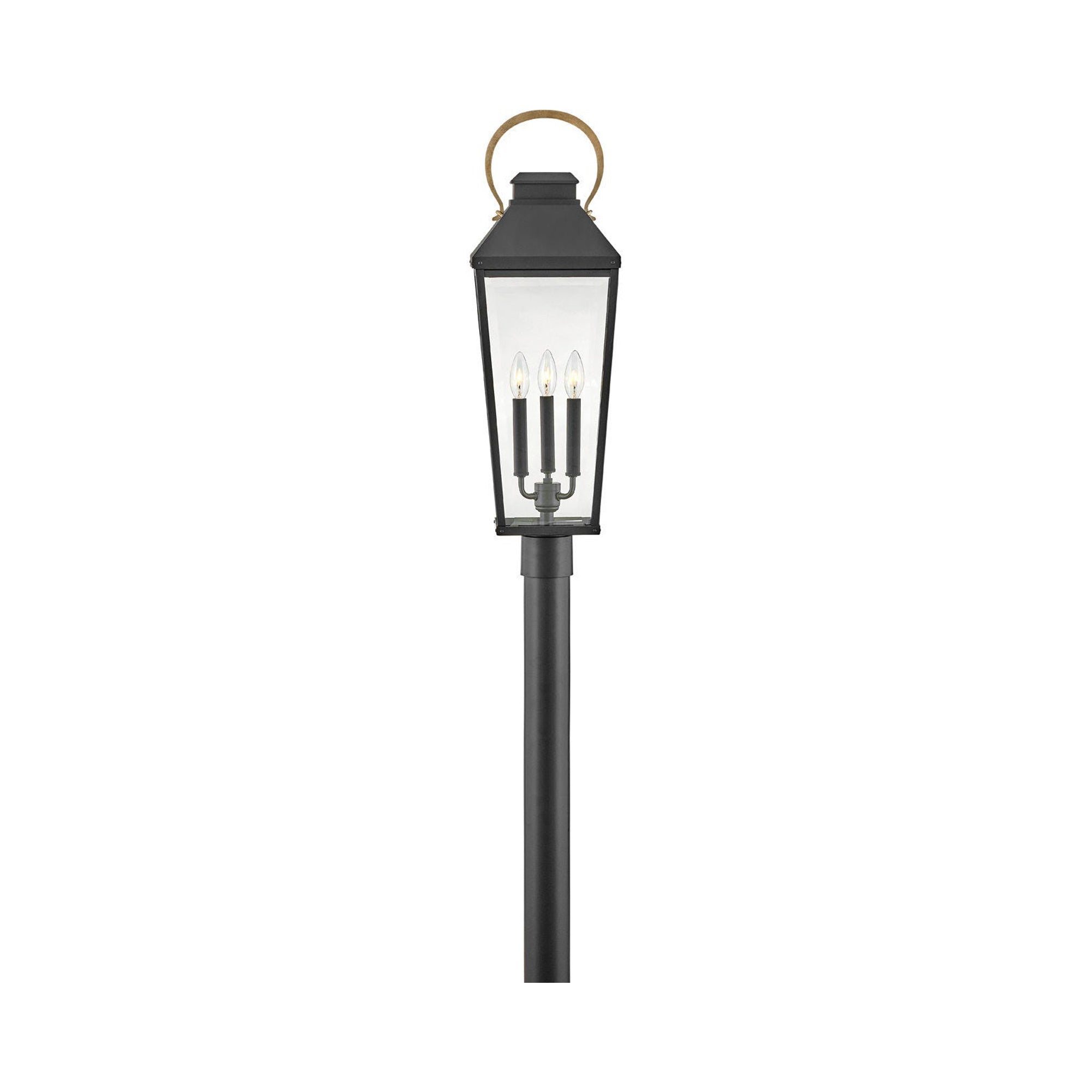 Introduce timeless elegance to a pathway or garden with the enchanting lantern silhouette of the Dawson Outdoor Post Light from Hinkley. Its elongated design is defined with a structured look and black finish paired with tapering glass panes and an eye-catching burnished bronze arch handle that brings a modern touch of style to your exterior.