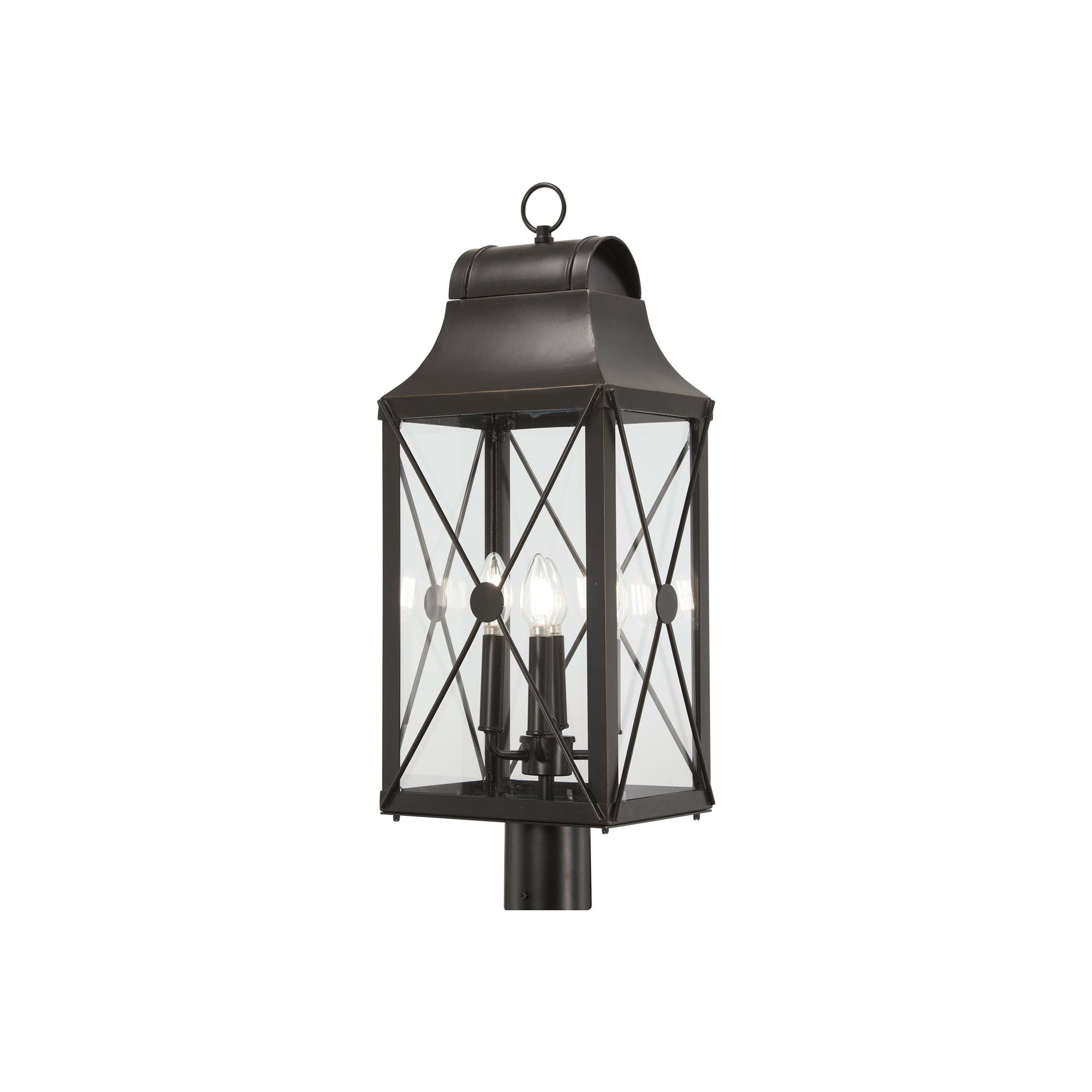 The De Luz Outdoor Post Light from The Great Outdoors offers a heady oil rubbed bronze finish over metal construction and a lantern-inspired design updated with decadence. This post light is an exceptional addition to gardens, walkways, and manicured yards, adding whimsical elements to spice up a decorative flavor. Gold frame highlights and clear glass panels form a busy configuration with plenty of personality.