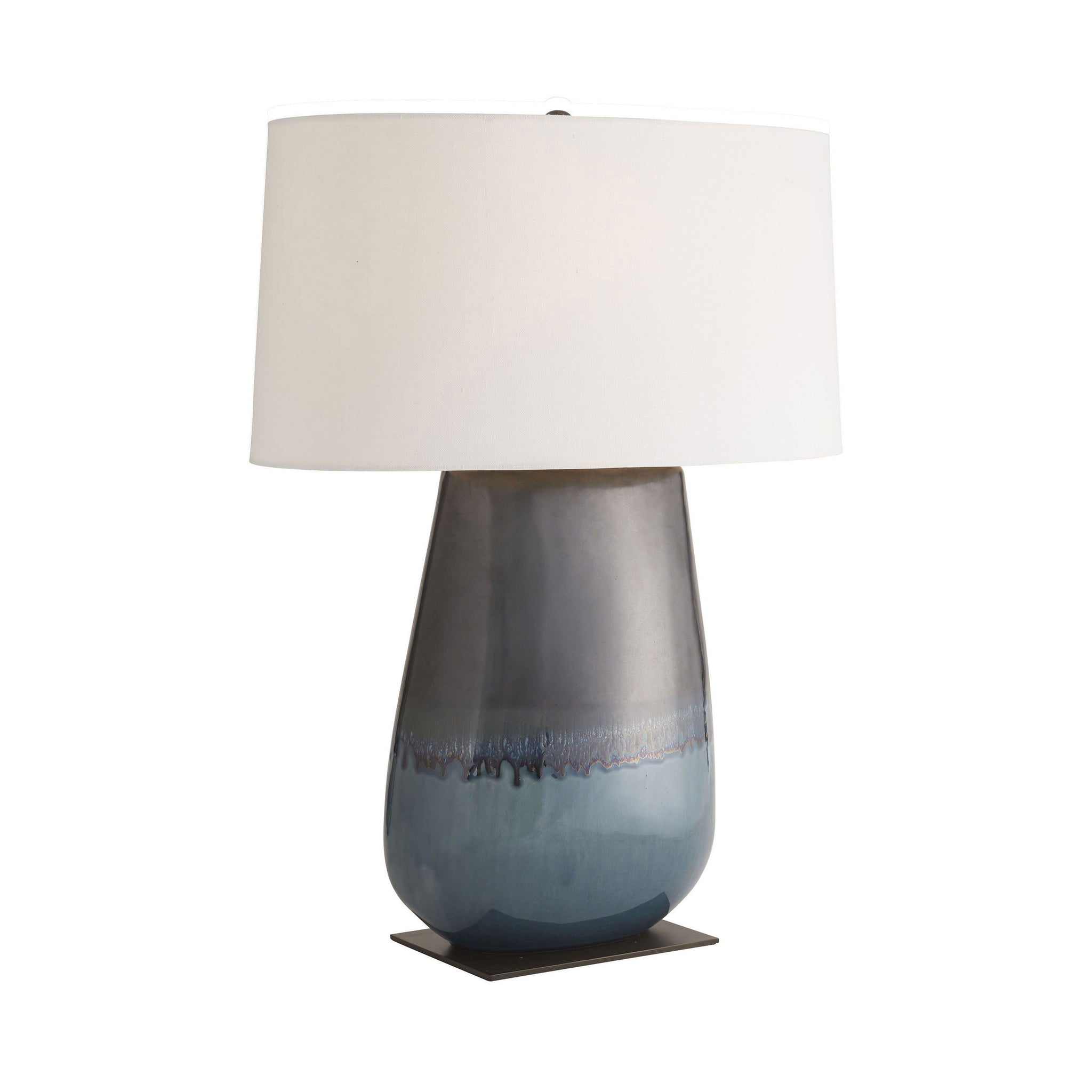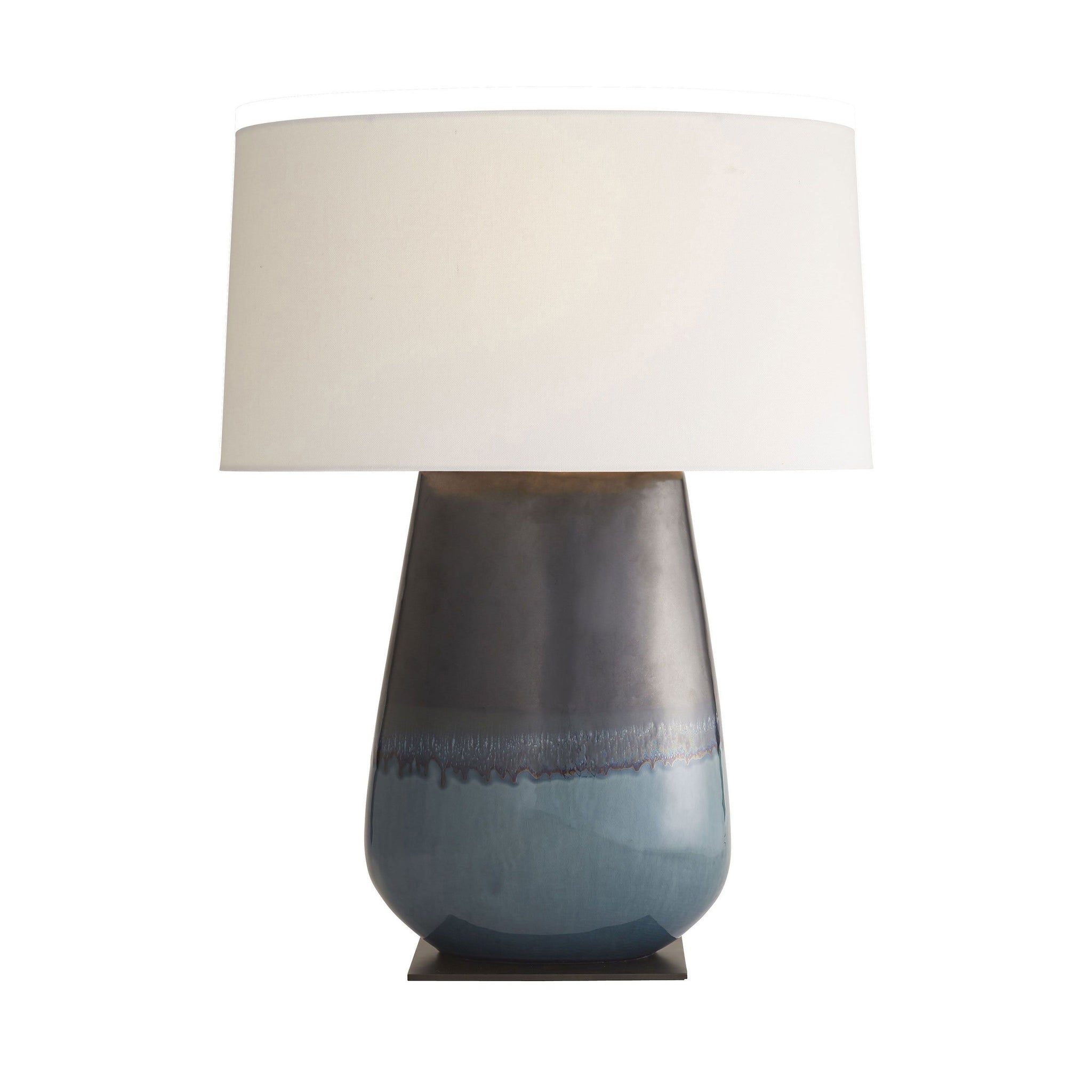 Showcasing a simple ceramic form on a bronze steel plate the reaction of glazes is the real scene-stealer here. A gunmetal reactive glaze tops this piece before beautifully bleeding into a teal reactive glaze bottom leaving no two alike. A sea of grayish to greenish to blueish centers this piece drawing the eye with its unique and varying hues—tones that are further enhanced when illuminated. Topped with a white linen drum shade with white cotton lining. Finish may vary.