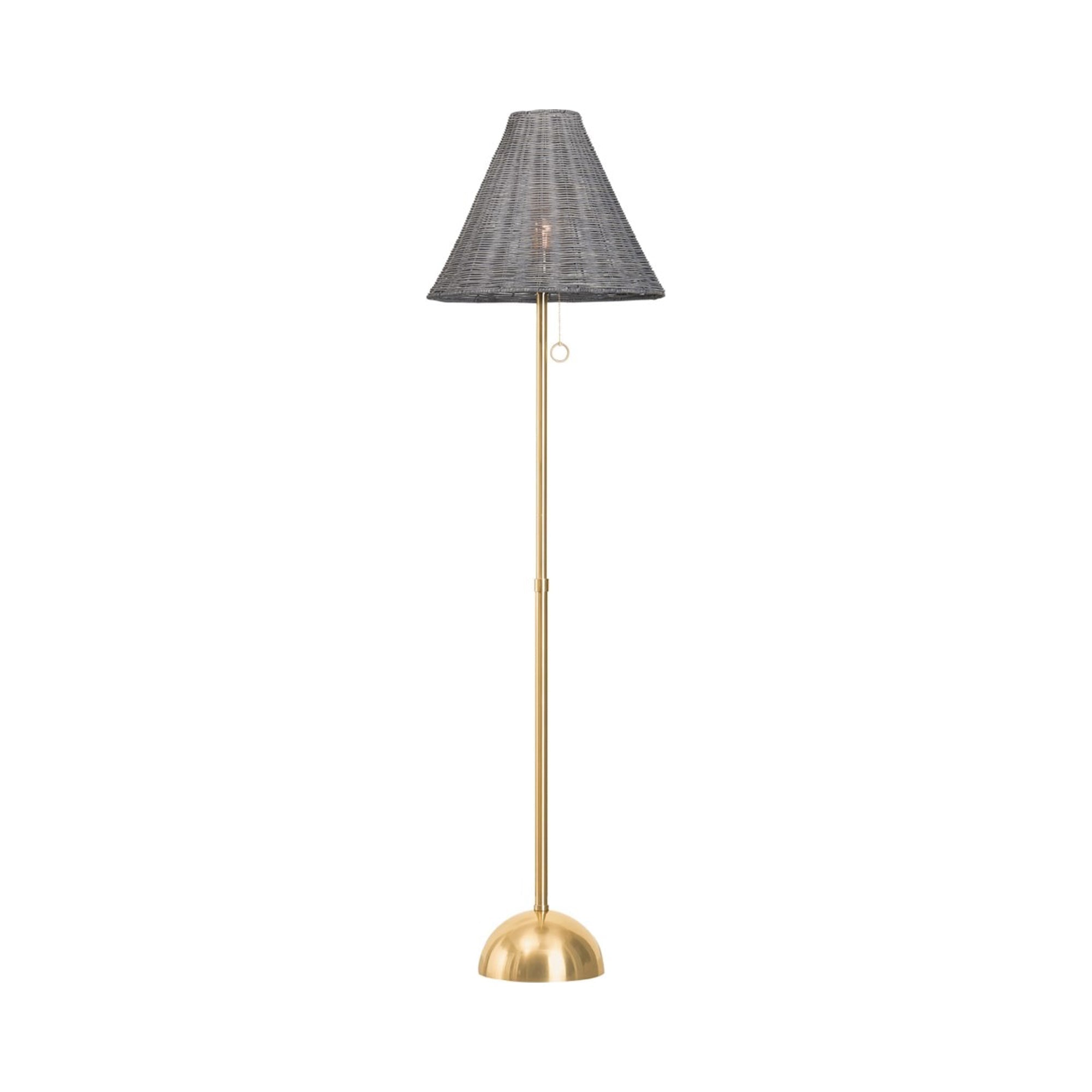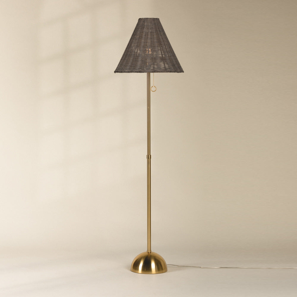 Balance and harmony infuse elegance in the modern coastal design of the Destiny Floor Lamp from Mitzi. A classic conical shade is crafted of natural wicker in a cool gray finish that contrasts perfectly against a rich, warm aged brass finish stem and domed base. A single pull chain is augmented with a ring, adding modernist allure in a den or bedroom.