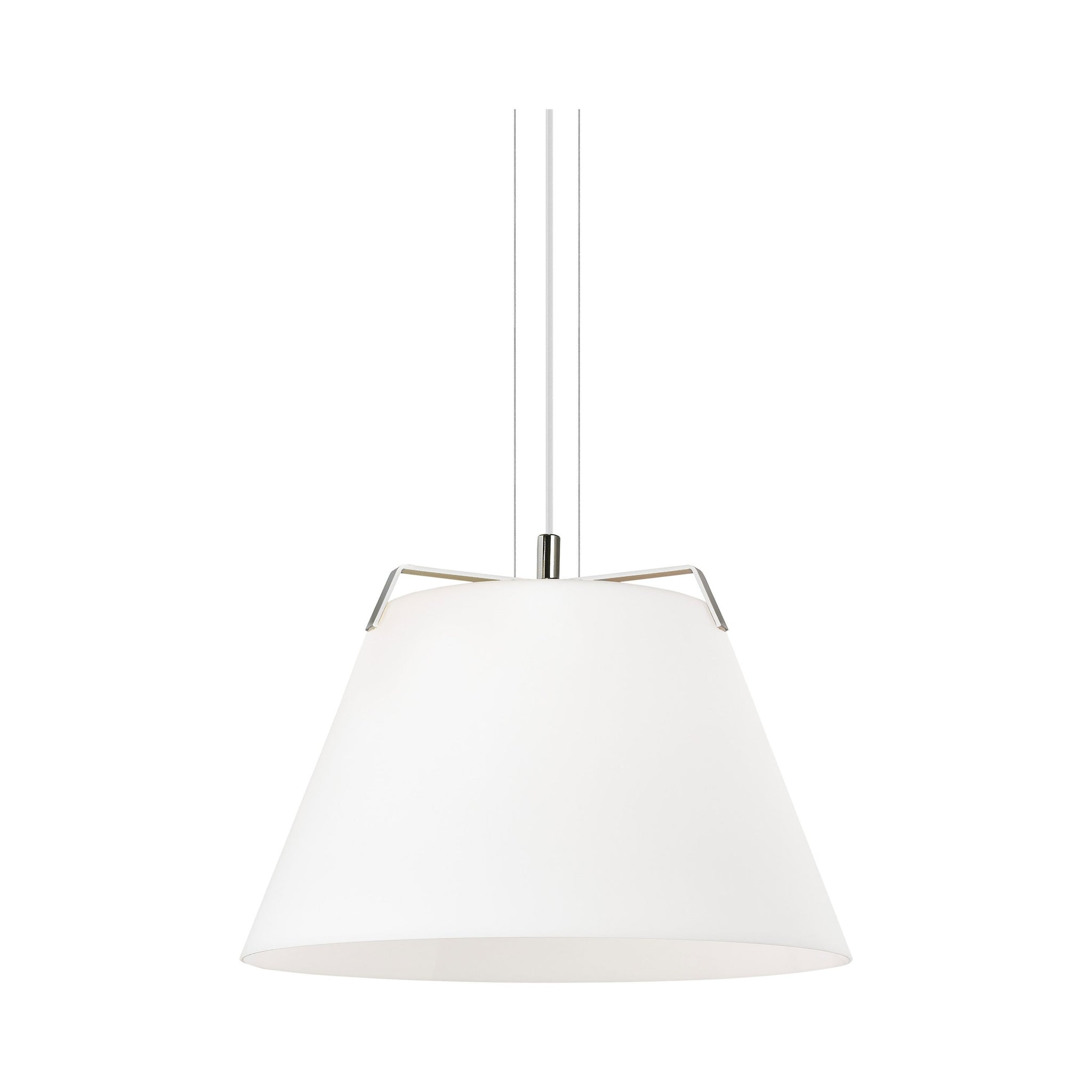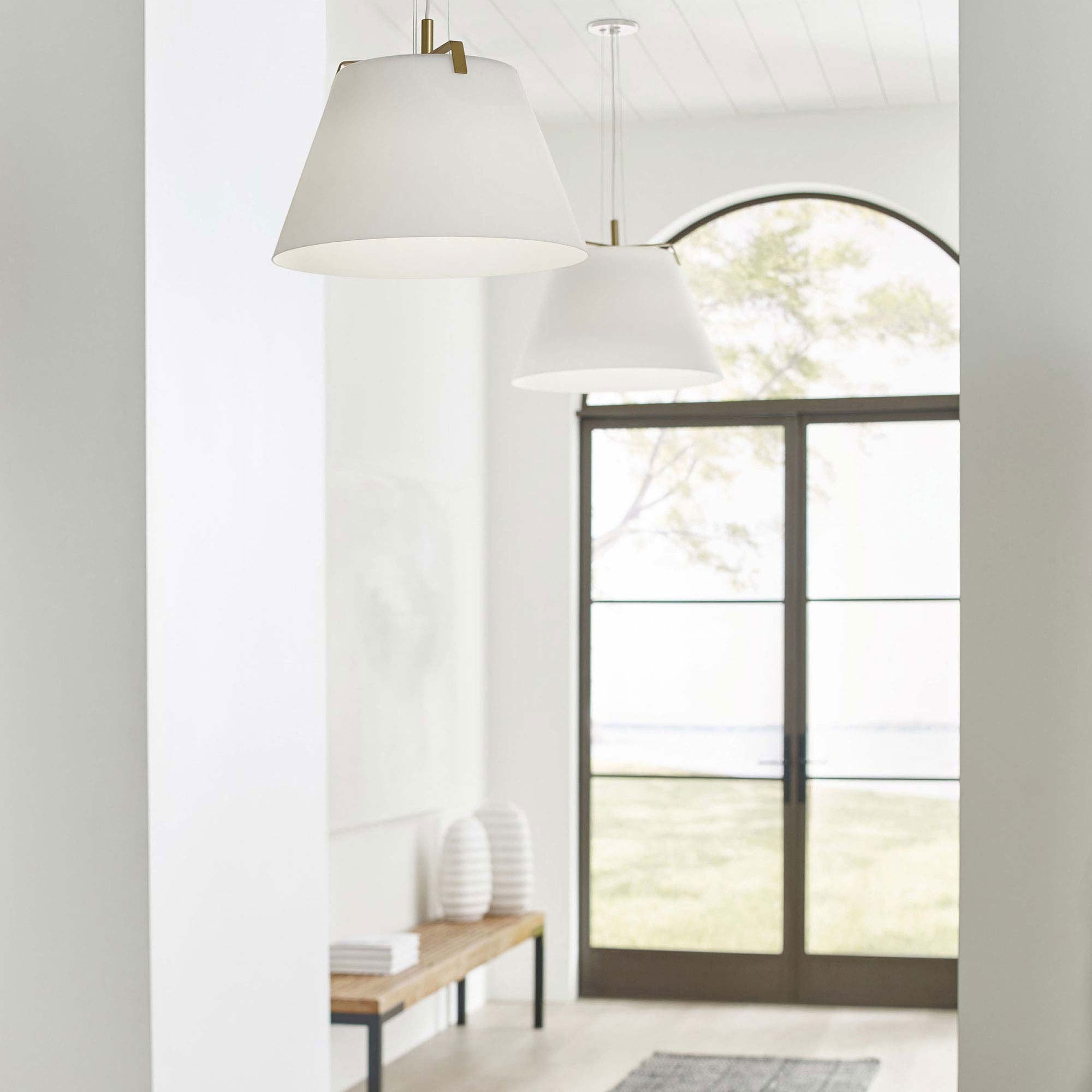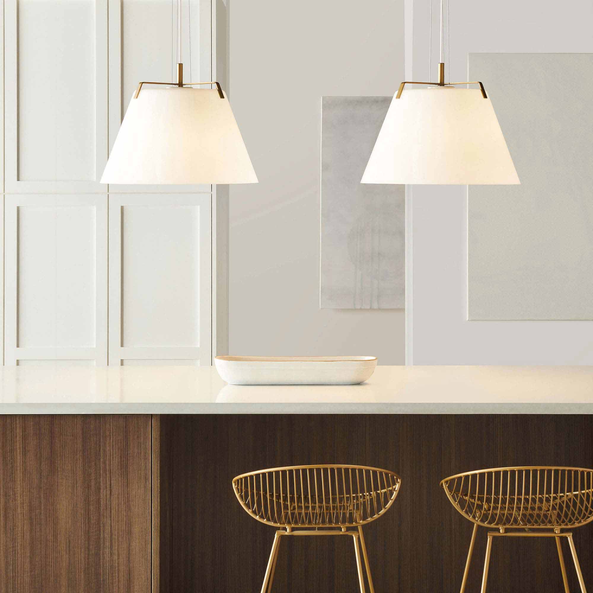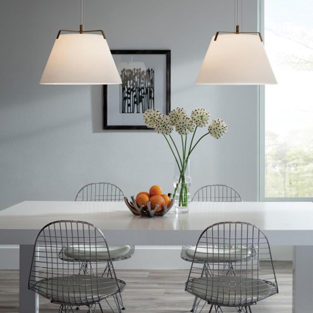 The Devin Pendant from Visual Comfort Modern is an unexpected twist on the classic table lamp silhouette with its clean modern design style. This sophisticated pendant is hand-blown and then finely tailored with either polished nickel or satin gold. A frosted glass shade diffuses the lamping inside. Available lamping options include energy efficient LED or no-lamp, leaving you the option to light this fixture with your preferred lamping. At 5 feet in height this versatile contemporary pendant is a great choice for dining room lighting, living room lighting or family room lighting applications.