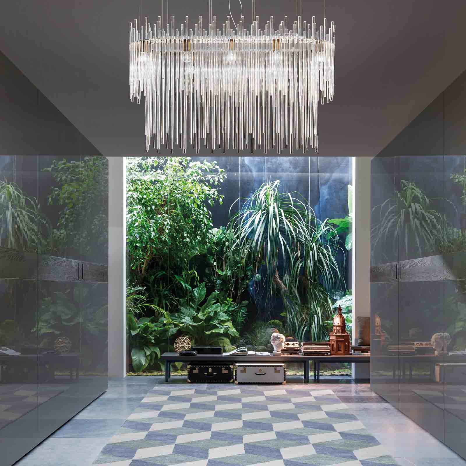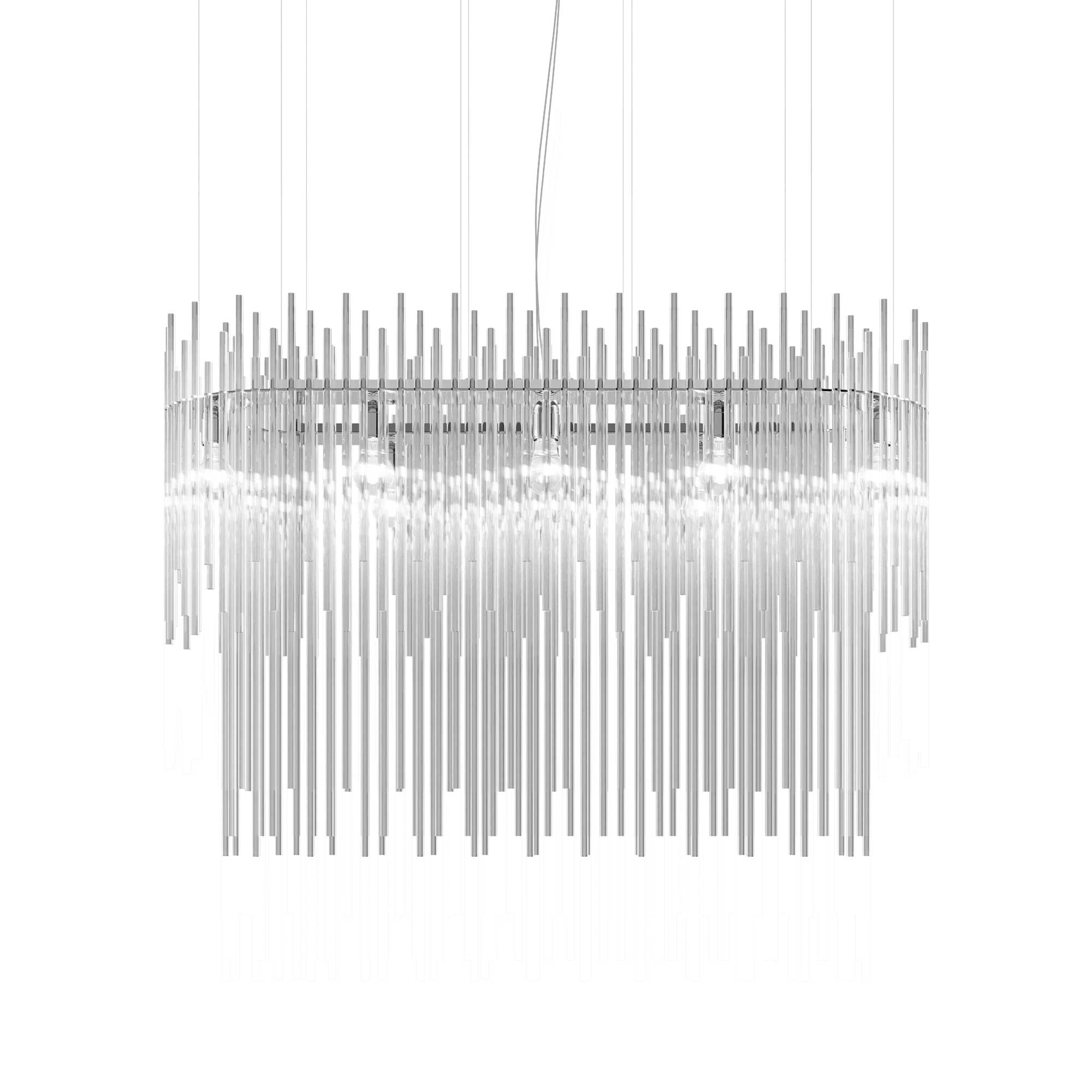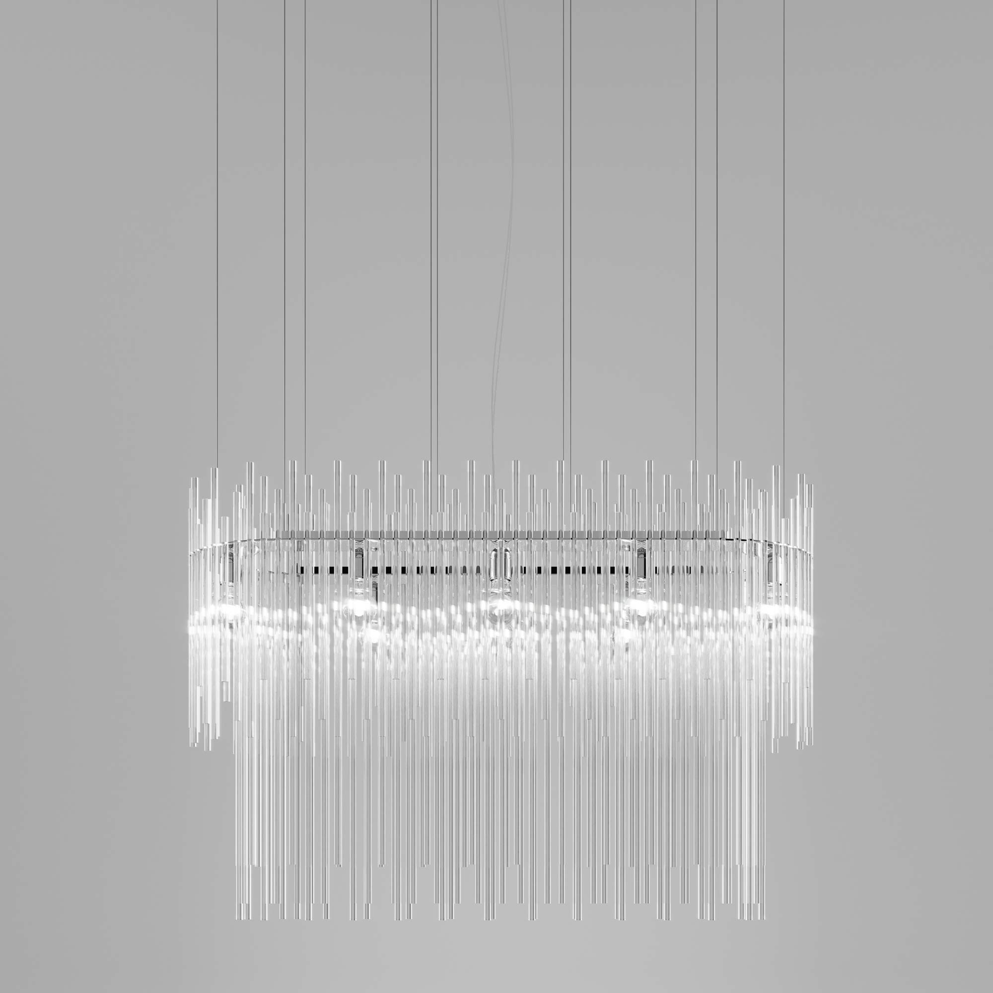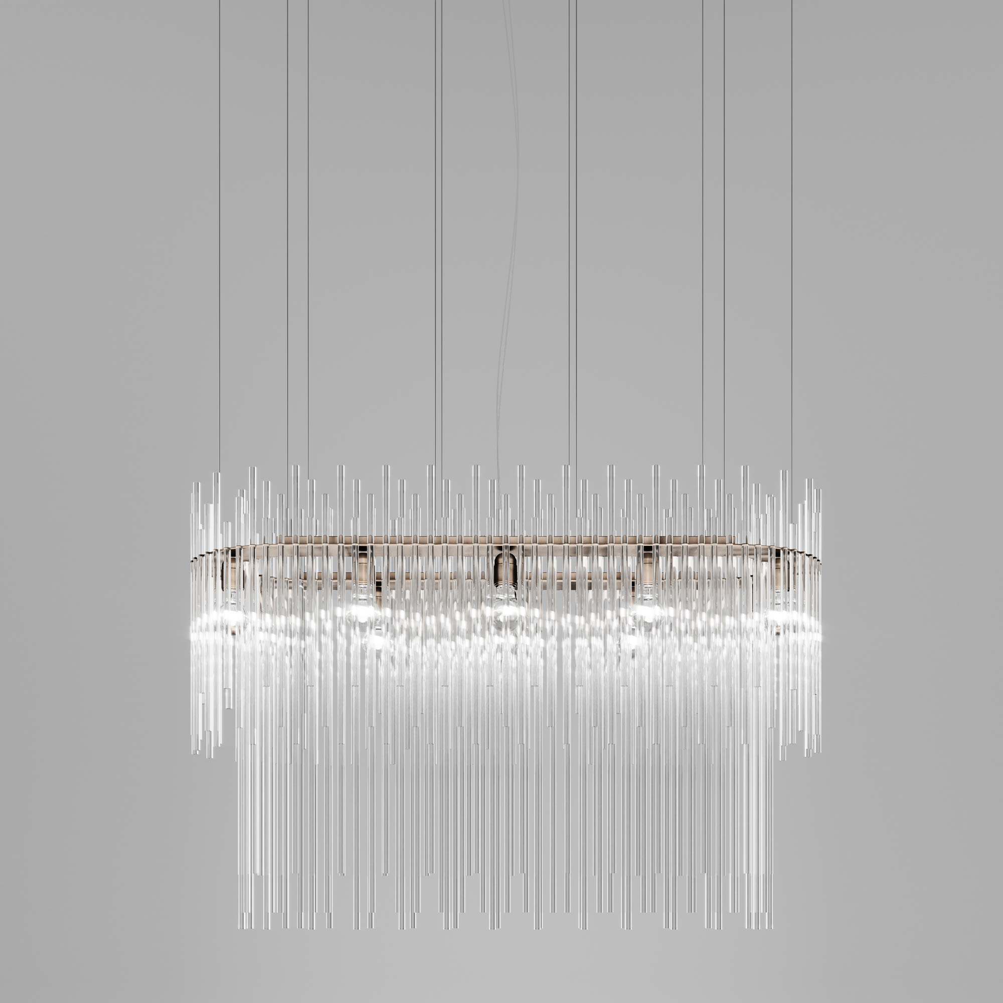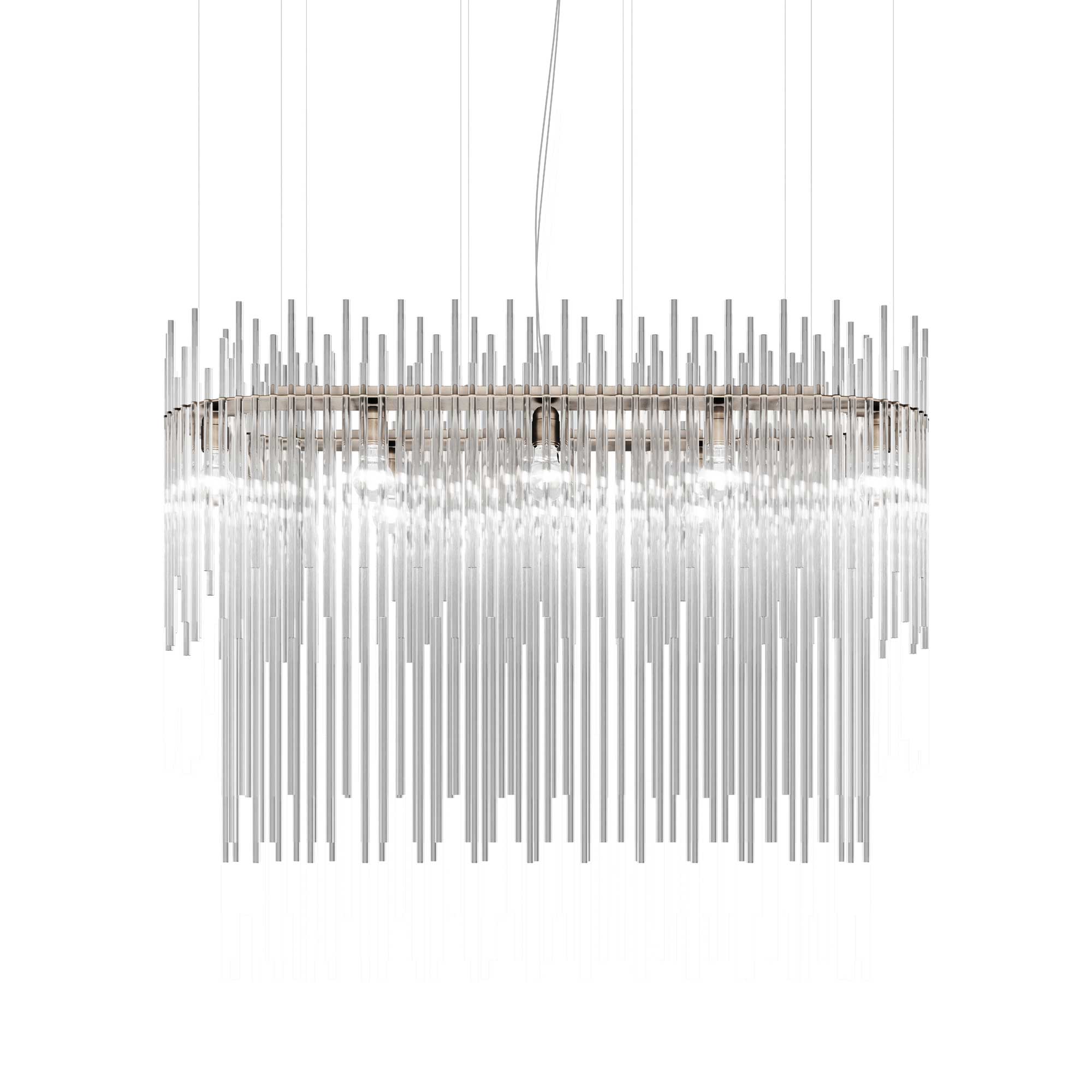 The Diadema SP 02 Chandelier from Vistosi exceeds expectations with an alluring gallery aesthetic. This fixture is reminiscent of frosty Arctic ambiance with strips of ice-like clear glass carefully wrapped around an oval metal frame. Choose this light to infuse glam over a kitchen island or bar space.