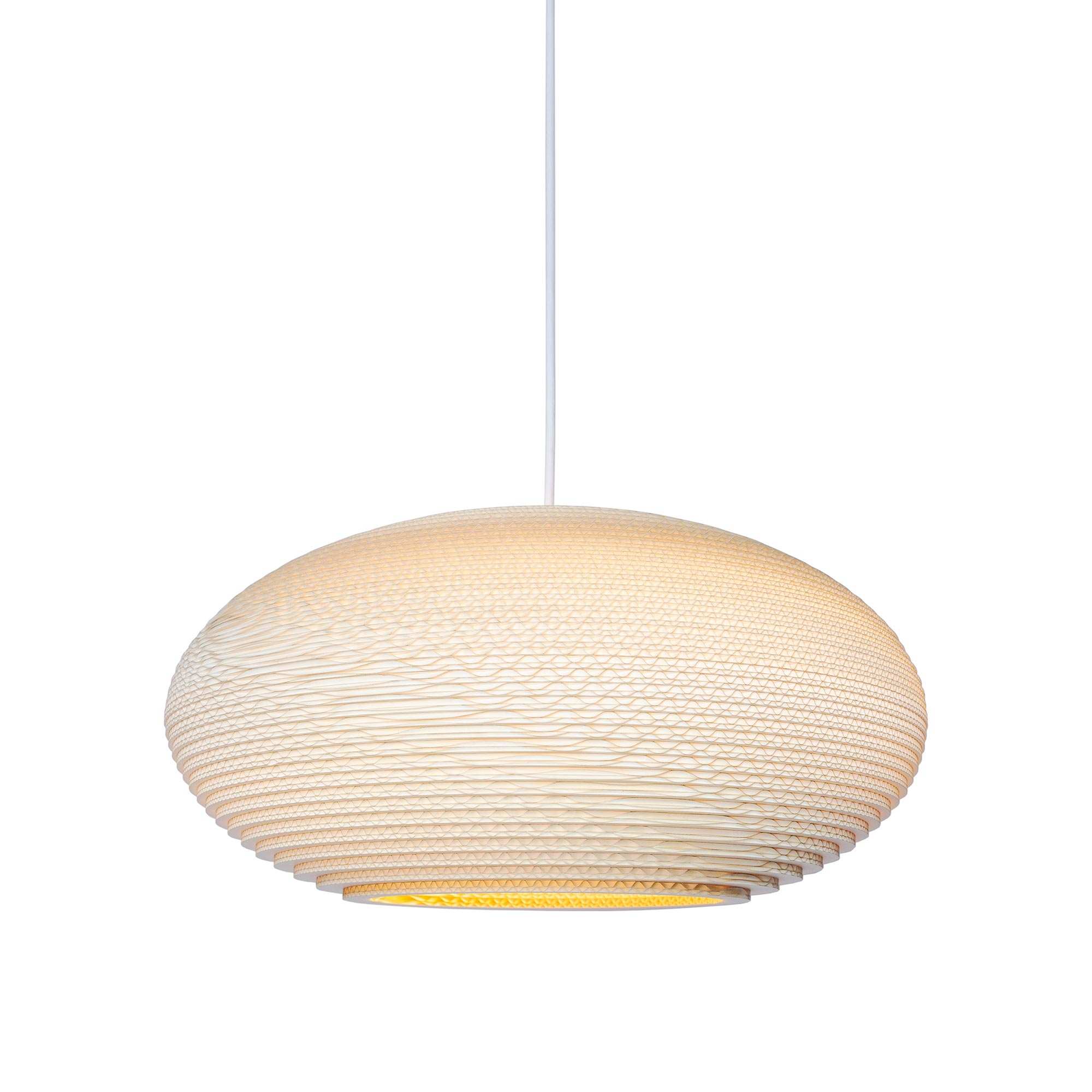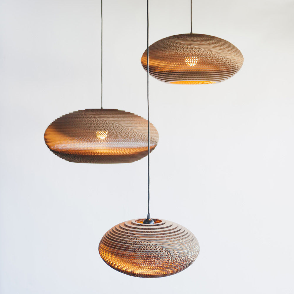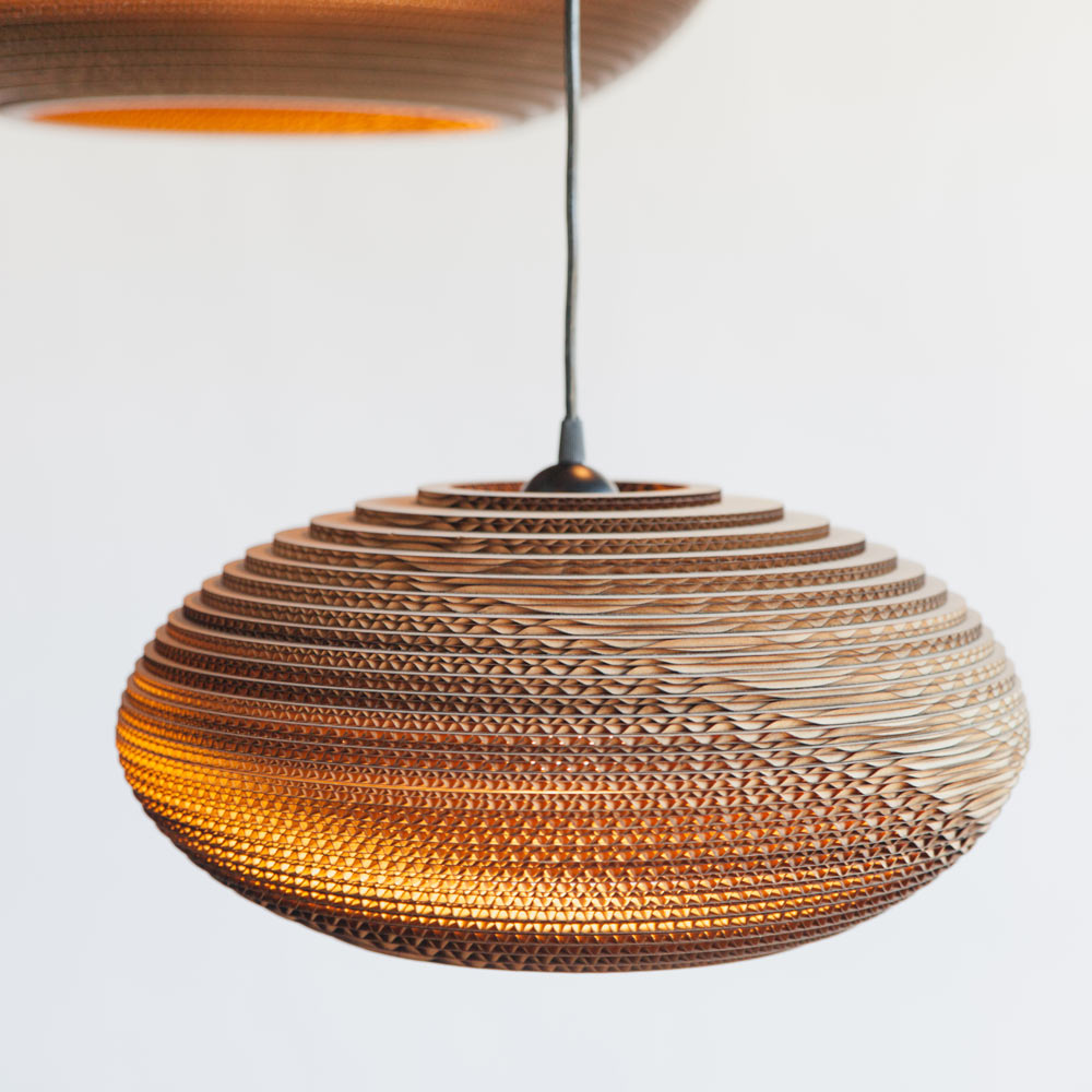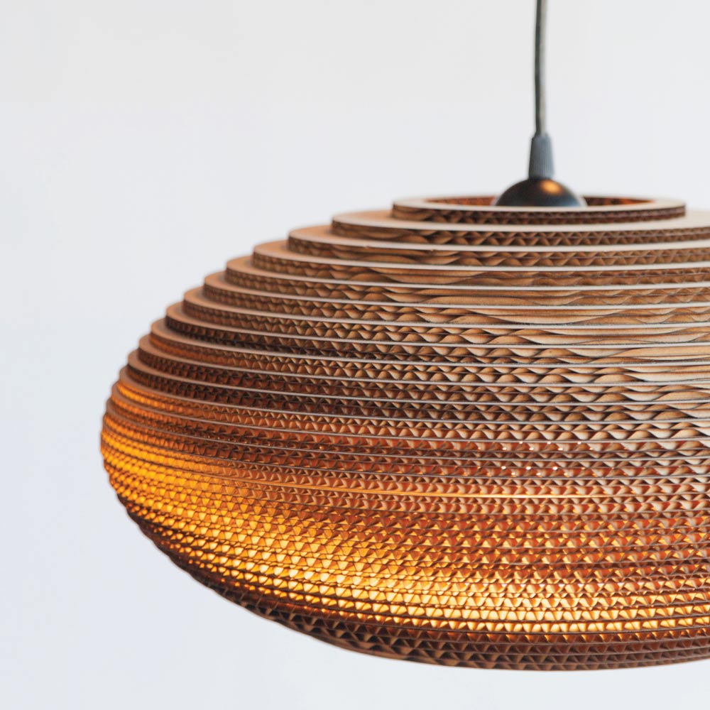 The Disc Pendant Light from Graypants repurposes an exotic Middle Eastern motif, trending toward organic gallery flavor and adding a tastefully handcrafted accent as it cascades ambient downlighting. Novel construction of recycled cardboard is embellished in a disc-shape shade with horizontal laser-cut layers that create gradient shading. This fixture bridges both glam and earth-inspired design motifs to add a striking effect.