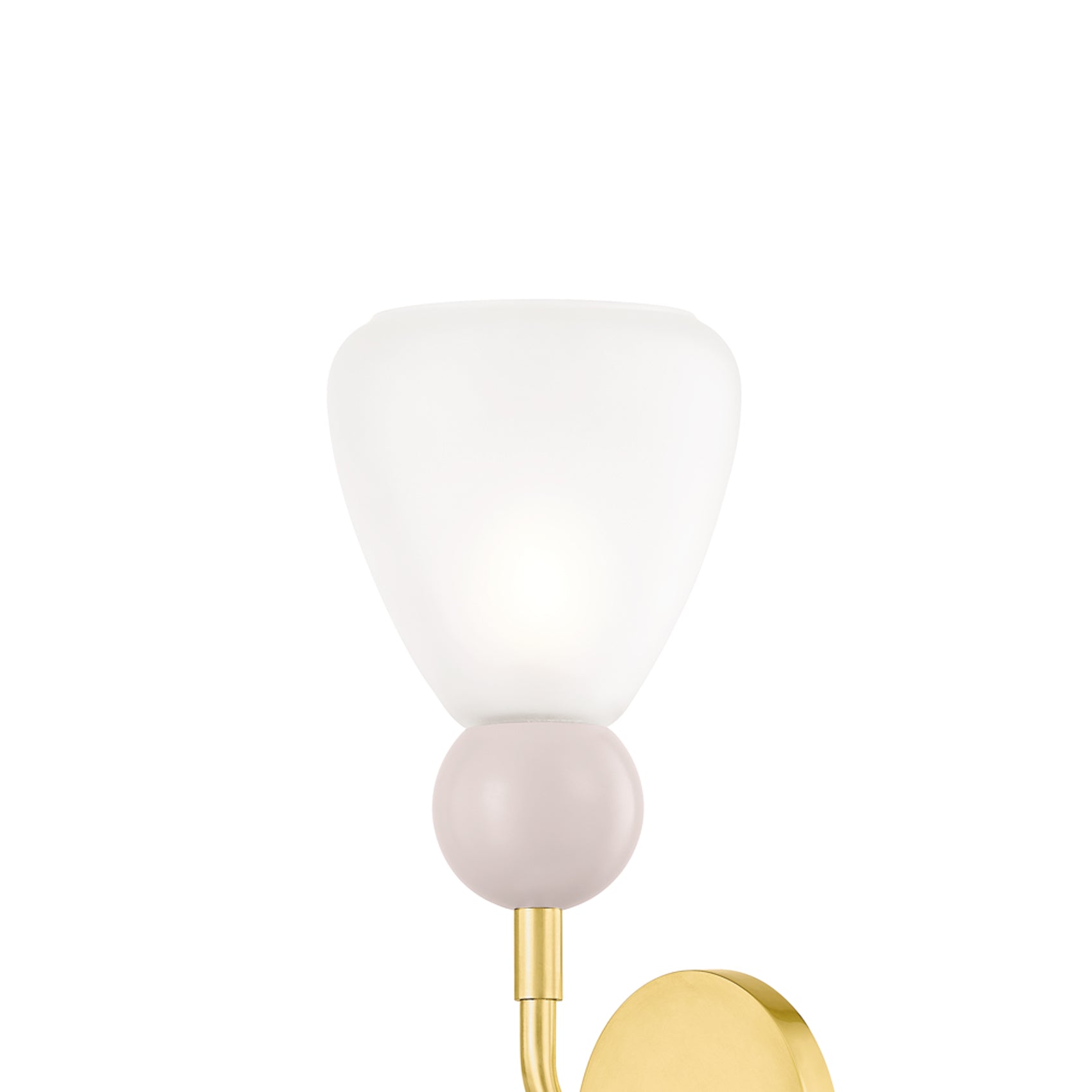 The Doreen Wall Light from Mitzi delivers a tempting aesthetic blending gallery influence with basic design. A playful arrangement of shapes stacks an etched matte glass conical shade and painted peignoir ball element, complemented by warm aged brass finish metal framing that adds a certain richness to hallways, bedrooms, and living areas.