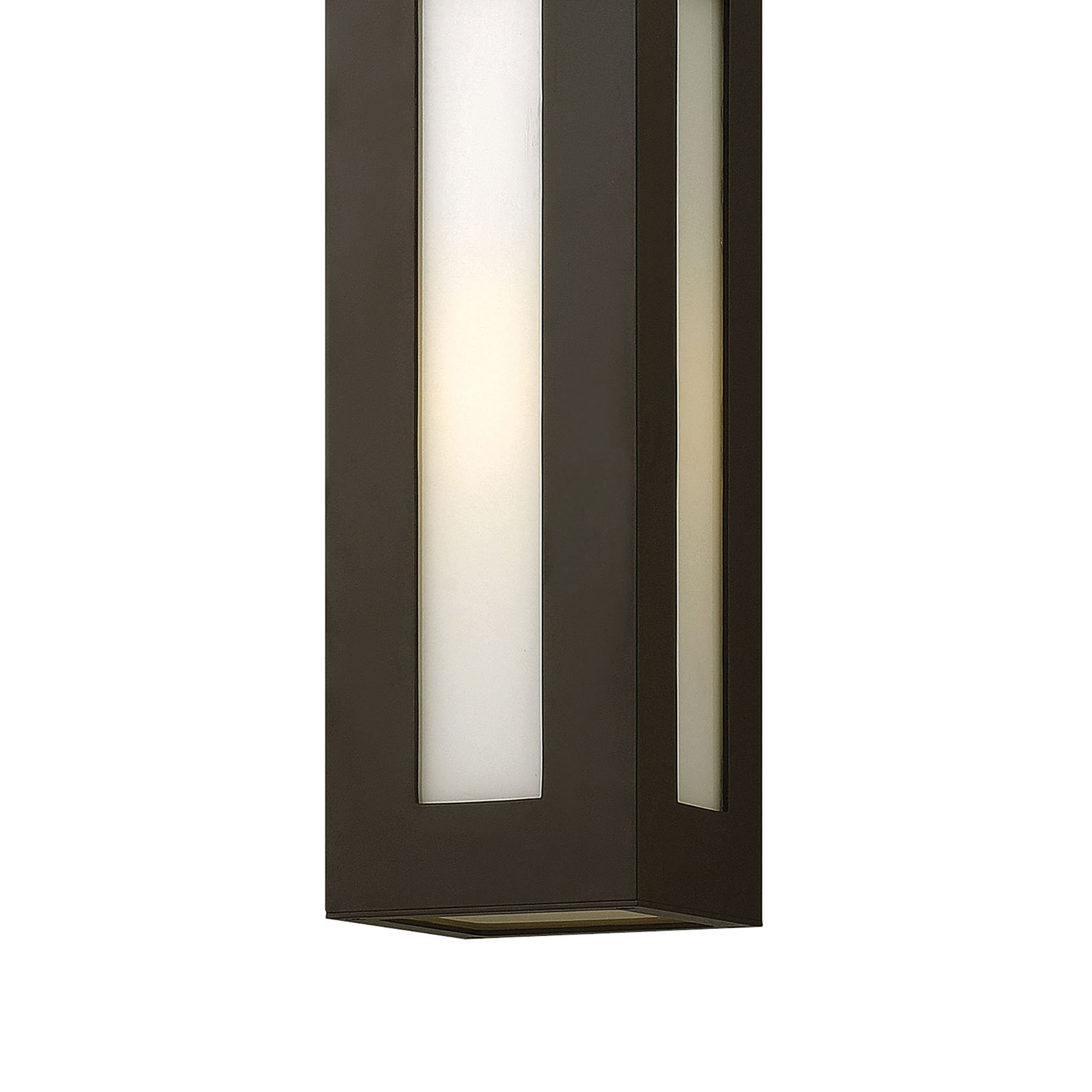 Dorian Outdoor Pendant Light’s robust design in durable aluminum construction is offered in a Bronze finish. This contemporary fixture allows light to emit from clear painted white etched glass windows.