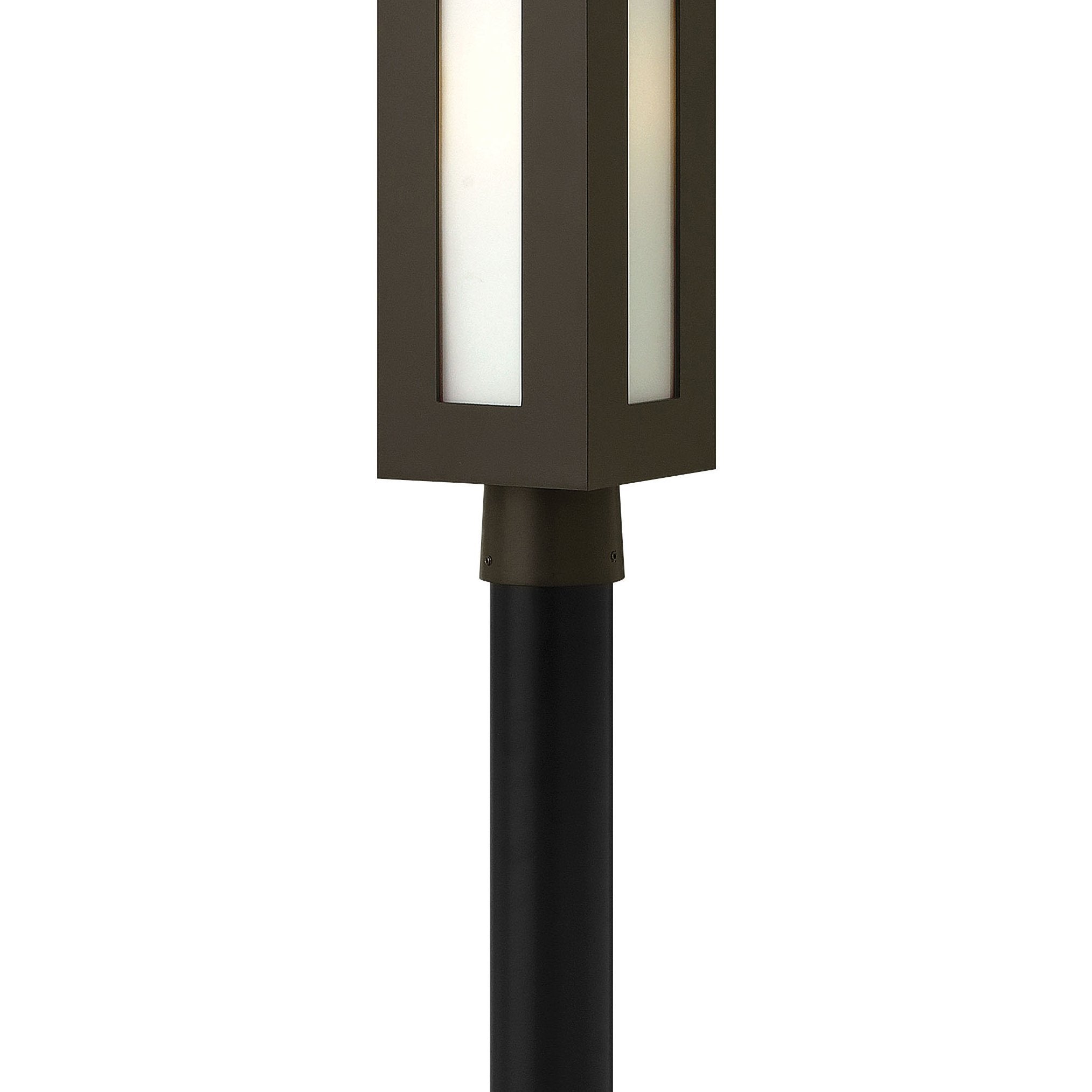 Dorian Outdoor Post Light’s robust design in durable aluminum construction is offered in a Bronze finish. This contemporary fixture allows light to emit from clear painted white etched glass windows.