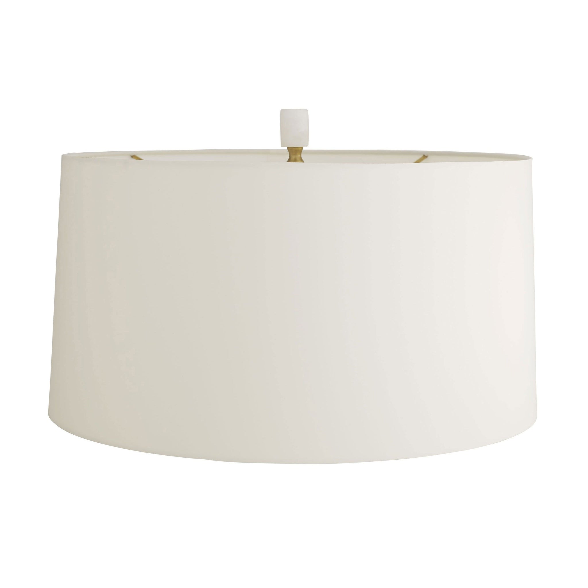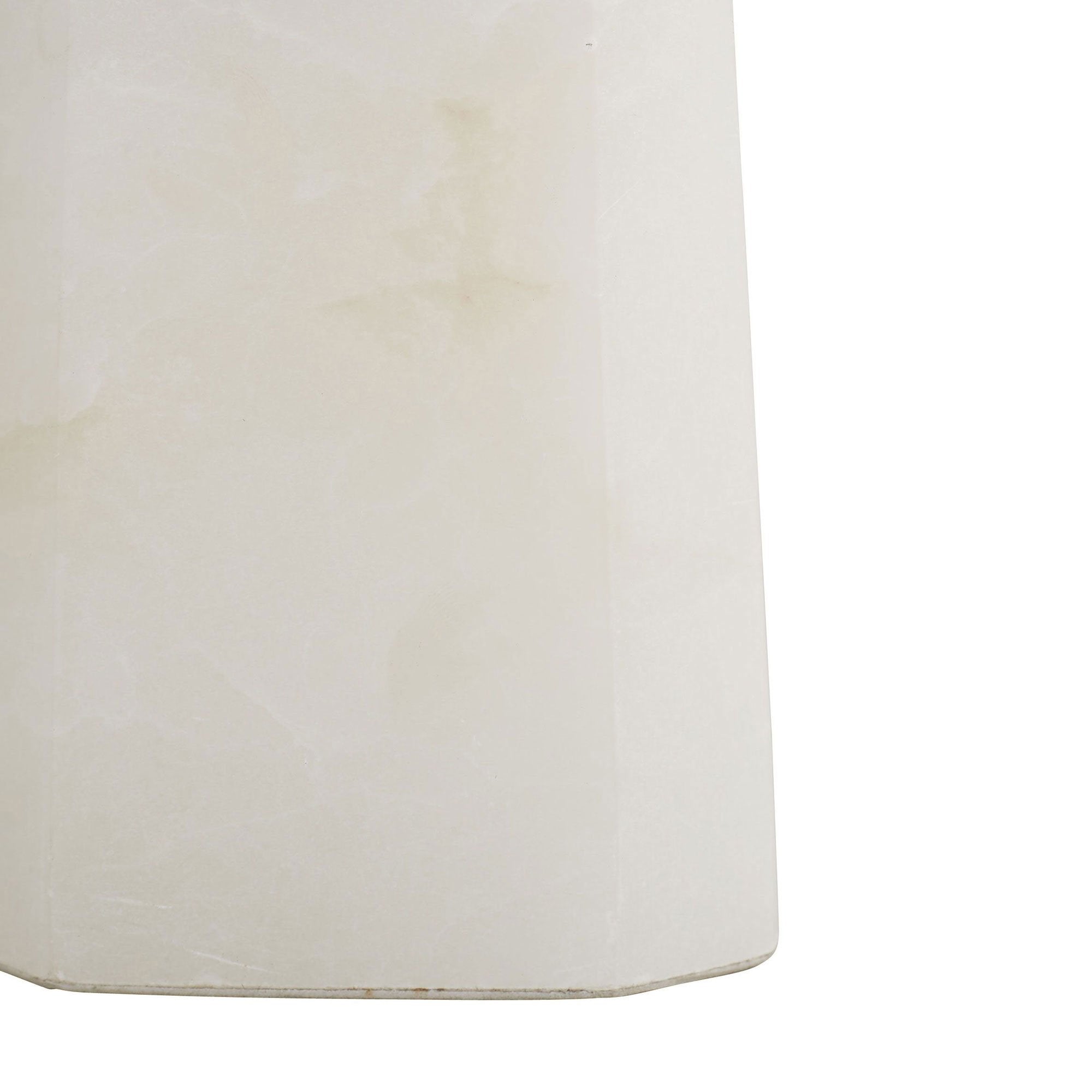 Showcasing clean lines and a faceted façade that tapers the Dosman falls into a classic obelisk shape. Its snow marble construction features steel antique brass breaks that accent its sleek foundation and complement the matching snow marble and antique brass finial. A striking sculptural statement piece for any setting. Topped with an ivory microfiber drum shade with white cotton lining. Finish may vary.