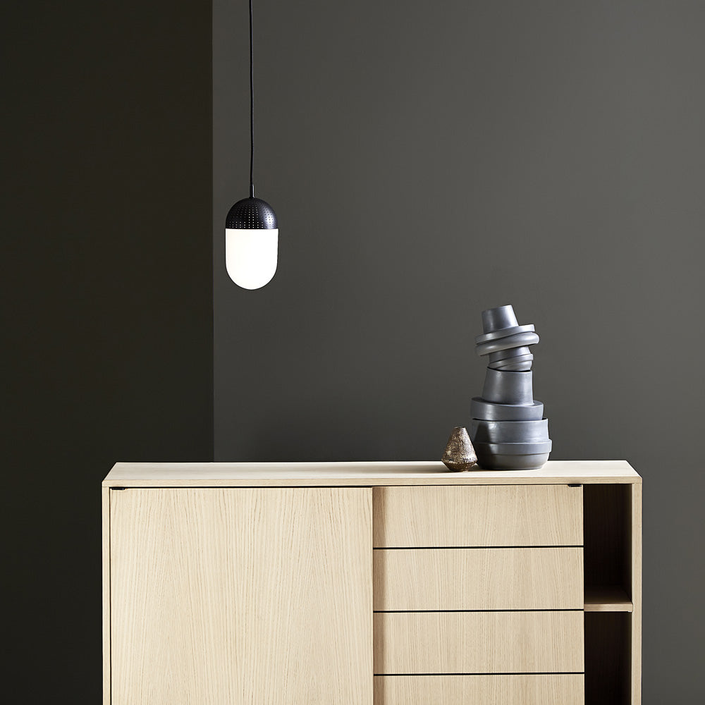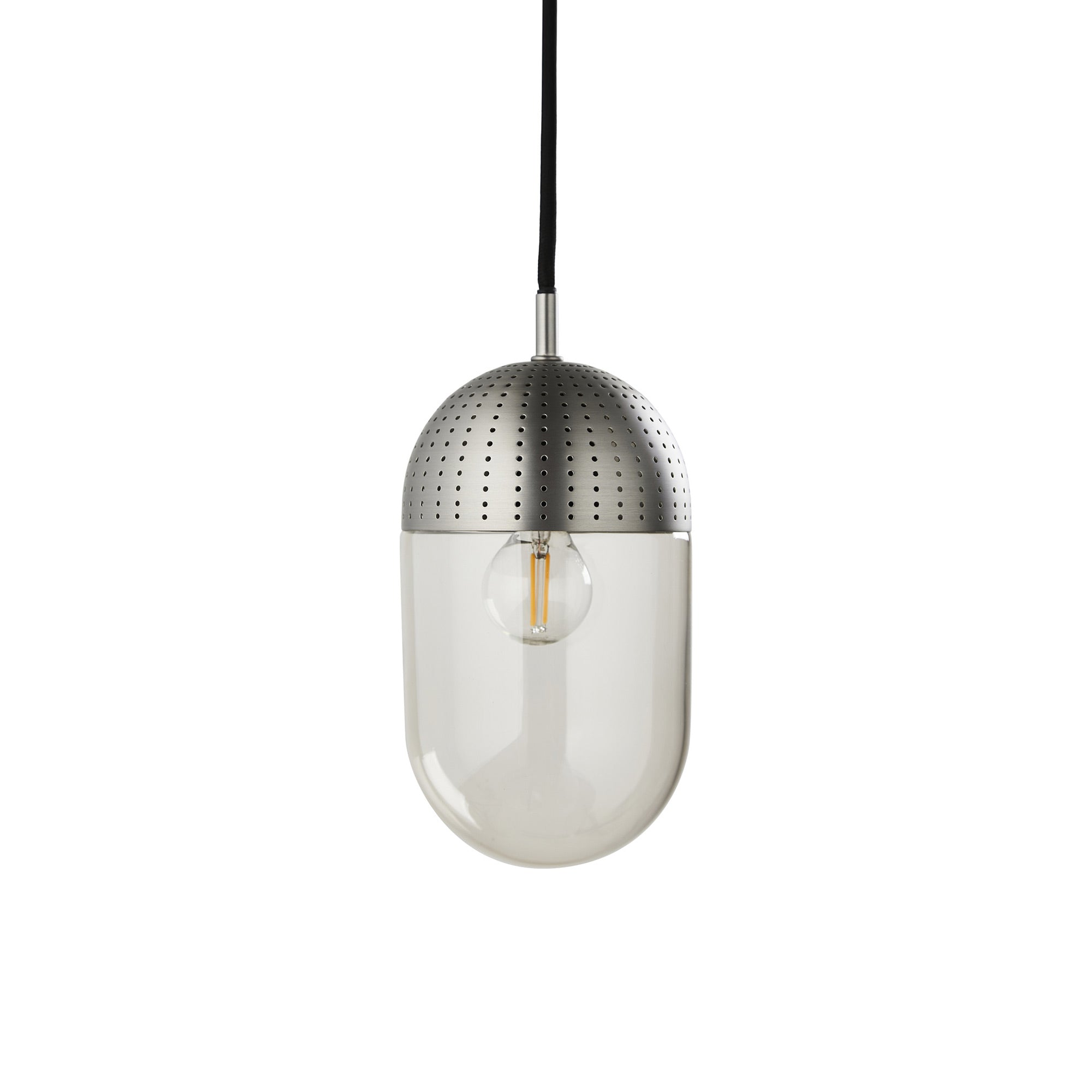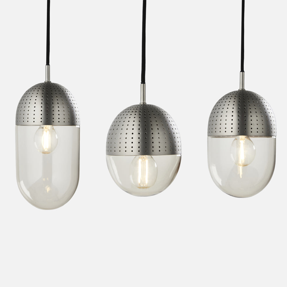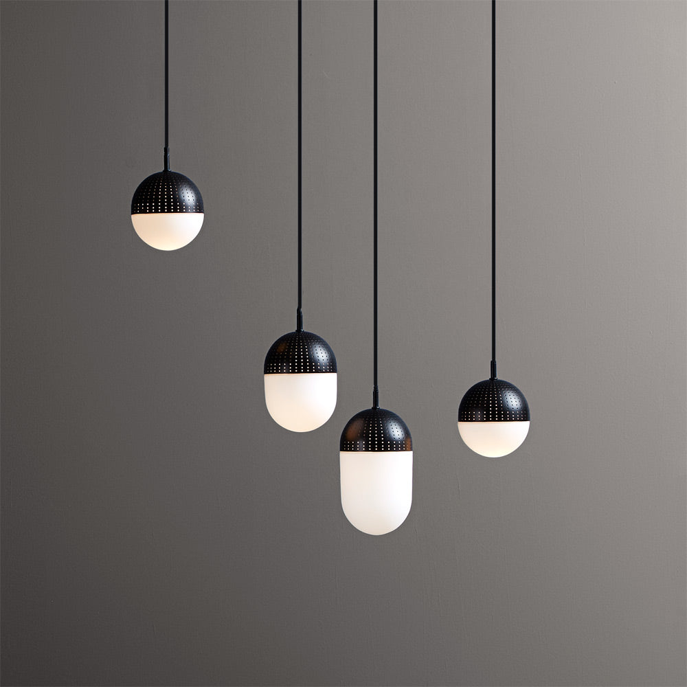 Sassy style emulates an industrial grit in the Dot Pendant Light from WOUD, changing the mood in a modern or transitional space. An iconic marriage of metal and glass features a perforated metal half-dome shade nestling glam glass, allowing for ethereal effects as light seeps through diminutive dots.