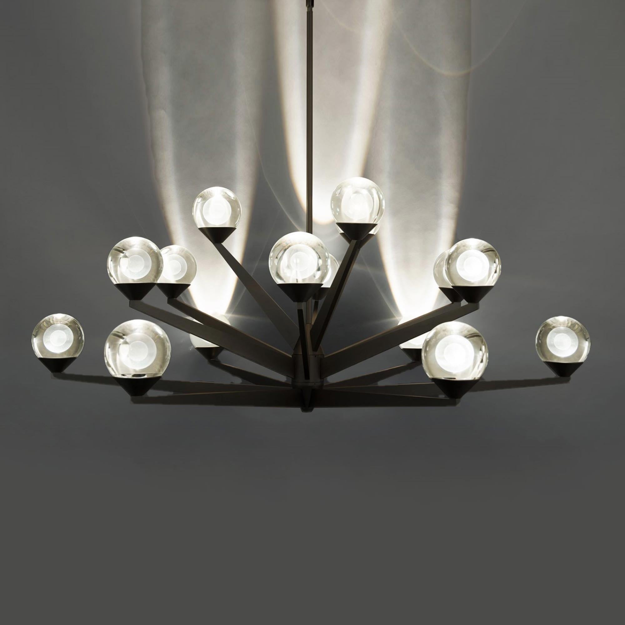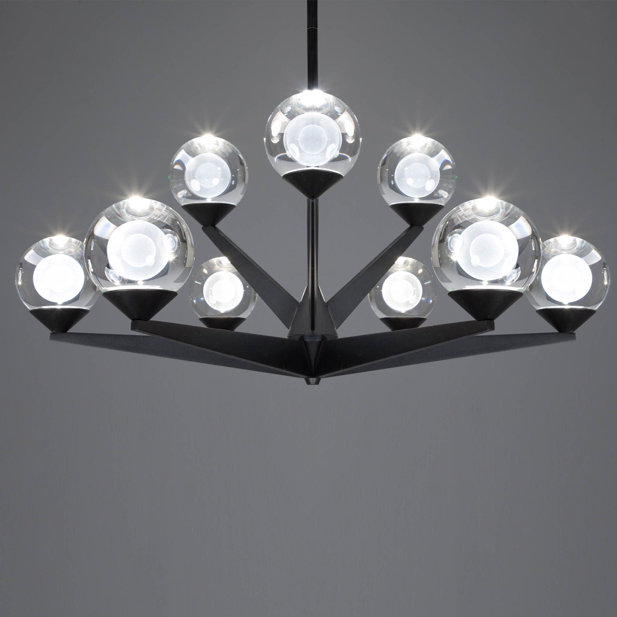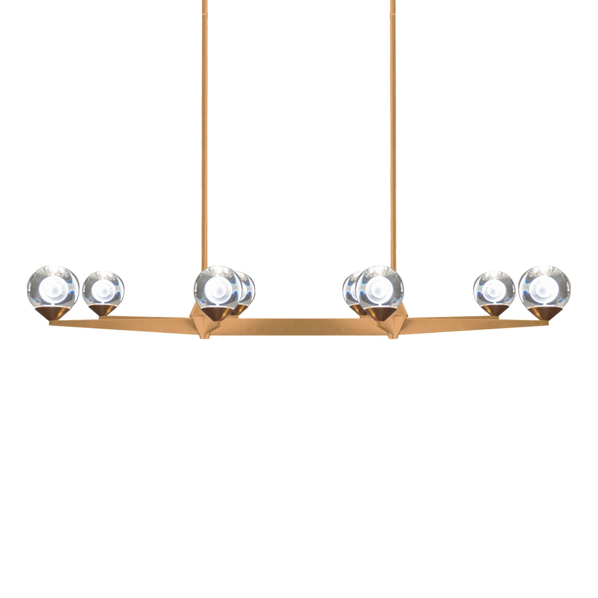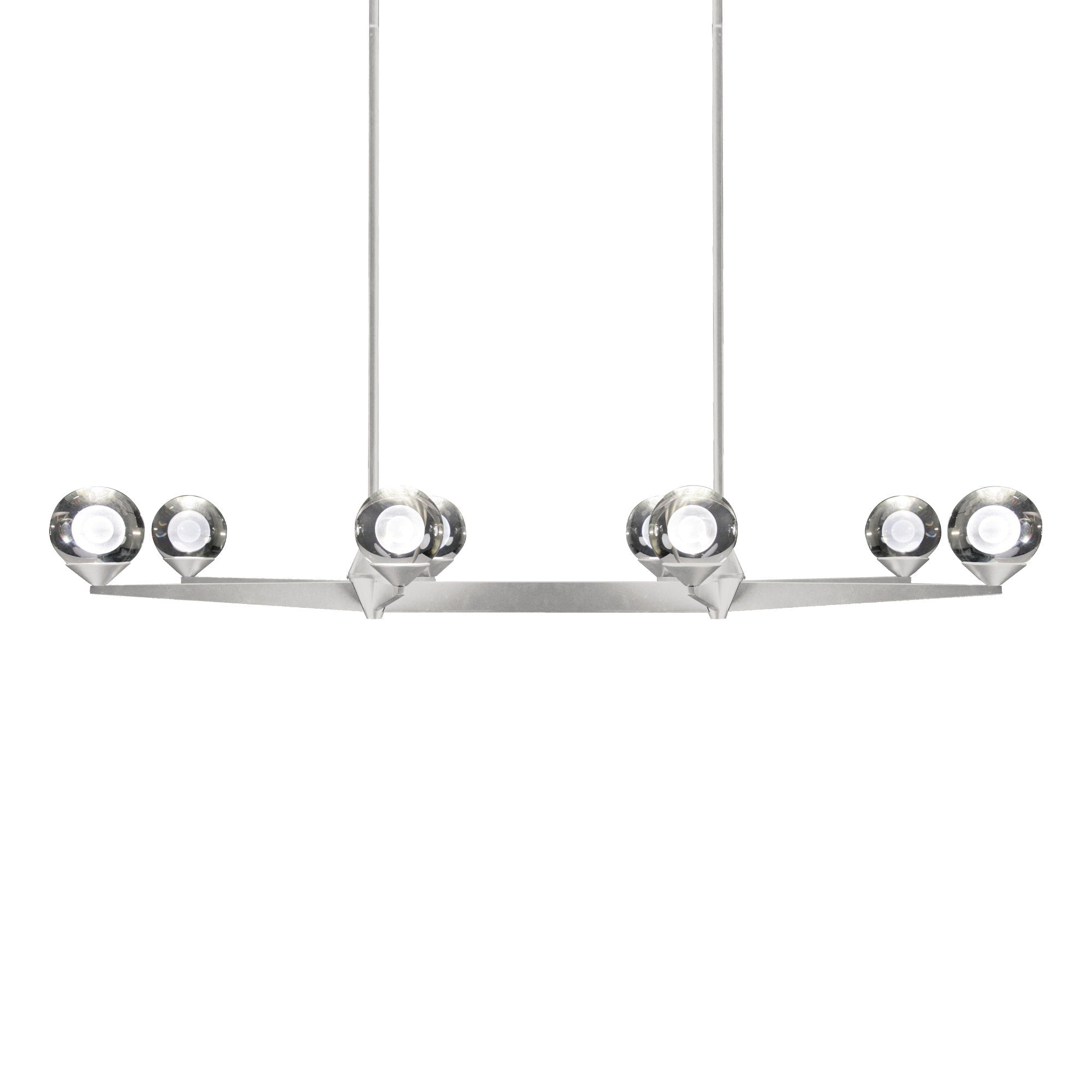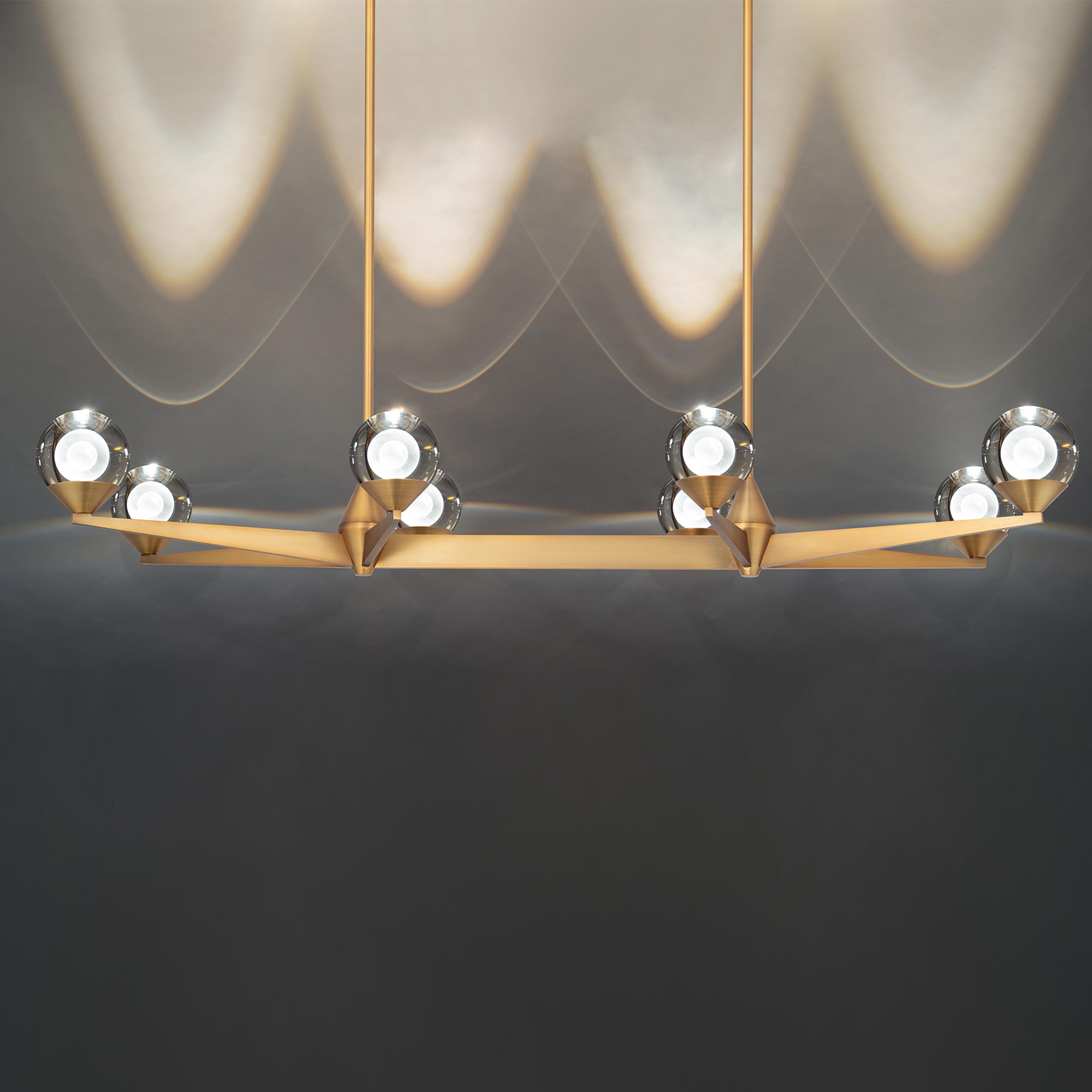 A captivating linear chandelier adorned with geometrically concentric spheres brings sophisticated elegance and intrigue to any room. This show stopping statement piece deploys laser-etched spherical shades embraced by bobeches and arms, providing alluring ambience and aesthetic that delights.