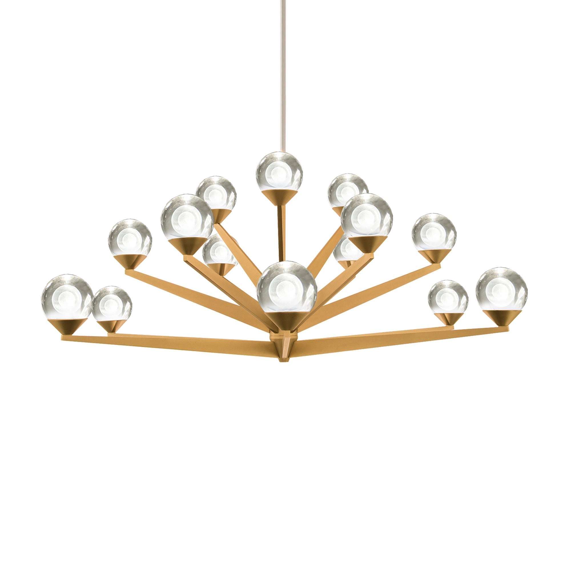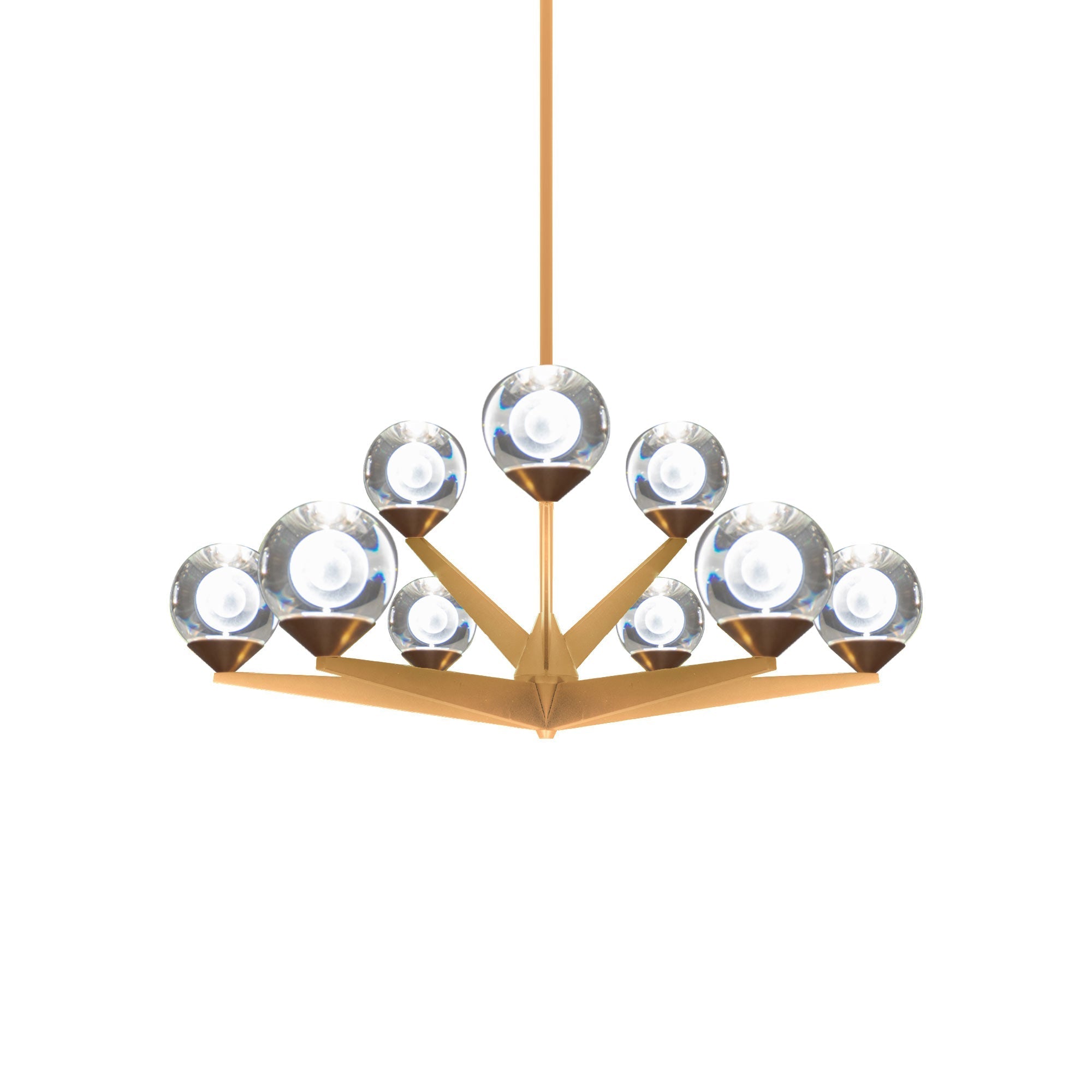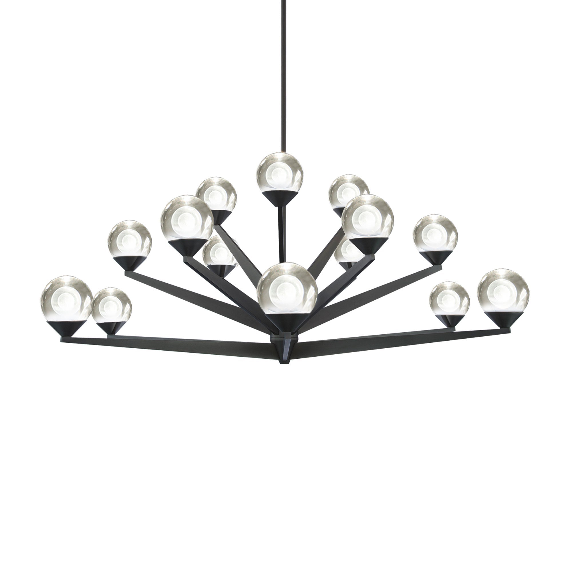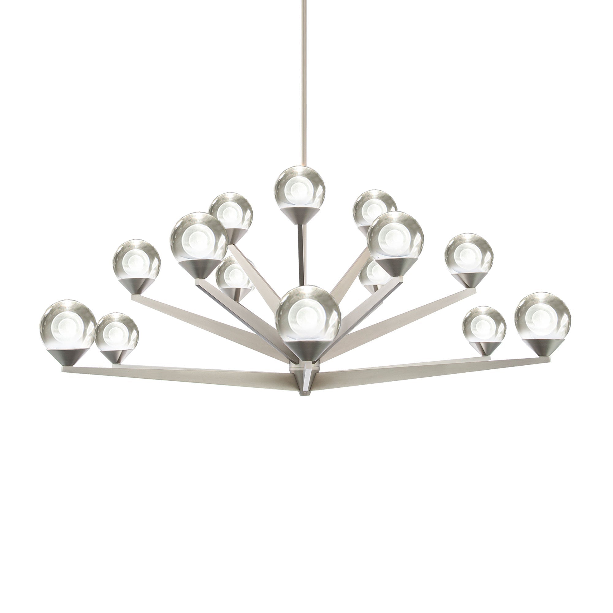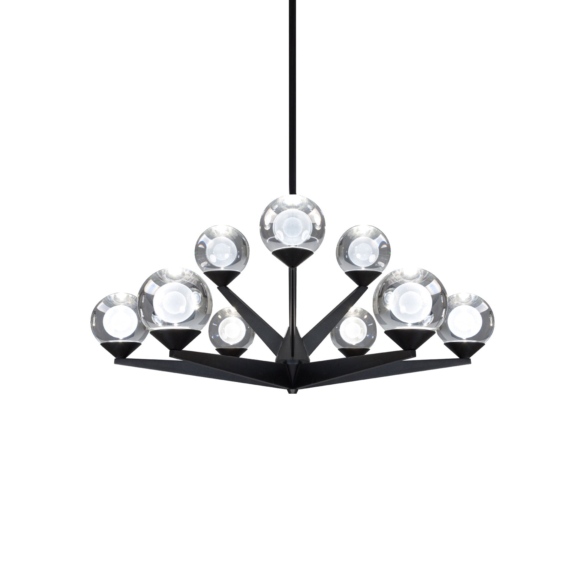 A captivating linear chandelier adorned with geometrically concentric spheres brings sophisticated elegance and intrigue to any room. This show stopping statement piece deploys laser-etched spherical shades embraced by bobeches and arms, providing alluring ambience and aesthetic that delights.