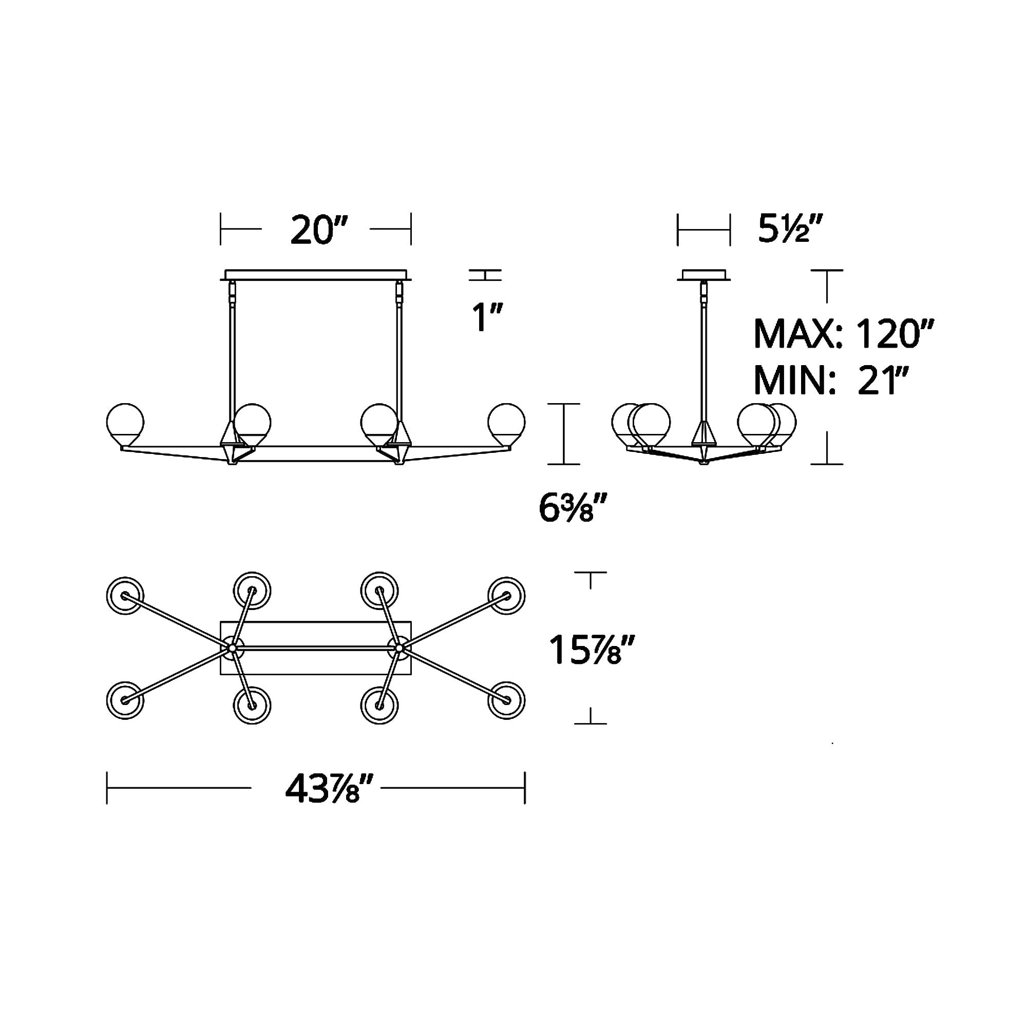 - 8-Light: 43.88"W X 6.38"H; 120" max height