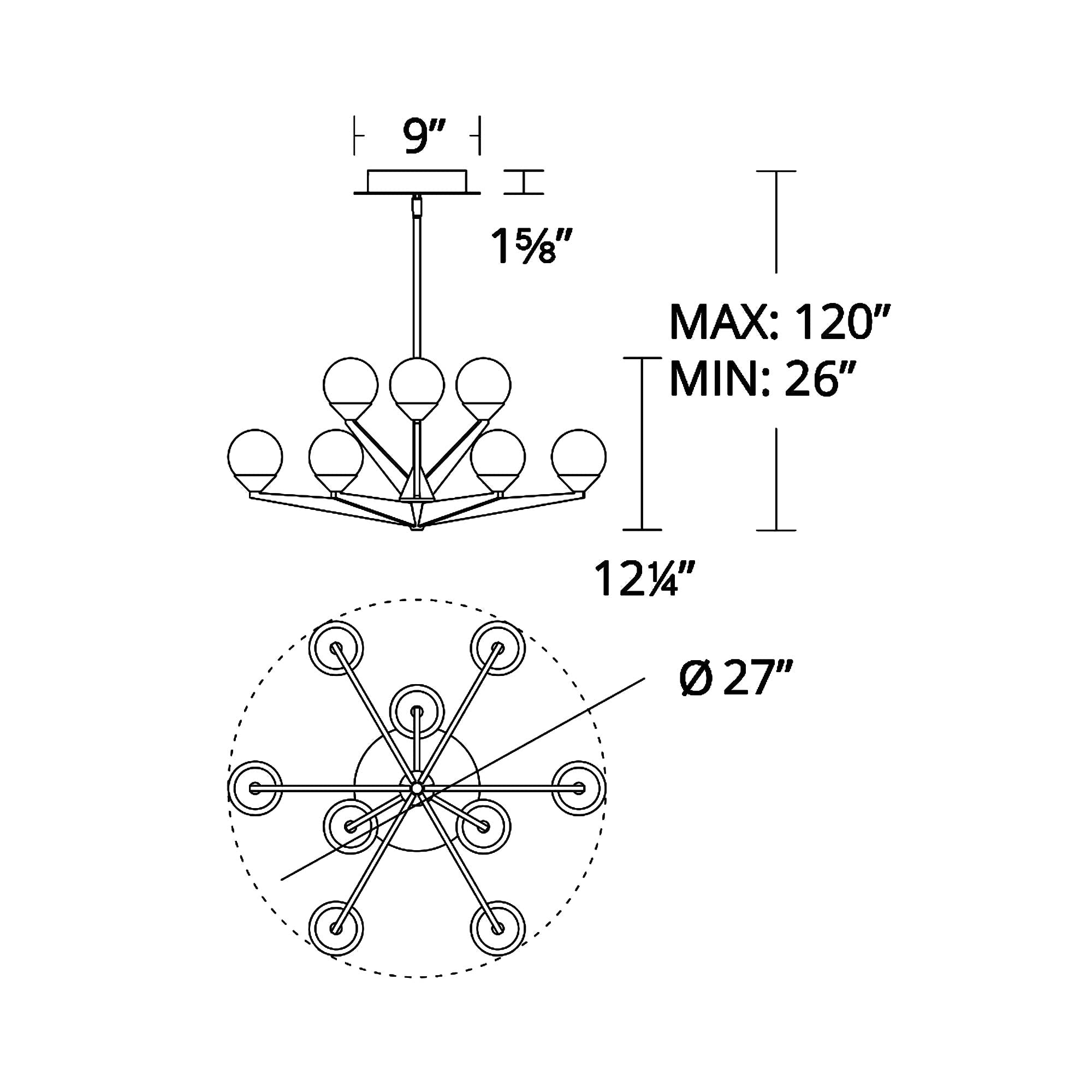 - 9-Light: 27"D X 12.25"H; 120" max height