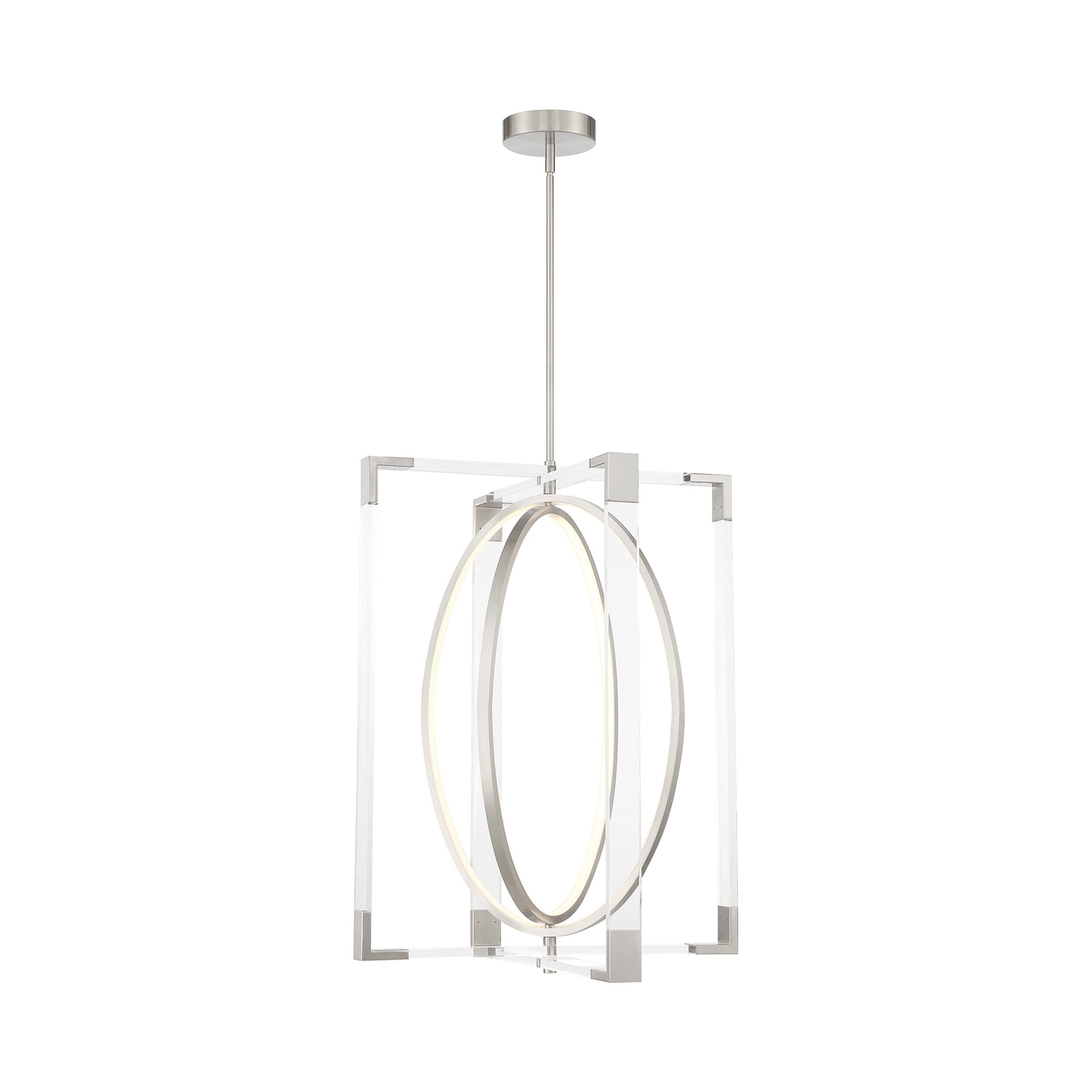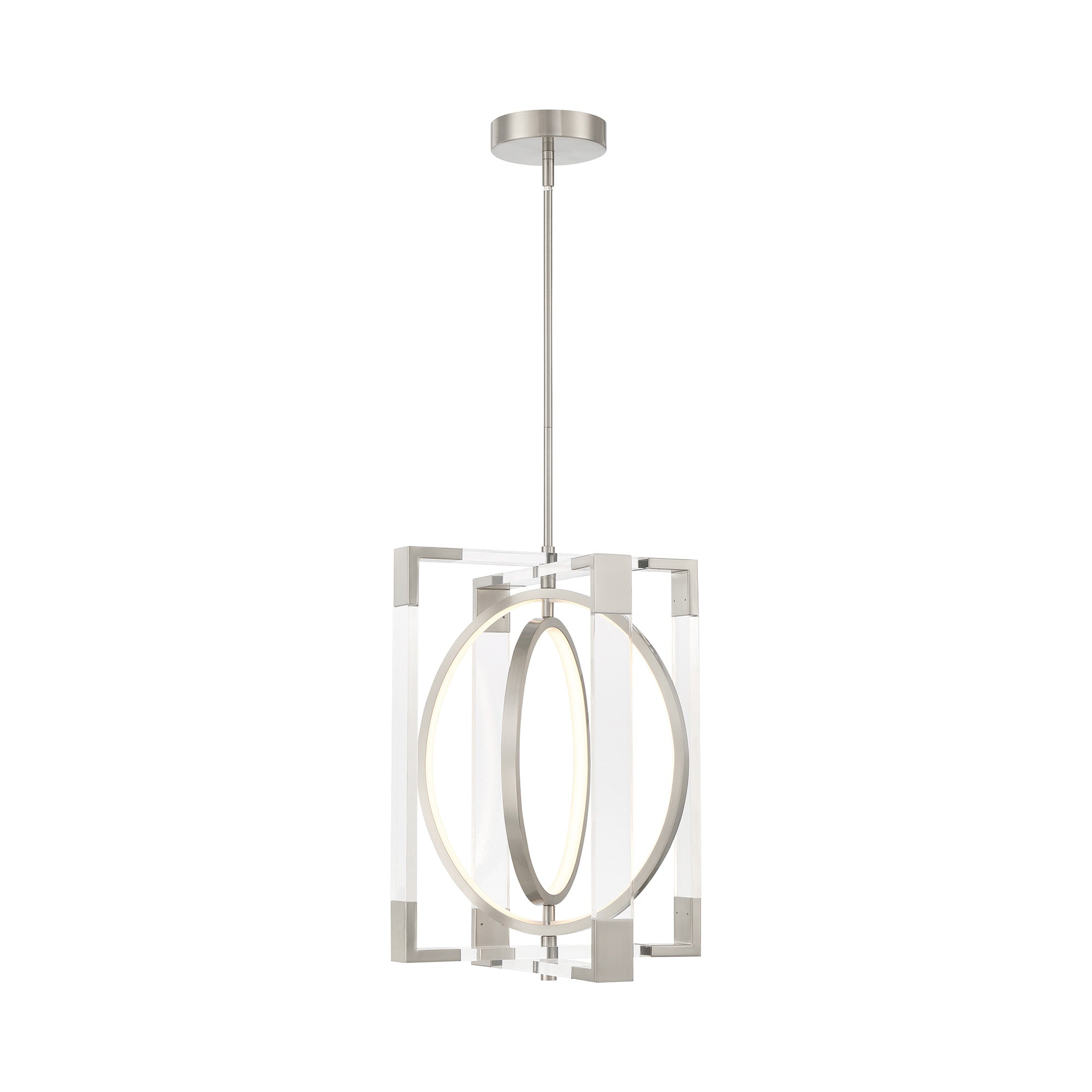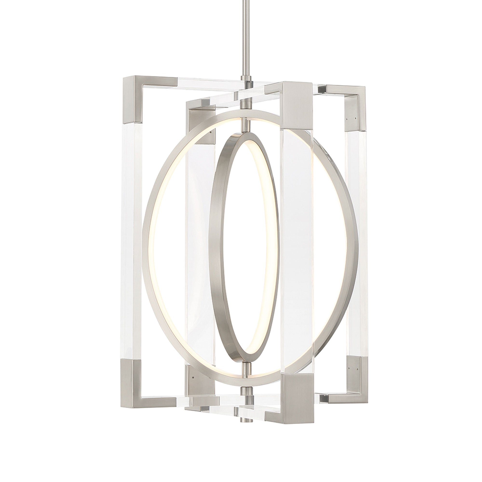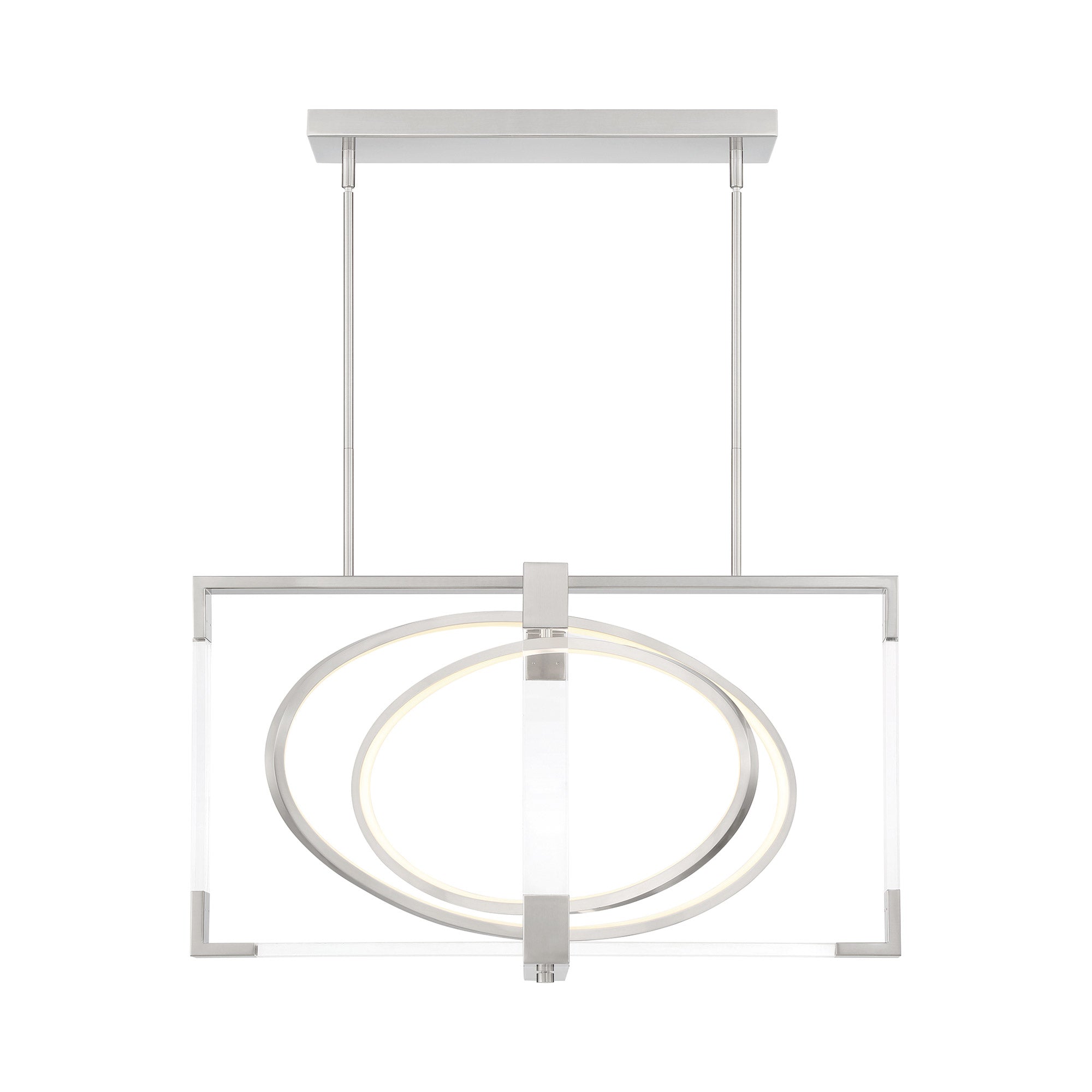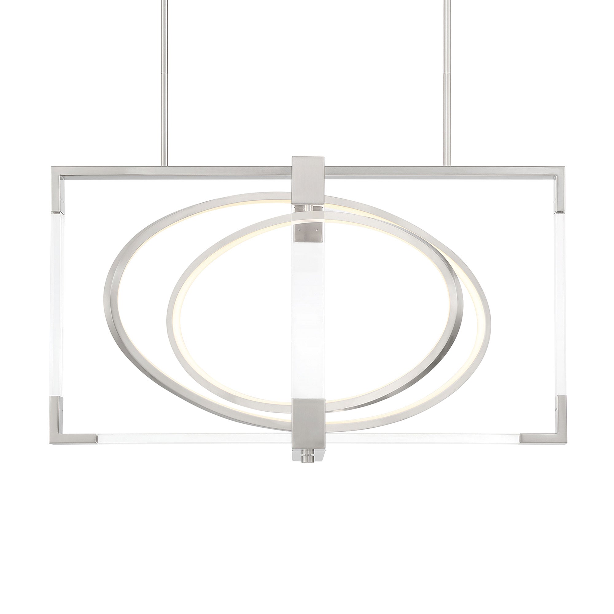 Open rings glow within the square frame of the ultra-modern Double Take LED Pendant Light from George Kovacs.