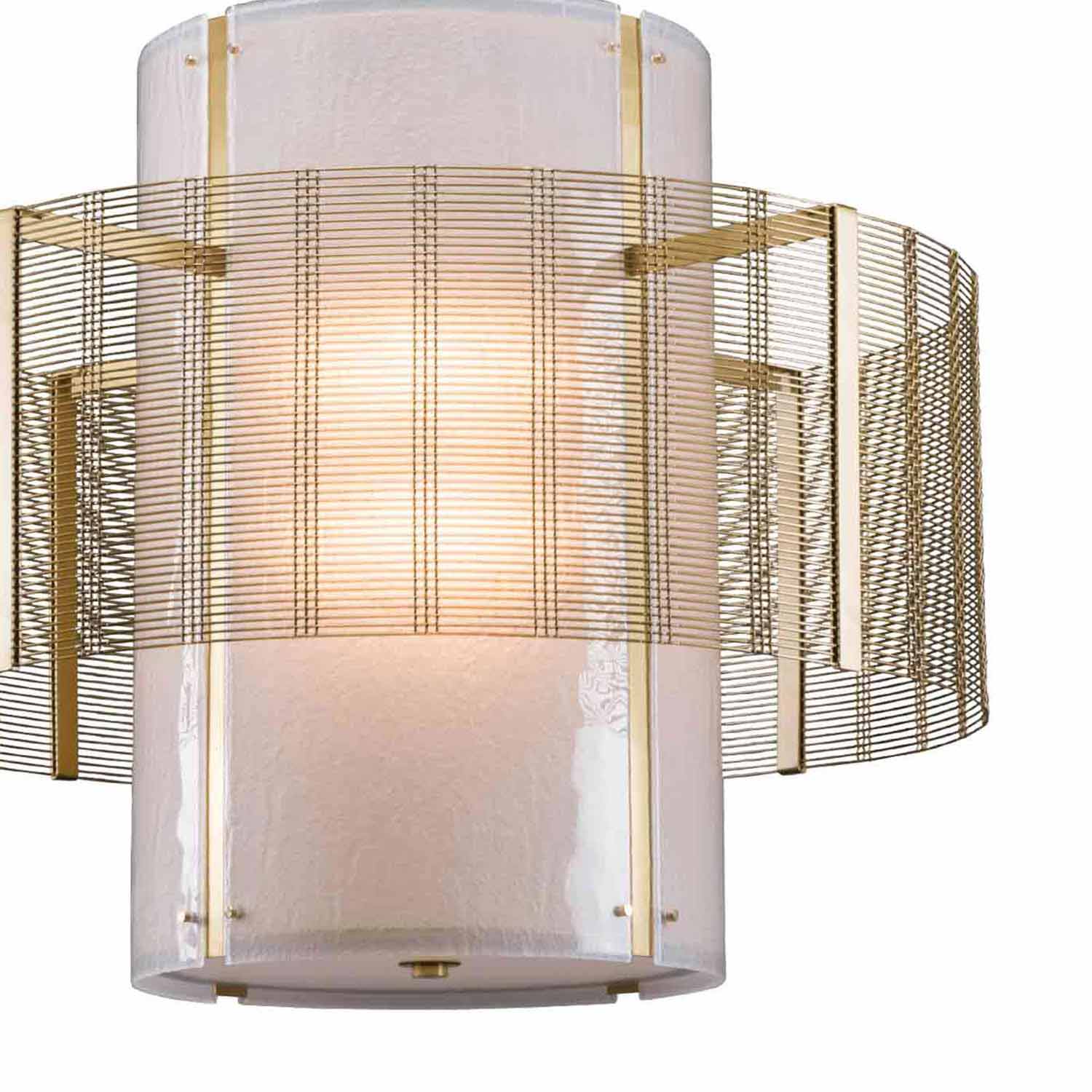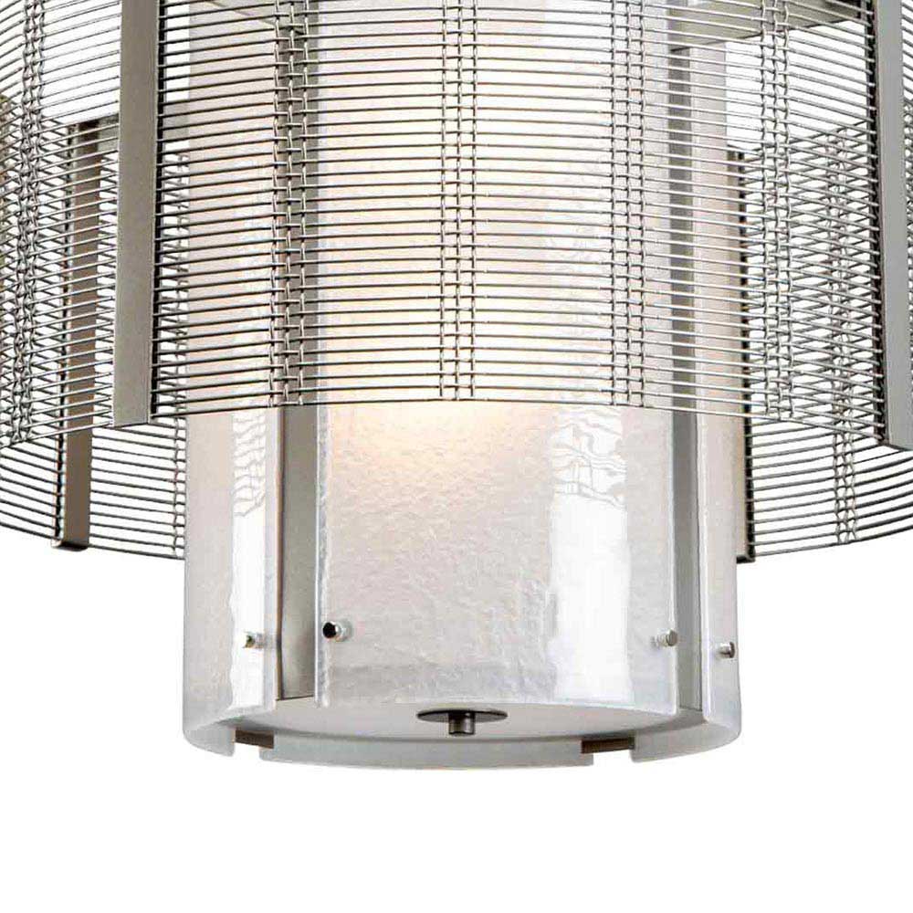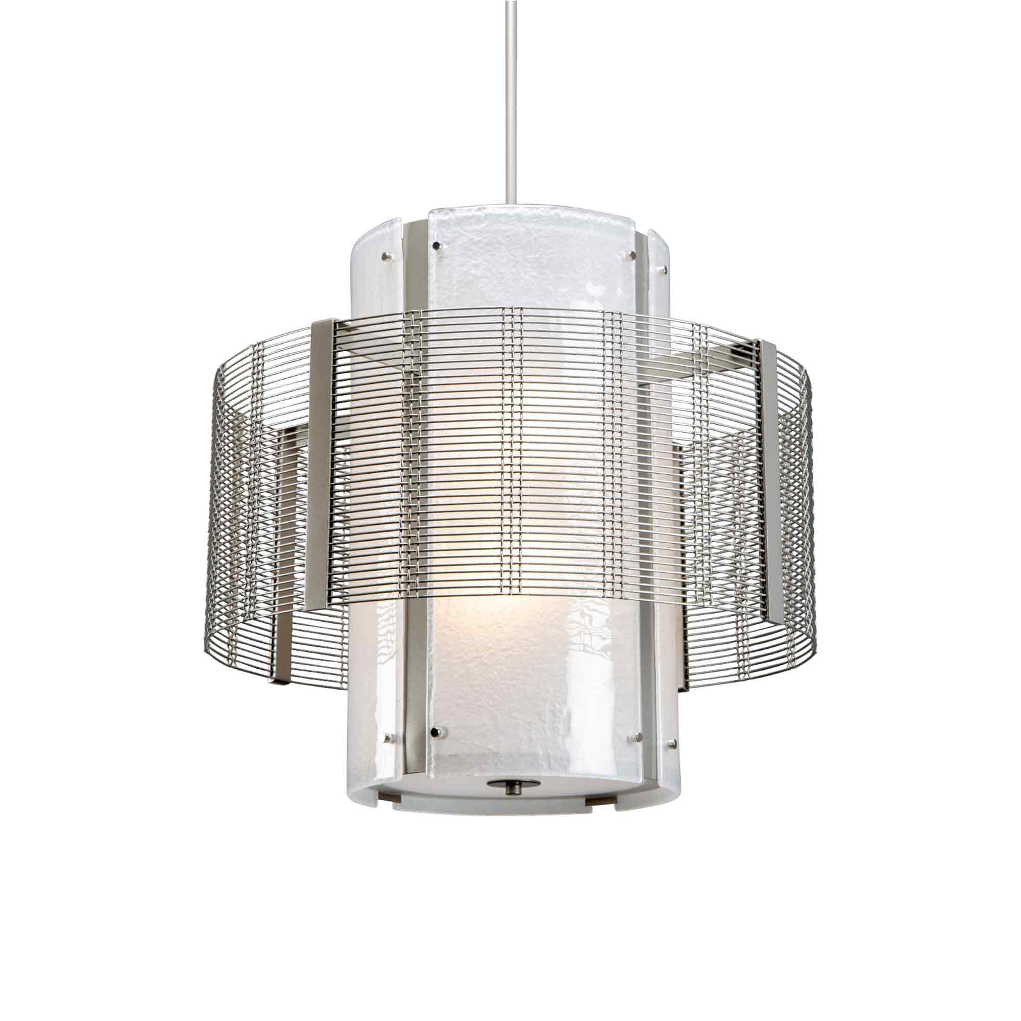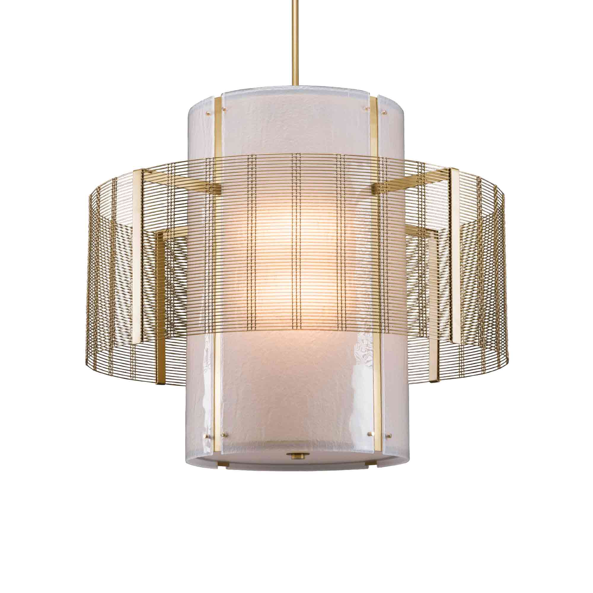A surprising blend of artistry and industrial-style simplicity in the Downtown Mesh Double Drum Pendant Light from Hammerton Studio. Alluring with rounded silhouettes, its central kiln-fused glass diffuser and outer mesh metal drum shade create the best of visual impact for a casual or semi-formal space.