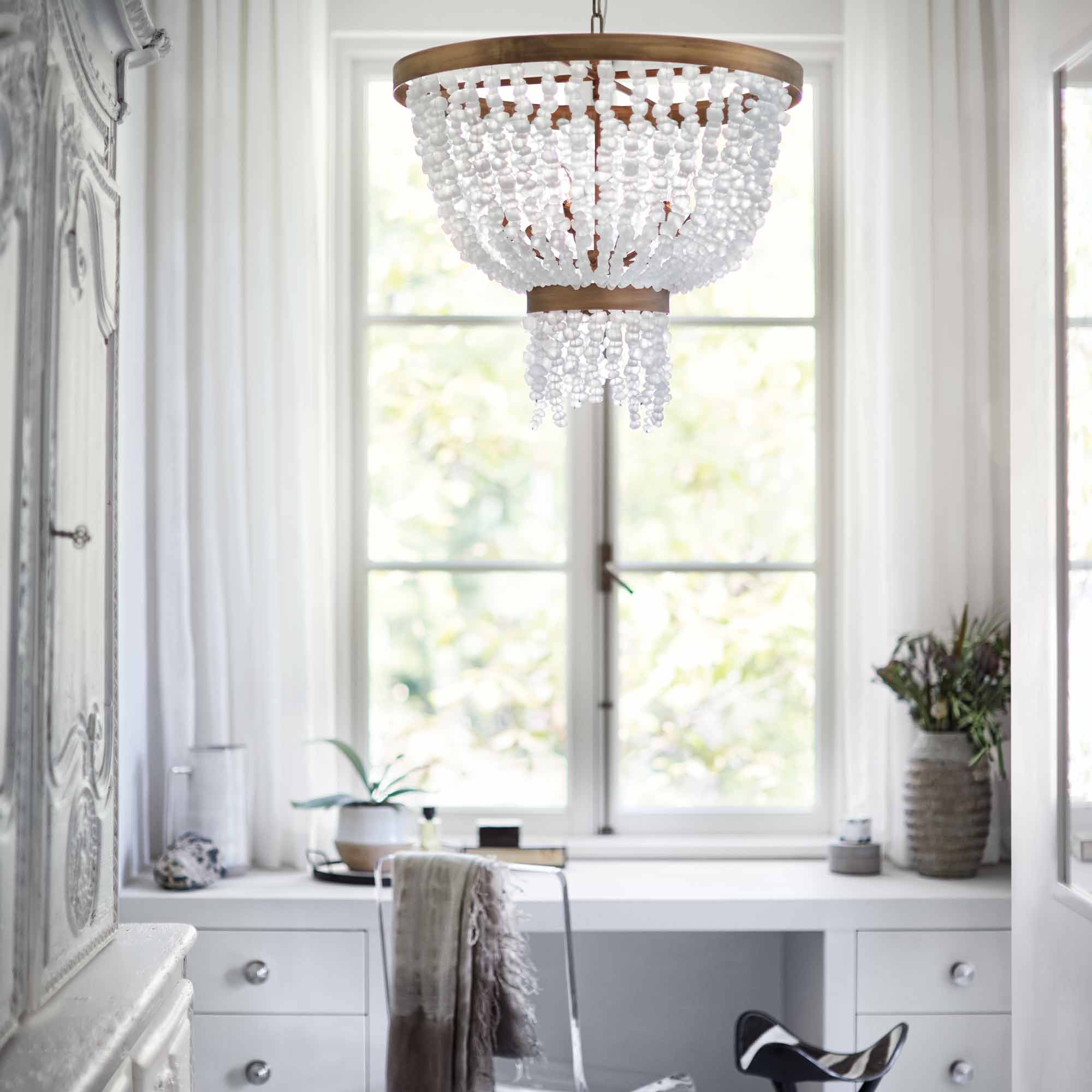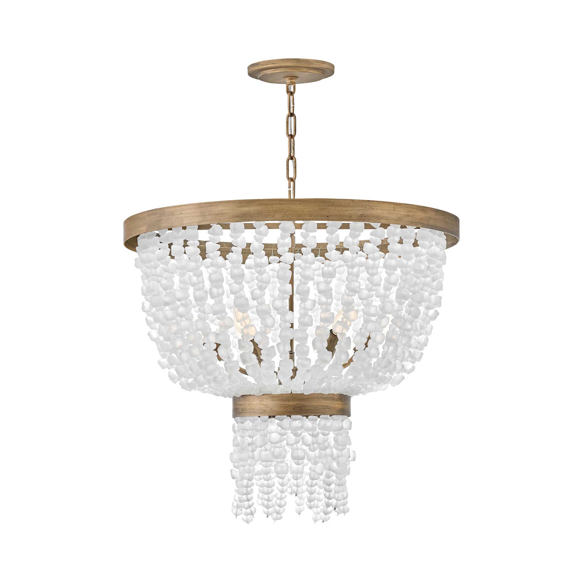 Dune's bohemian chic design showcases strands of soft white sea glass combined with a burnished gold finish. The designs blend a sophisticated silhouette with organic elements inspired by sun and surf. Dune infuses any space with a timeless, mesmerizing elegance.