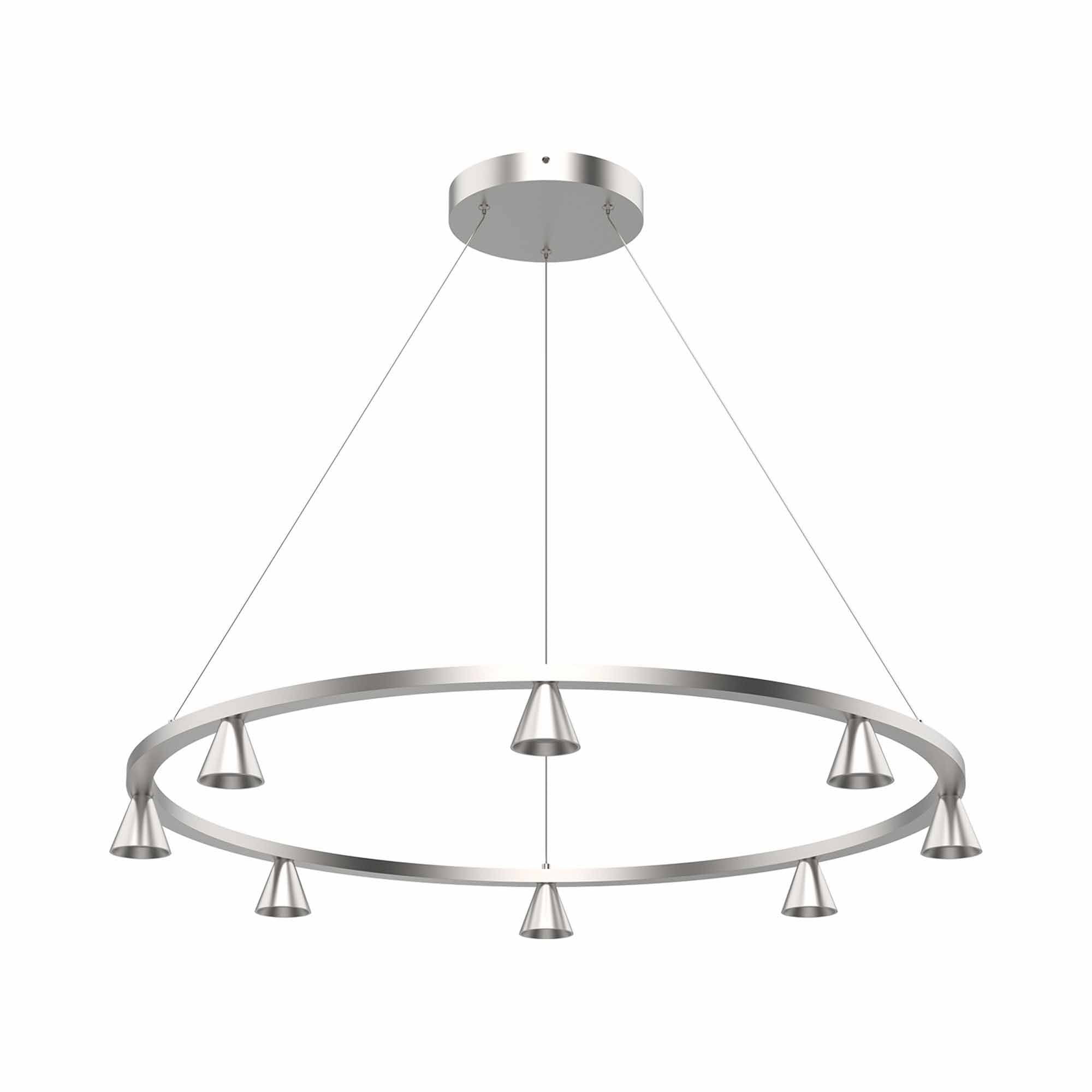 Multiple aluminum cones are connected inline and direct light downwards from the geometric linear pendant. The Dune LED Chandelier series utilizes classic minimalist lamp shapes yet in reduced scale to elegant effect. The LED spot sources are focused by diminutive reflectors housed within the exquisitely turned shades. Available in multiple configurations and finishes.