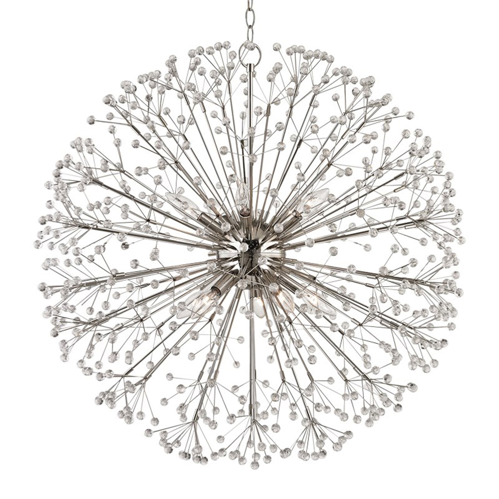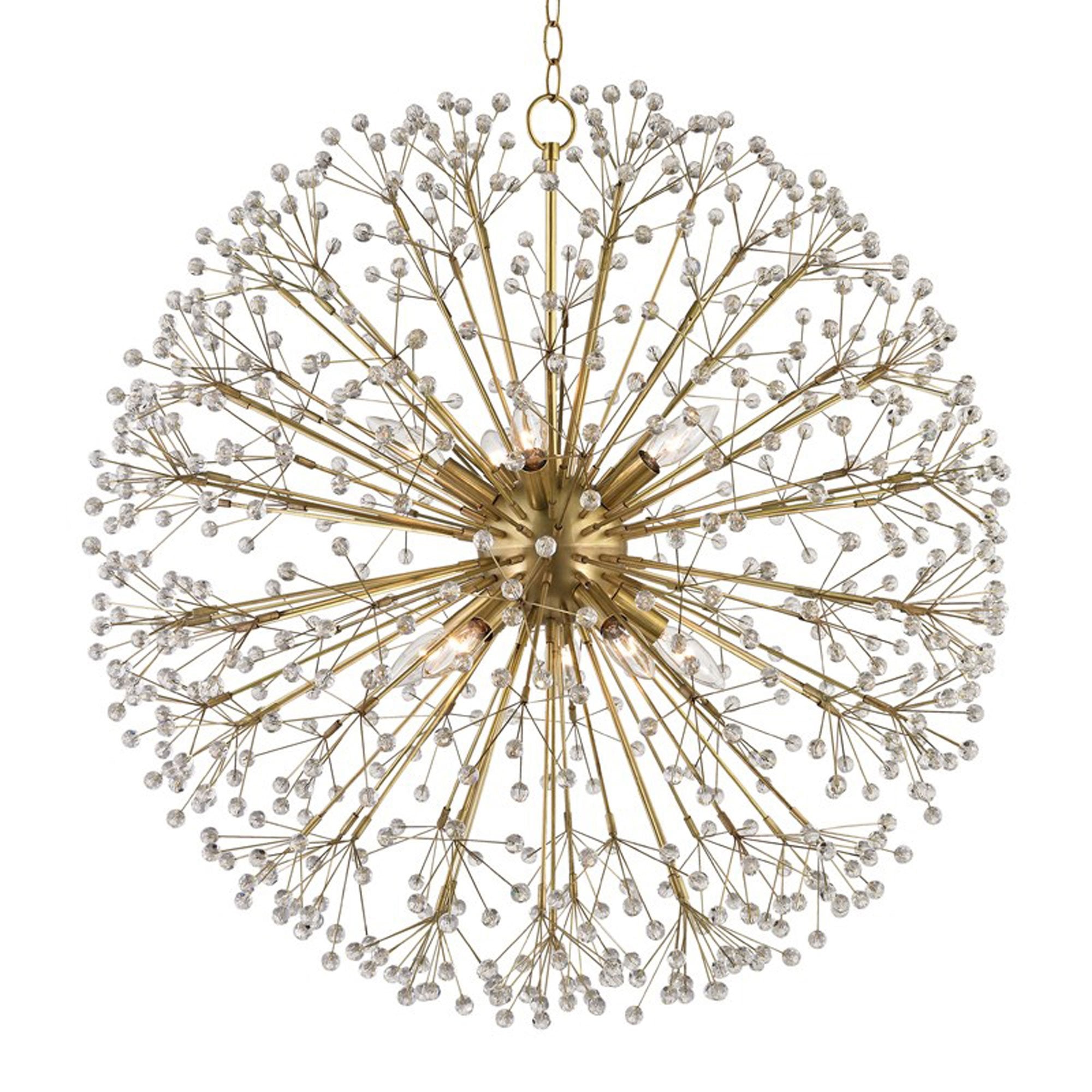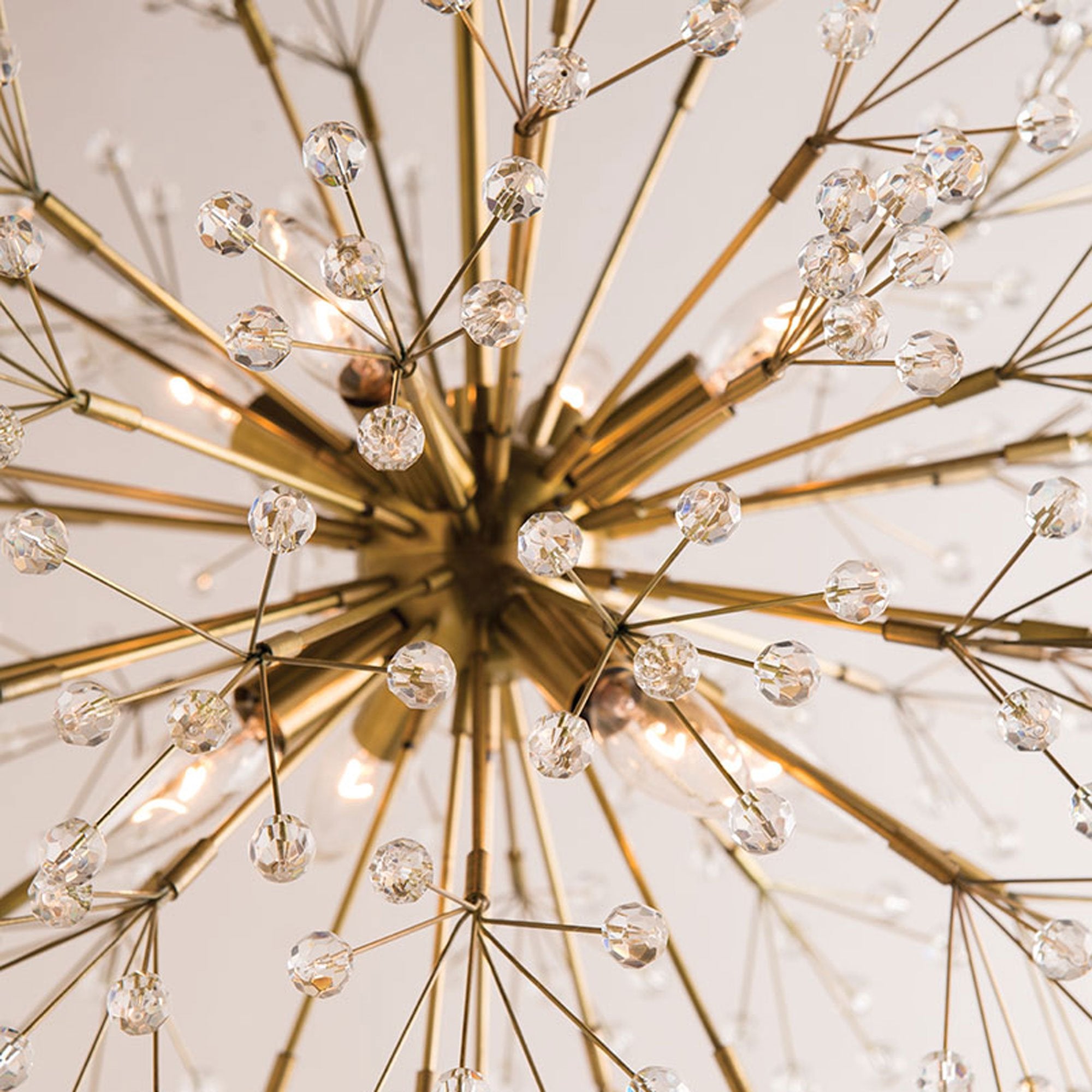 The earthly and the extraterrestrial combine in this beautiful, branching family. Faceted crystal spheres bedazzle at the end of every branch, luminously refracting the light. Like a star being born, Dunkirk is at once organic and out of this world. When Sarfatti designed the first chandelier that launched the Sputnik-style craze, it had been fireworks he was trying to emulate. There is something both of the firework exploding and the fixtures Sarfatti inspired in this opulent piece.