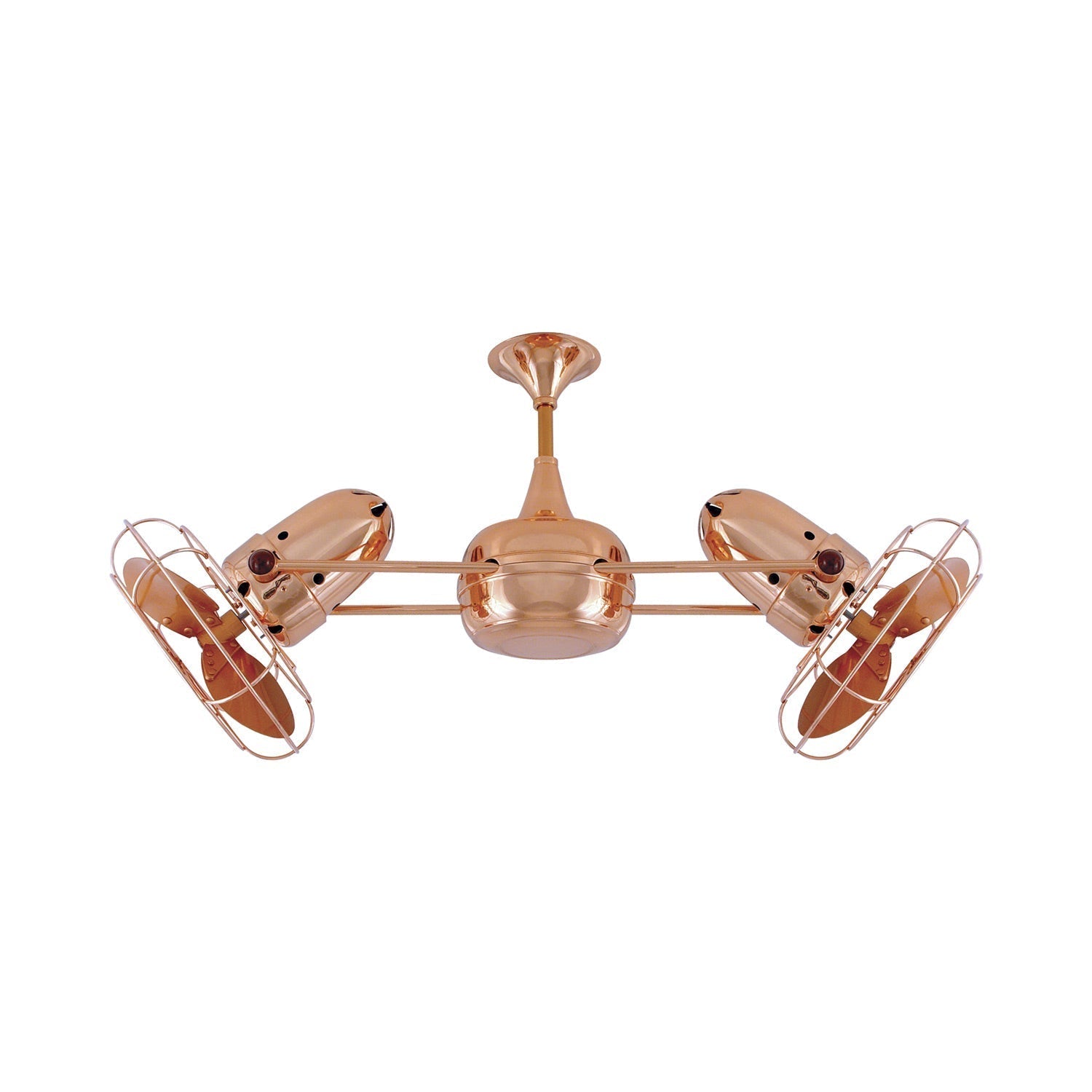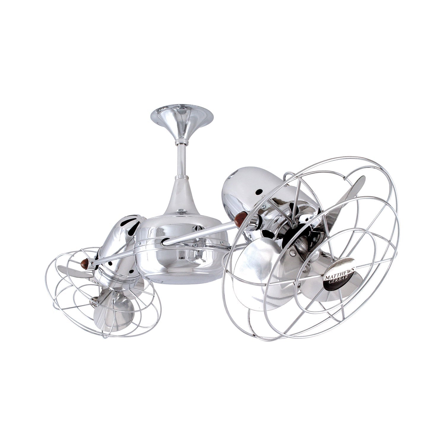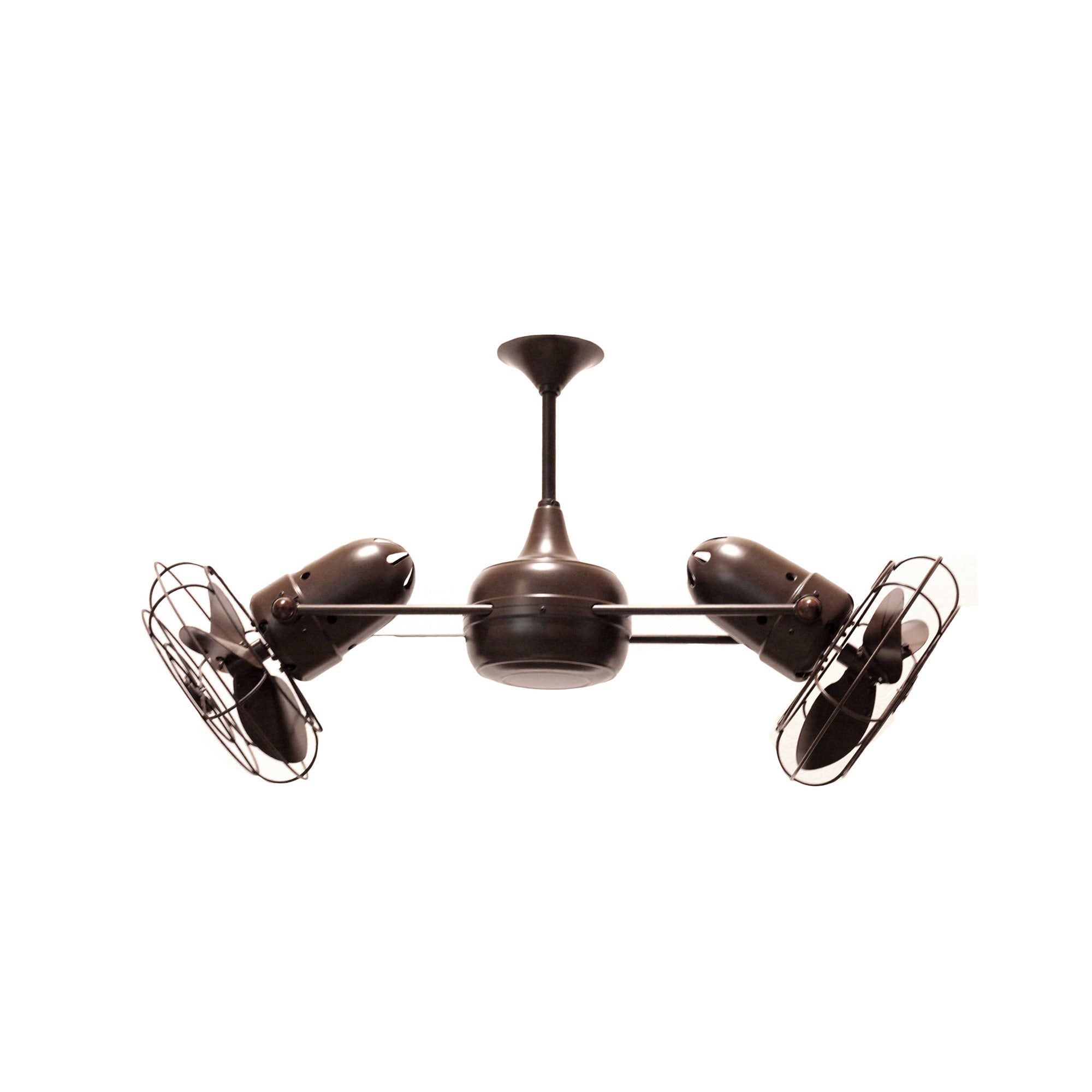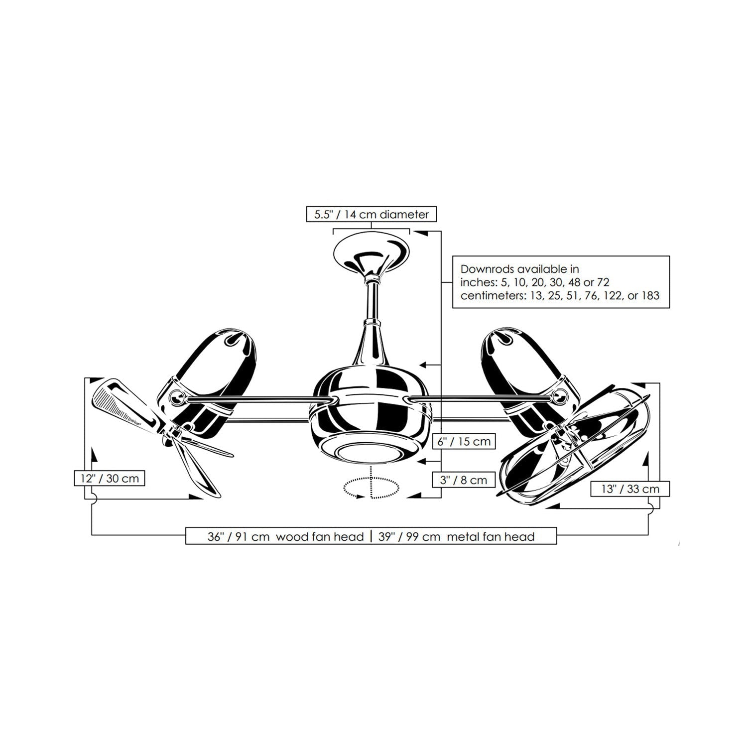 Few designs can match the timeless and sophisticated aesthetic of the Duplo-Dinamico Indoor / Outdoor Ceiling Fan from Matthews Fan Company. Other manufacturers have tried to reproduce this unique design, though all have proven to be of lesser quality and durability. The fan heads can be infinitely positioned in 180-degree arcs for optimum air movement; the greater the angles of the motors to the horizontal support rods (up or down), the faster the axial rotation. A slow, controlled axial rotation is achieved by both fan head position and fan blade speed.