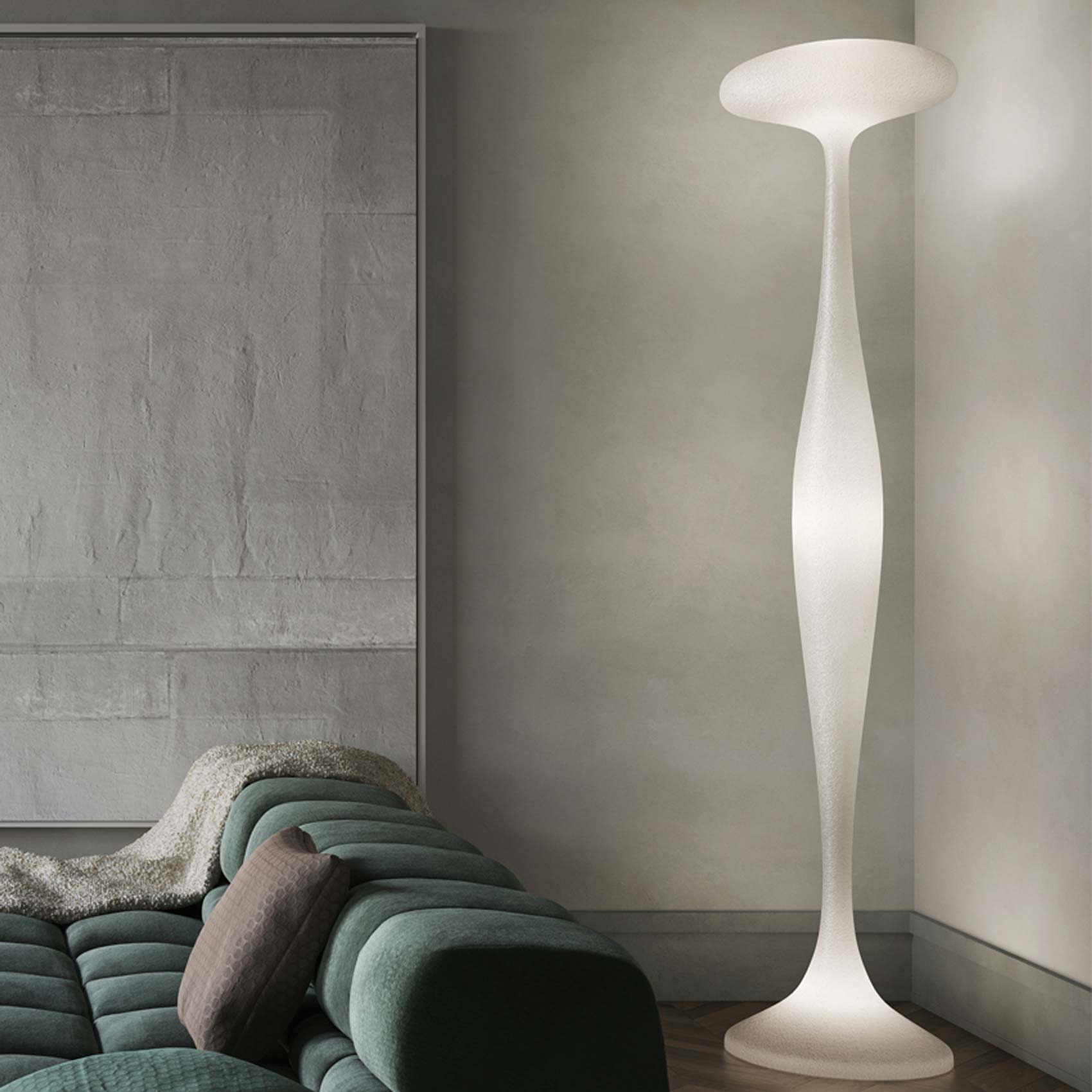 Push the envelope on modular contemporary design with the E.T.A. Floor Lamp from KDLN. An elaborately fluid, curved silhouette stands out in a body with a mushroom-like top. Light diffusers up and down its shapely build are hand made with ecological fiberglass and feature metallic interior structures, as dimming functions deliver mood lighting on demand.