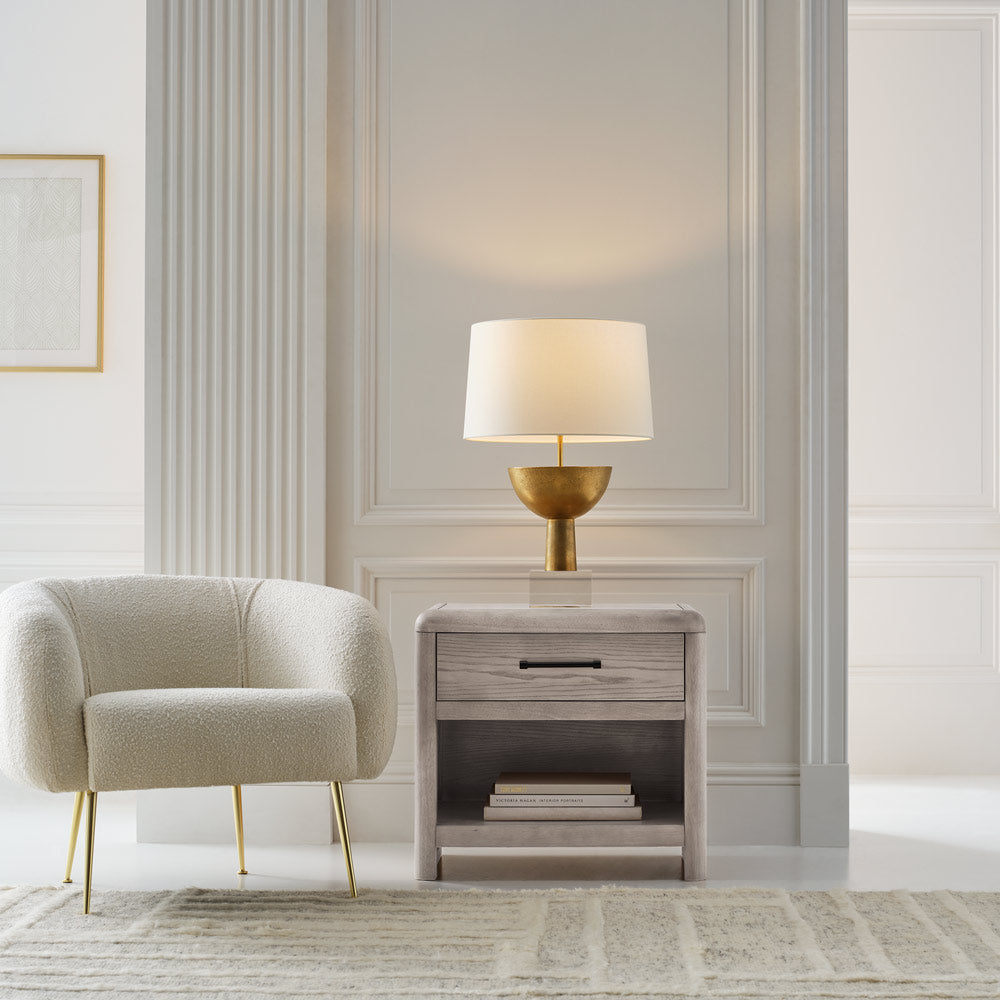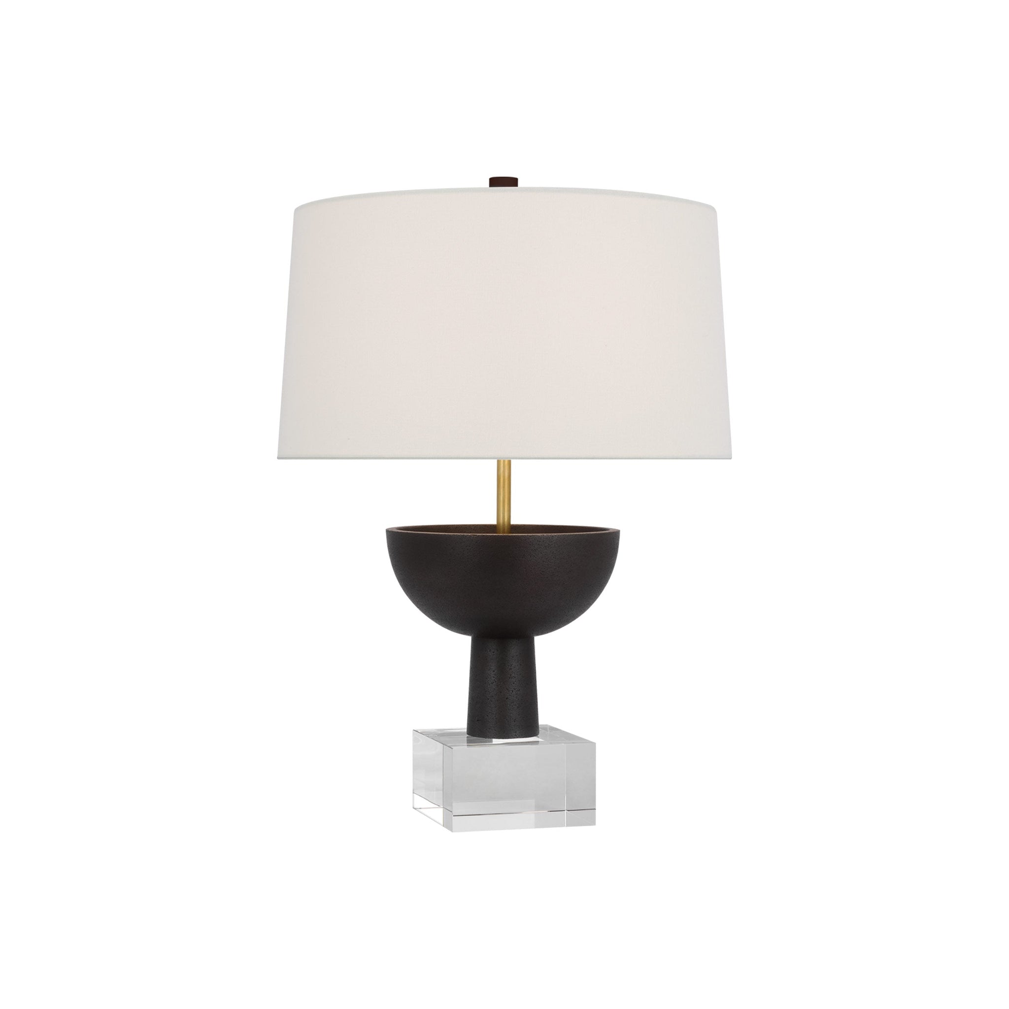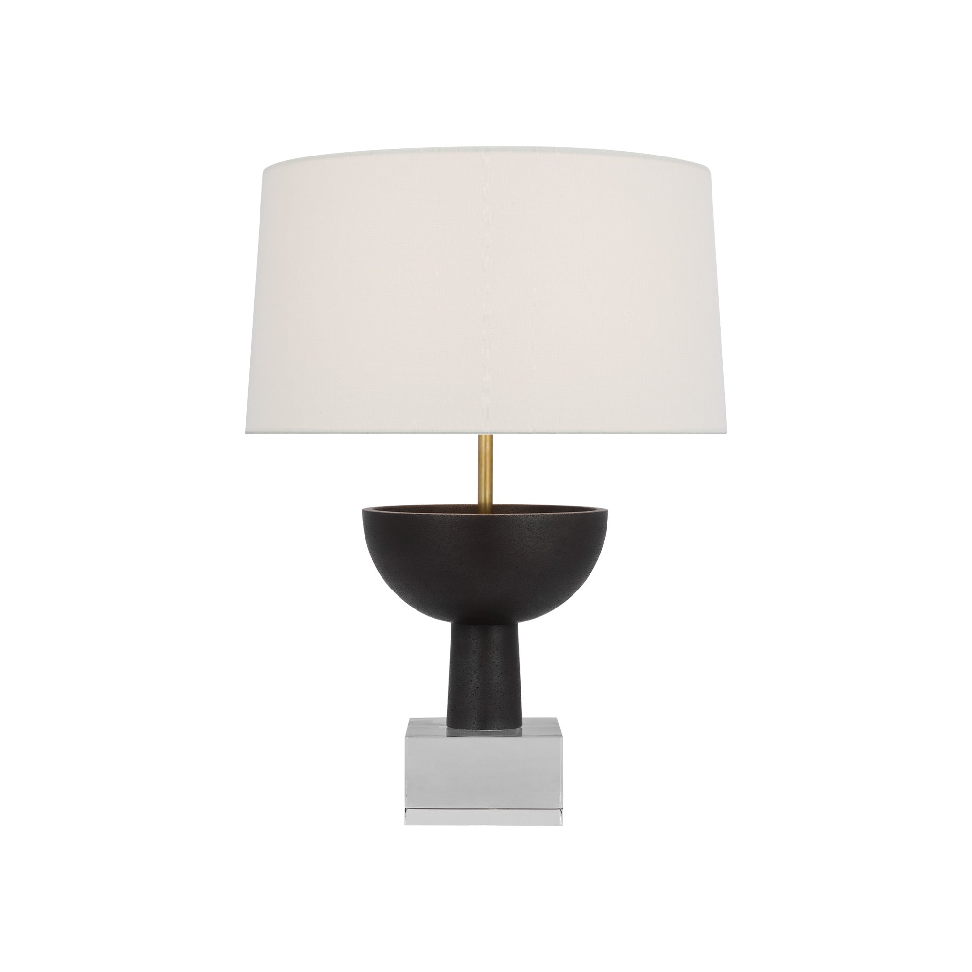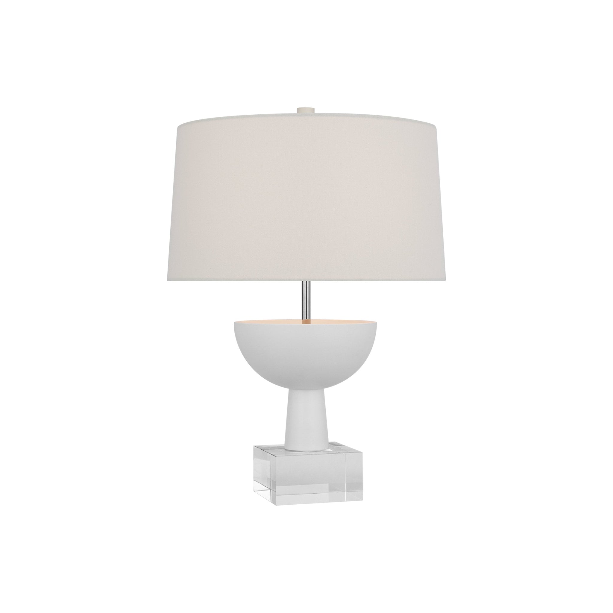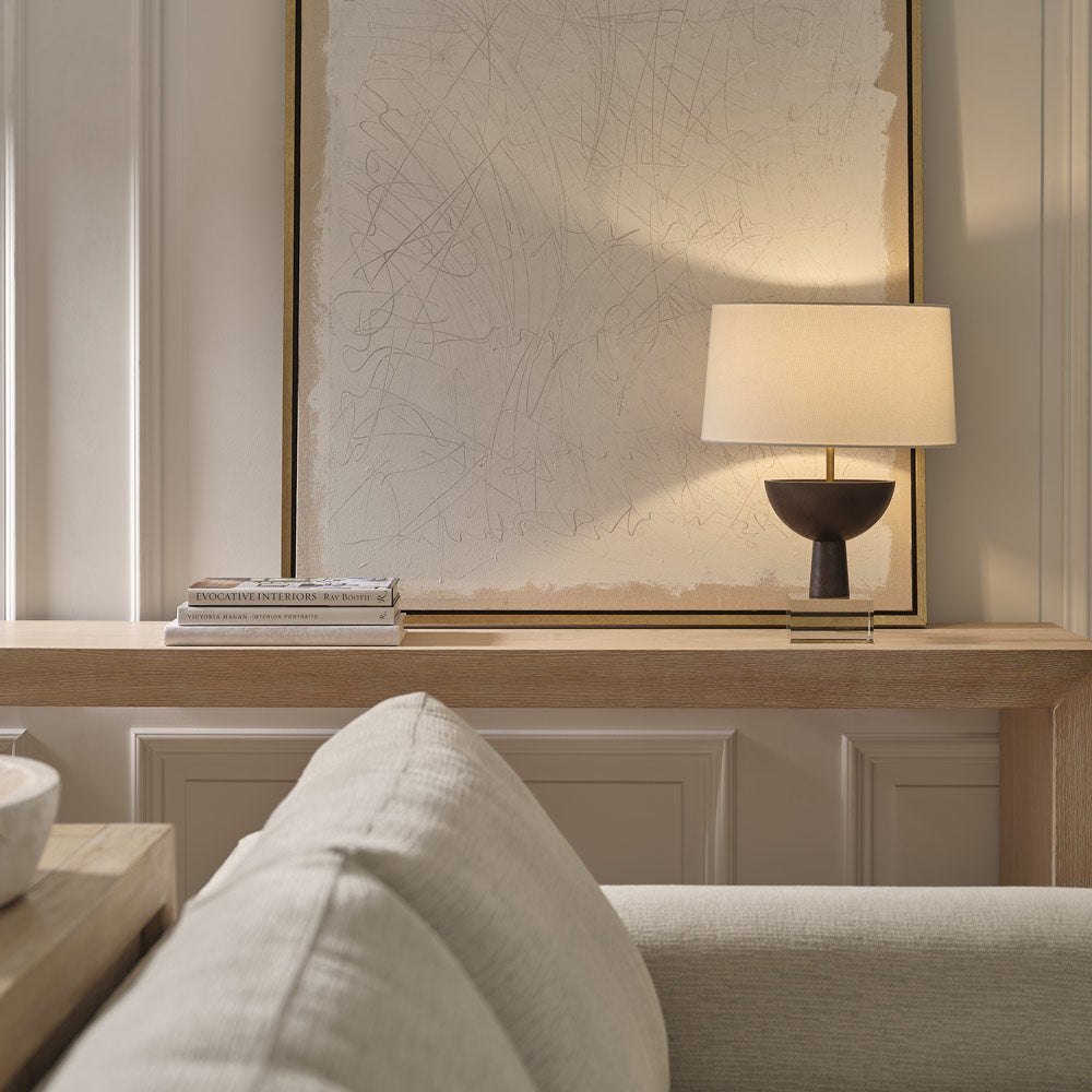 Tempting architectural and artisanal elements converge to create a true work of gallery style. The Eadan Table Lamp from Visual Comfort Signature becomes an enticing décor entry in a sophisticated setting, offering a shapely and classic silhouette of ceramic on a block acrylic base. Metal accents and a generous shade offer a significant upgrade to existing lighting.
