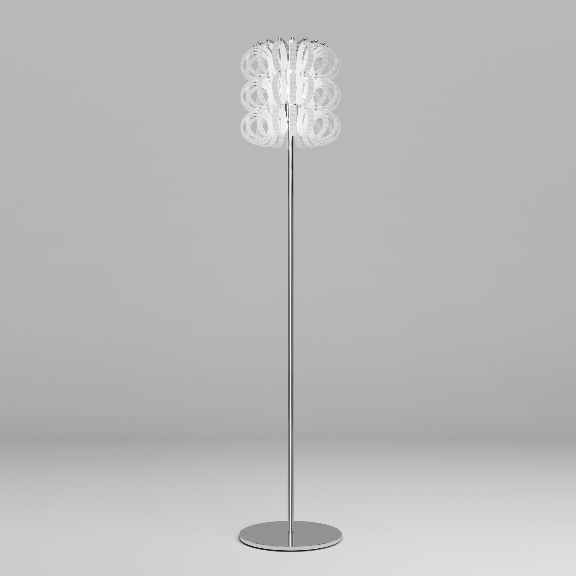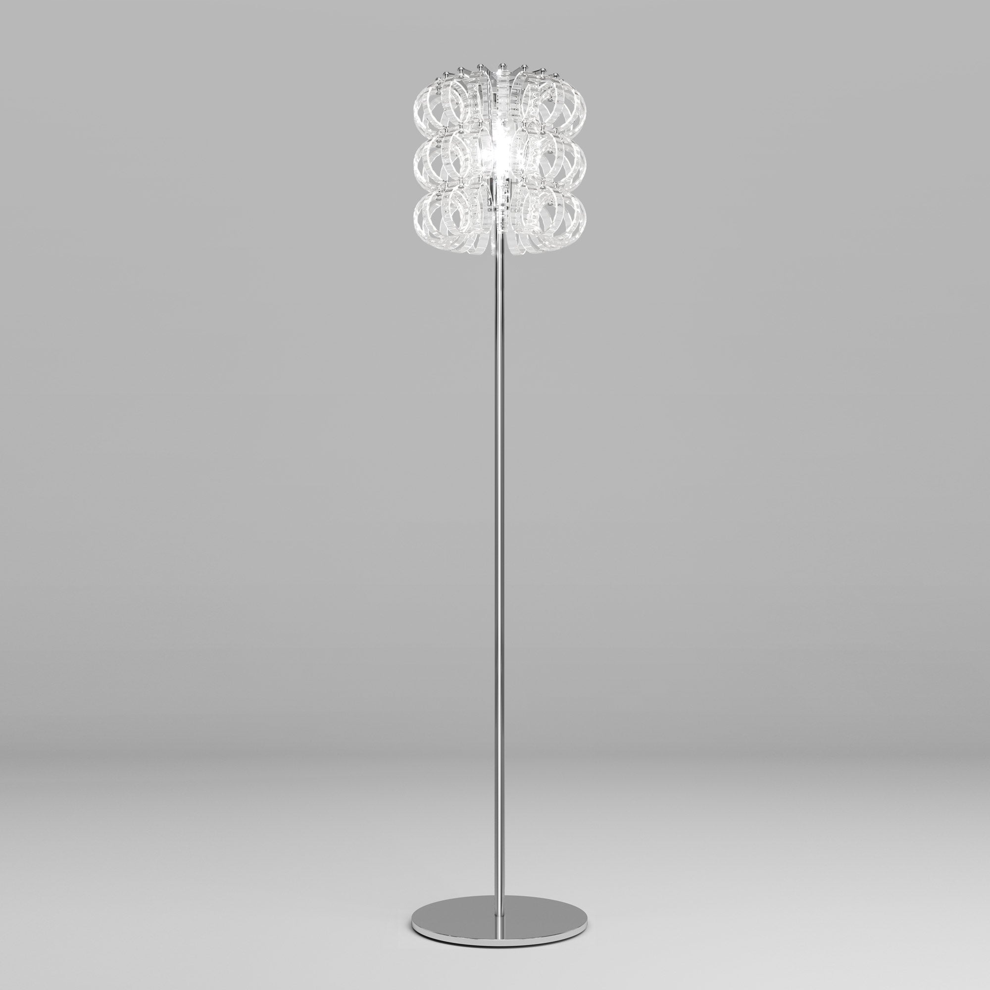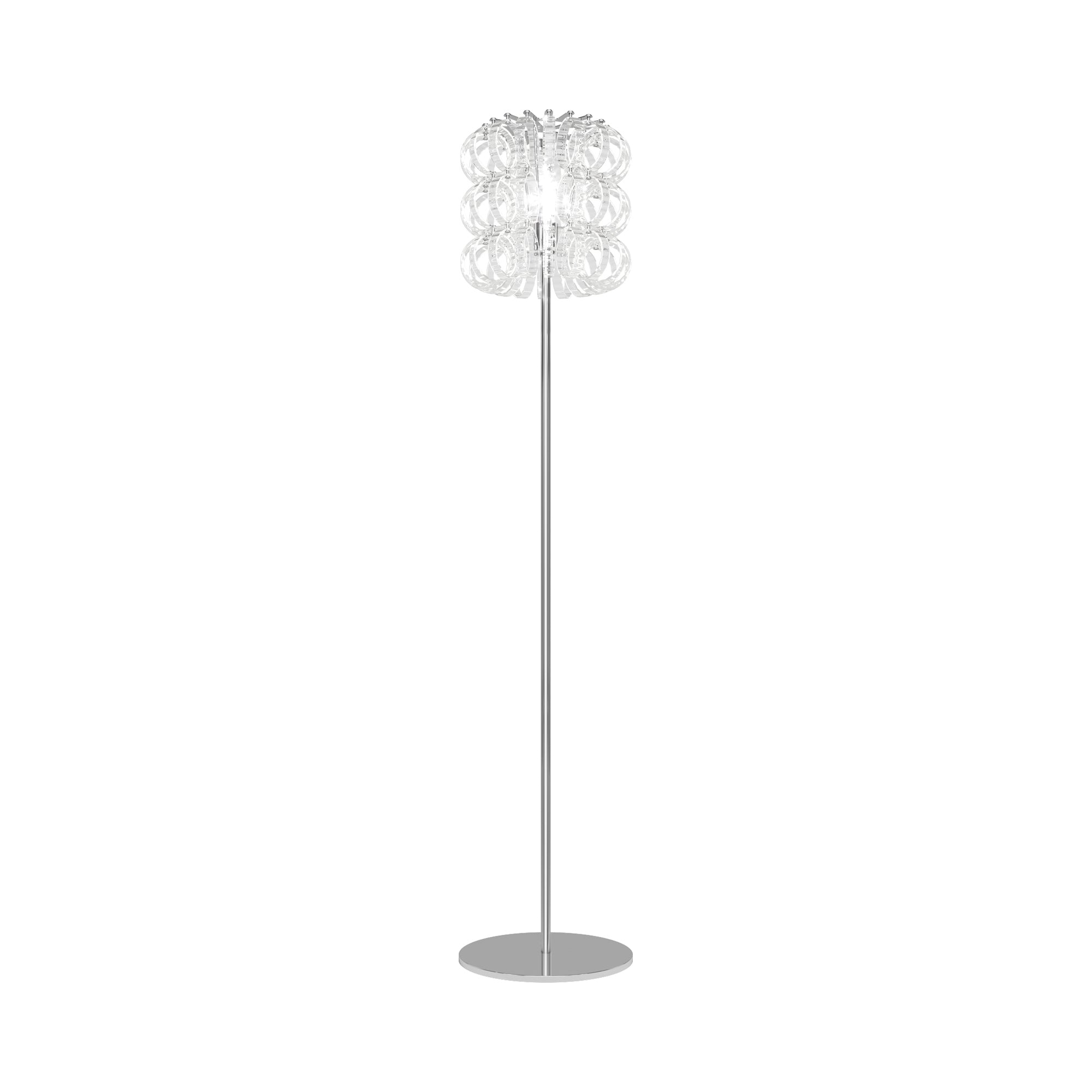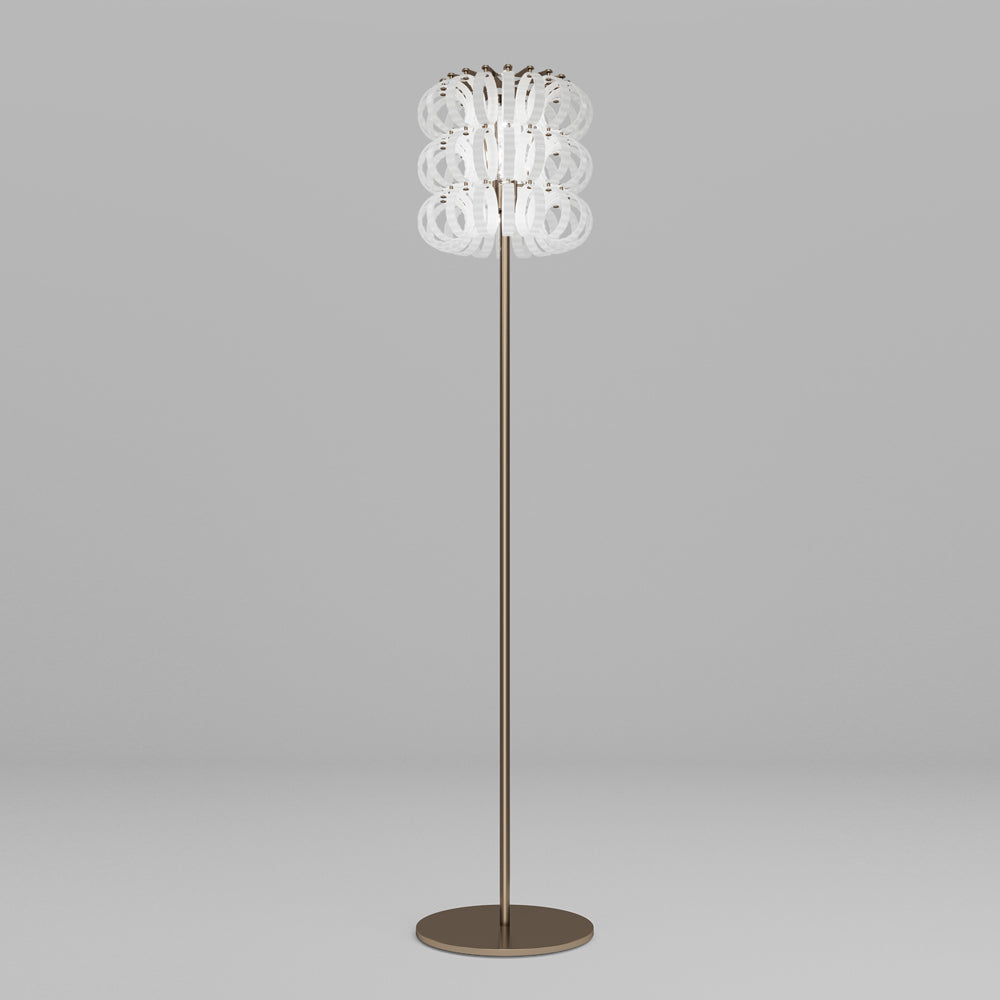 Festive loops of spiraling glass form a captivating reflector shade to this magnificent floor lamp, offering a visually impacting aesthetic with gallery-inspired artistry. The Ecos Floor Lamp from Vistosi embellishes a custom space with delicate glass in a symmetrical layered pattern, creating an inspired reflection of ambient lighting ideal for a custom living room or bedroom.