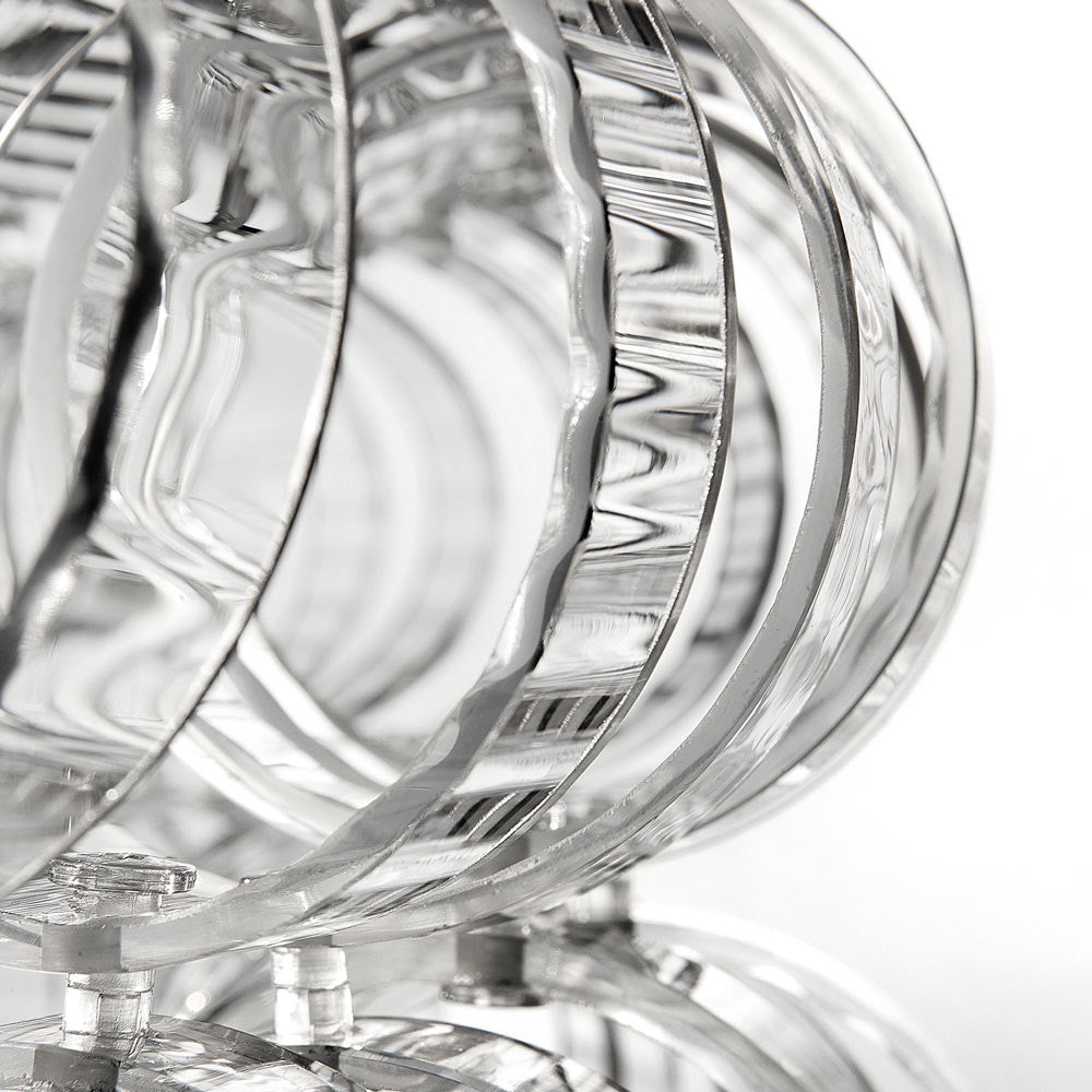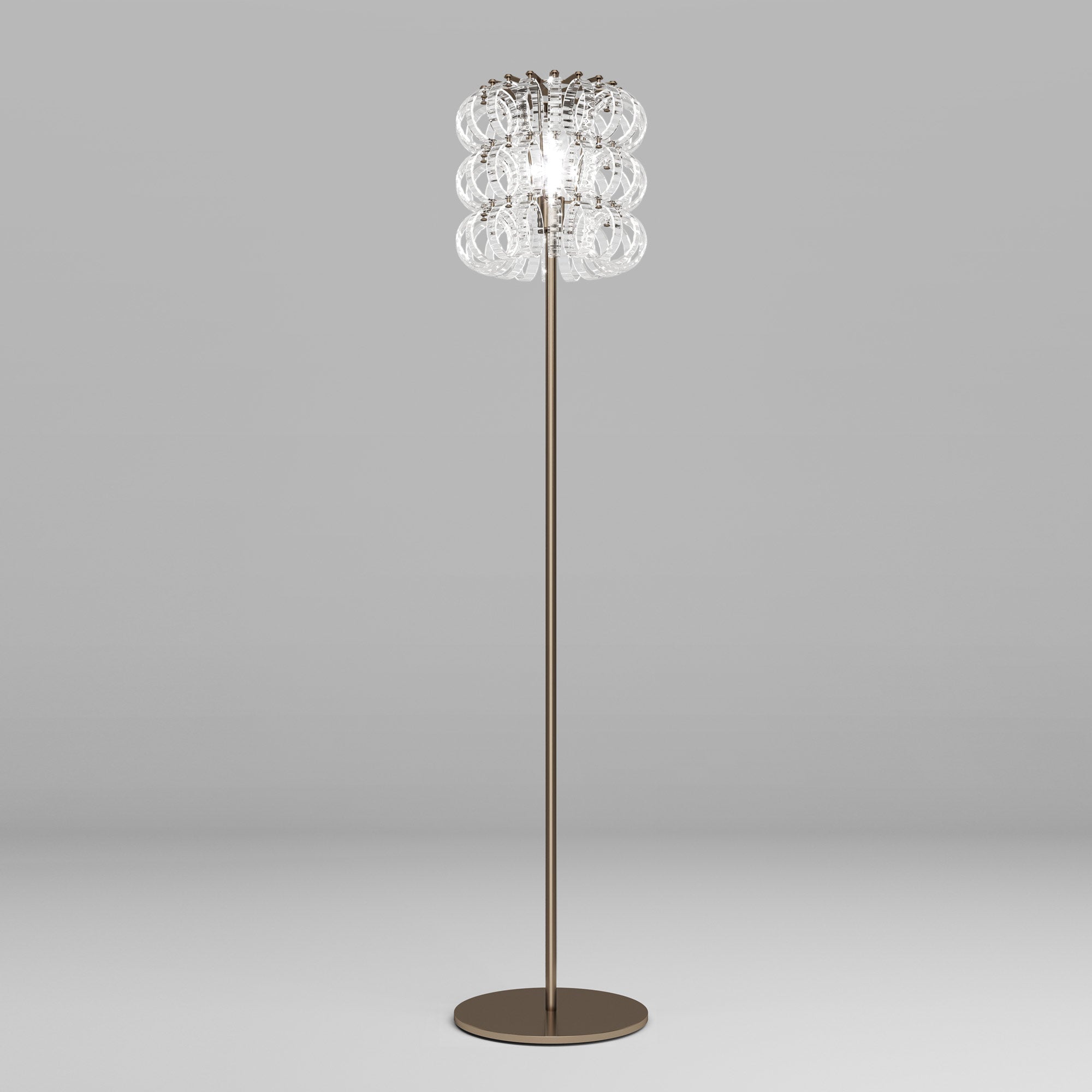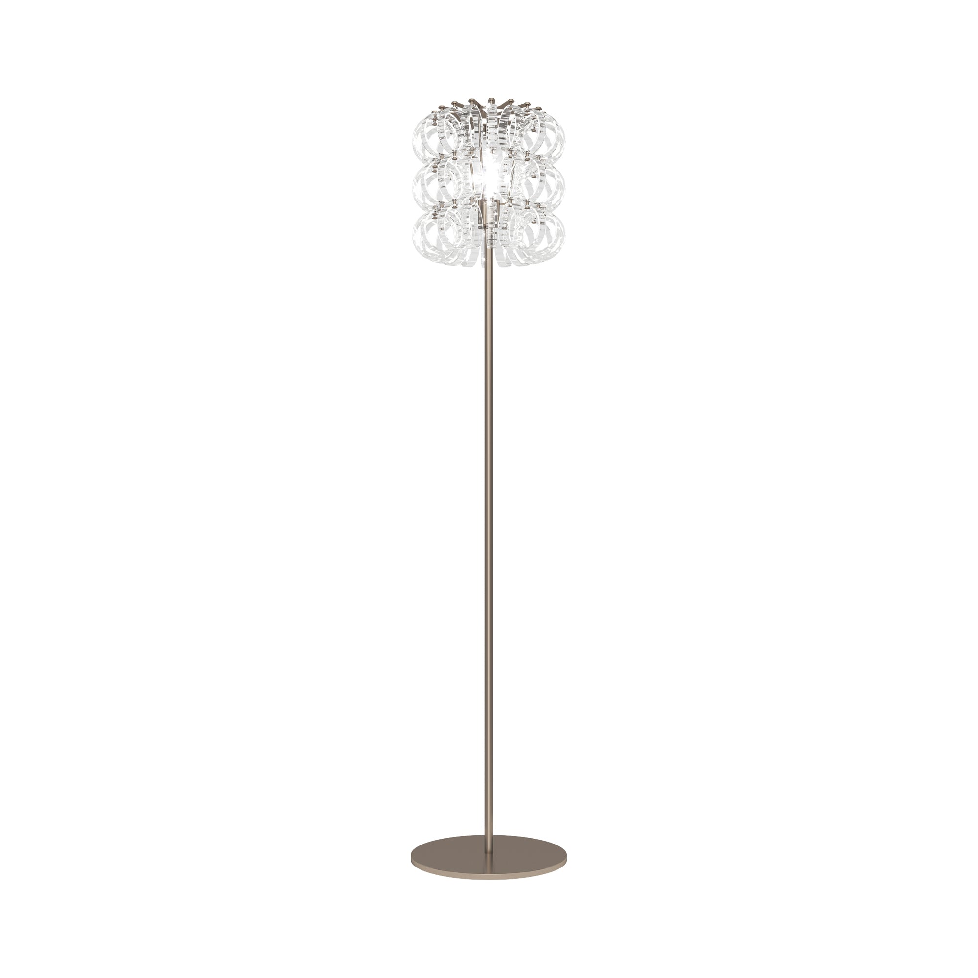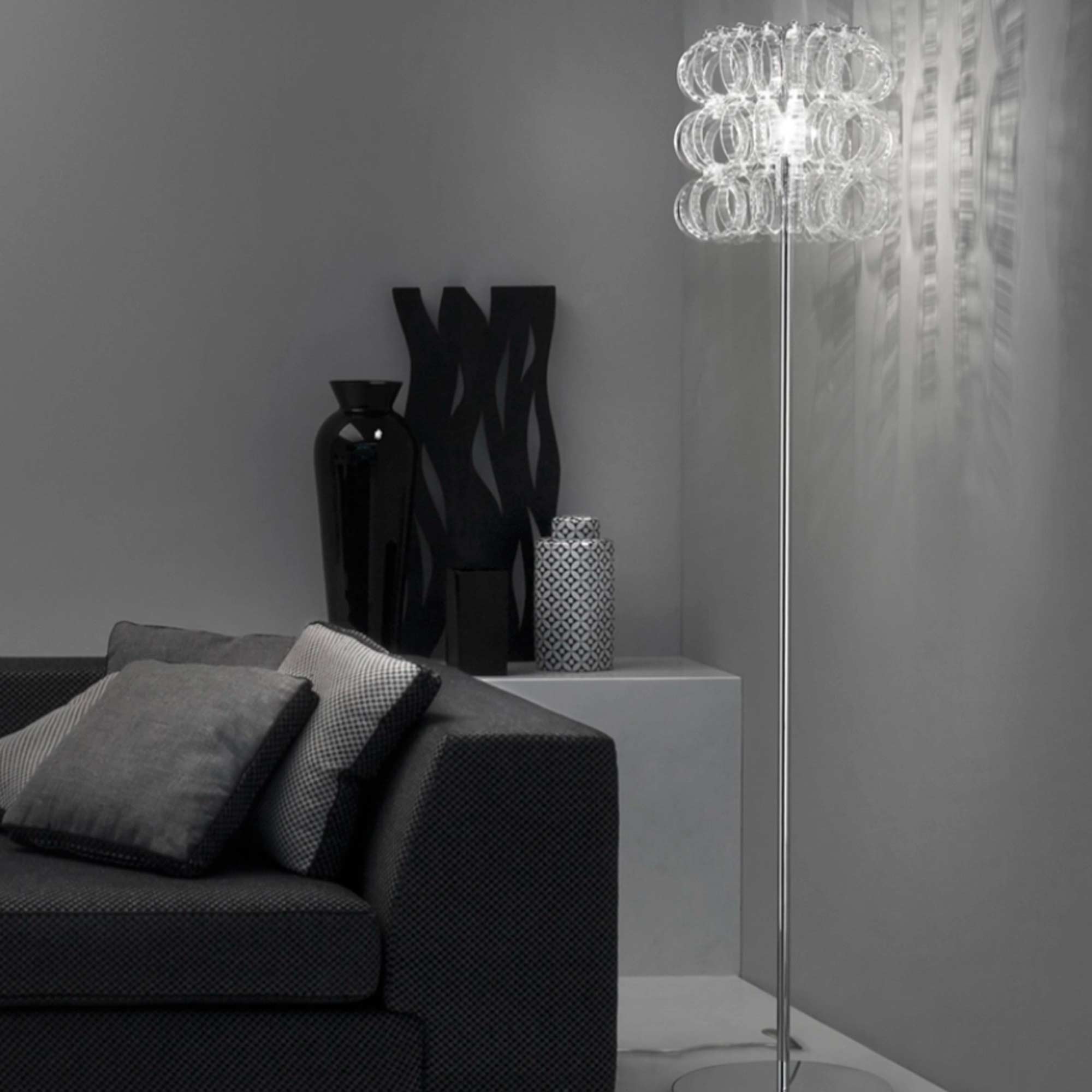 Festive loops of spiraling glass form a captivating reflector shade to this magnificent floor lamp, offering a visually impacting aesthetic with gallery-inspired artistry. The Ecos Floor Lamp from Vistosi embellishes a custom space with delicate glass in a symmetrical layered pattern, creating an inspired reflection of ambient lighting ideal for a custom living room or bedroom.