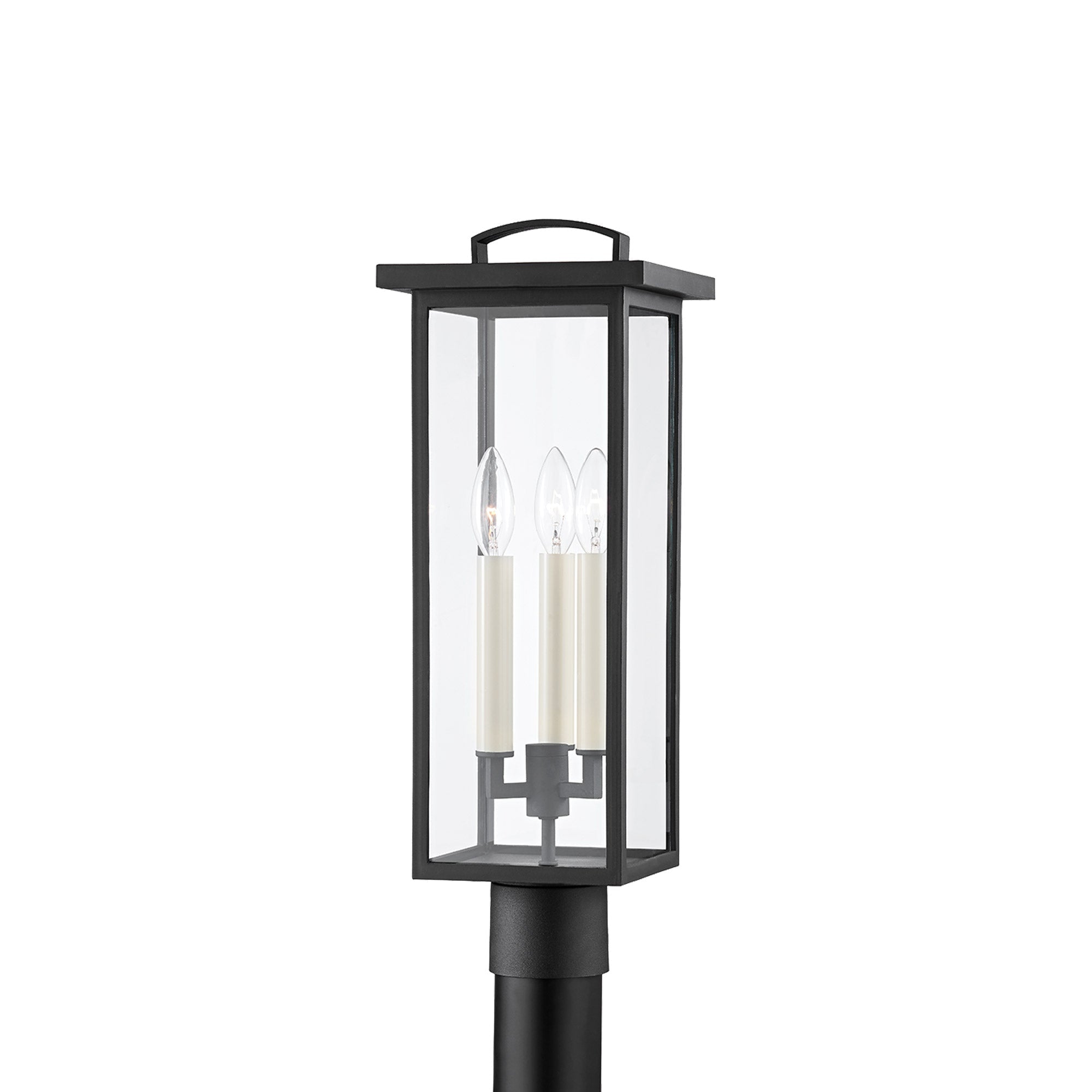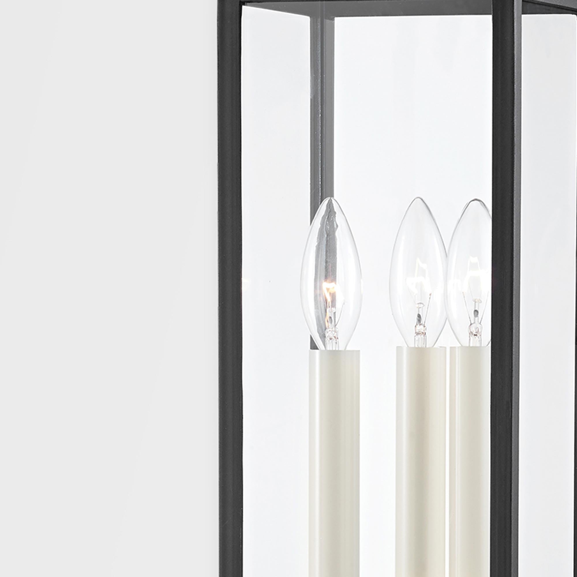 Clean design elements offer a sophistication to village-inspired charm, adding industrial inspiration with soft, romantic candlelight bulb mounts in the Eden Outdoor Post Light from Troy Lighting.