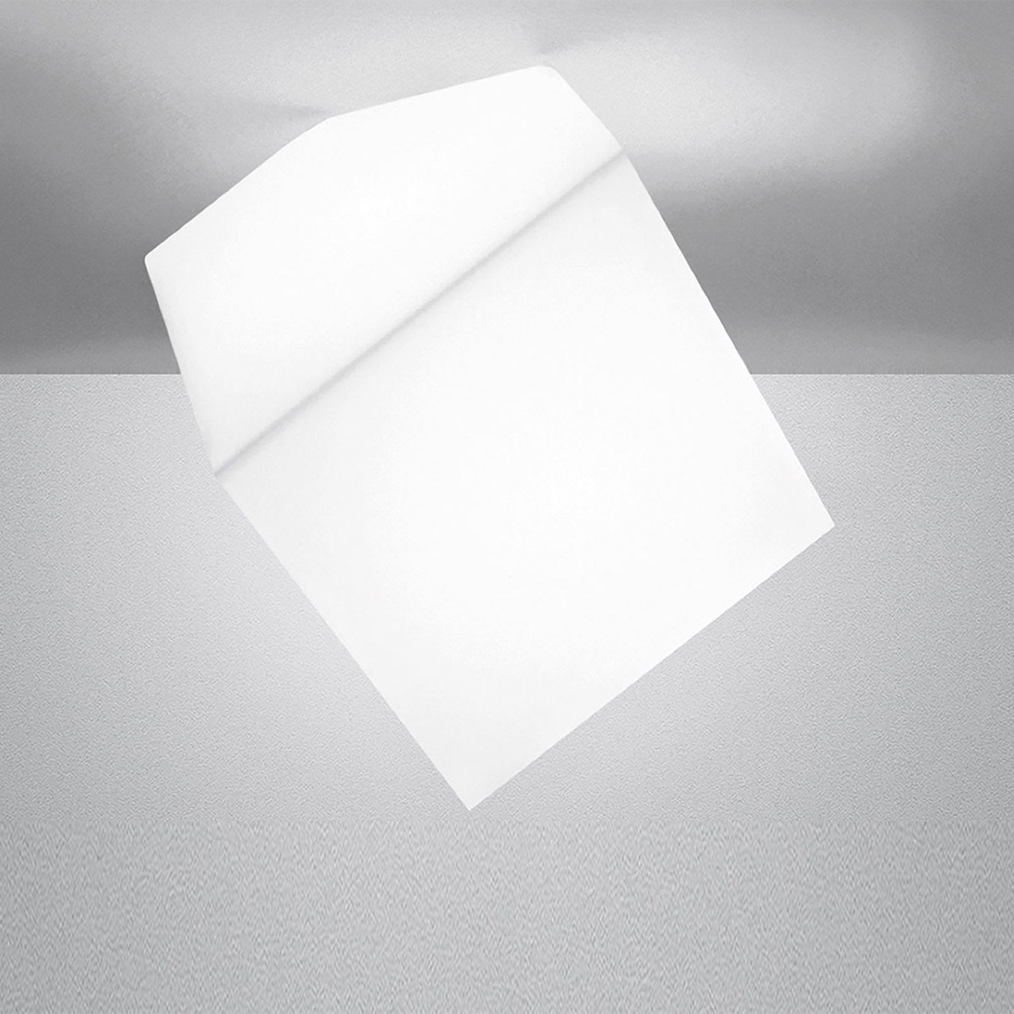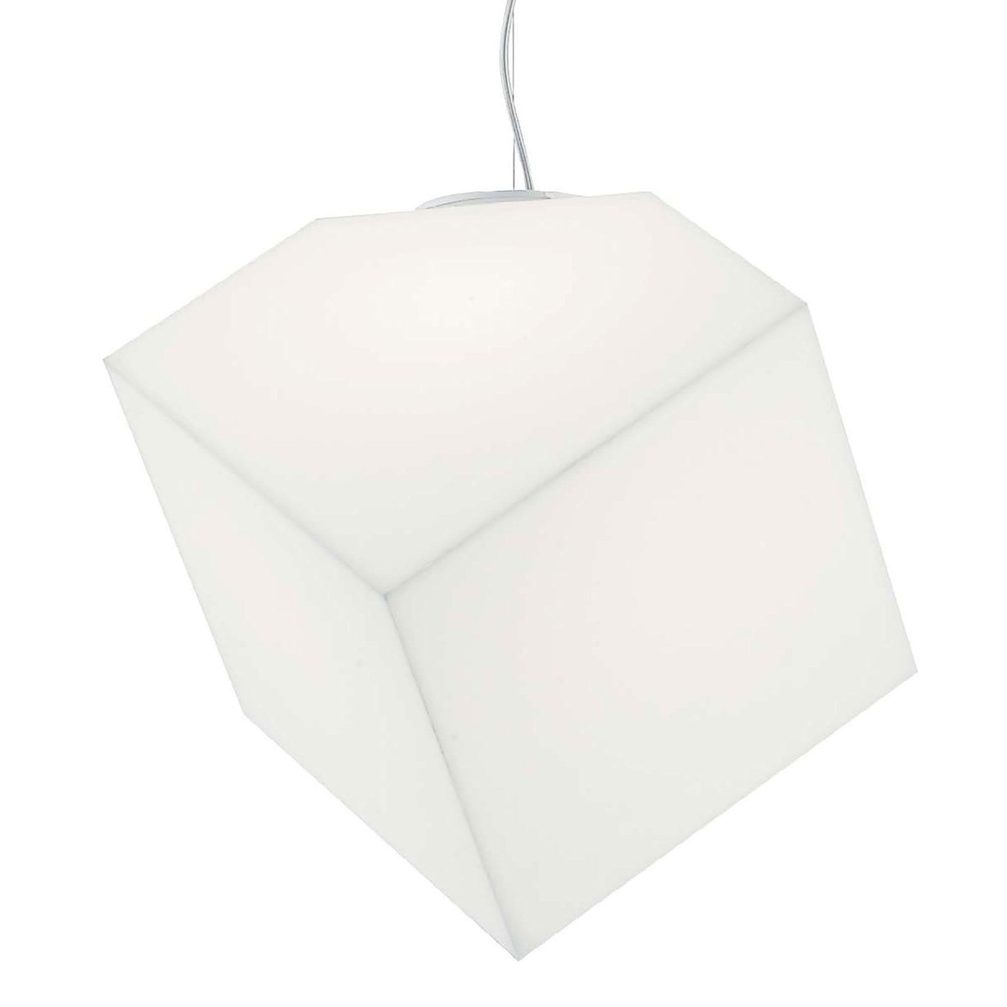 A suspended cube in a white finish glows when the contemporary Edge 30 Suspension Light from Artemide is illuminated.