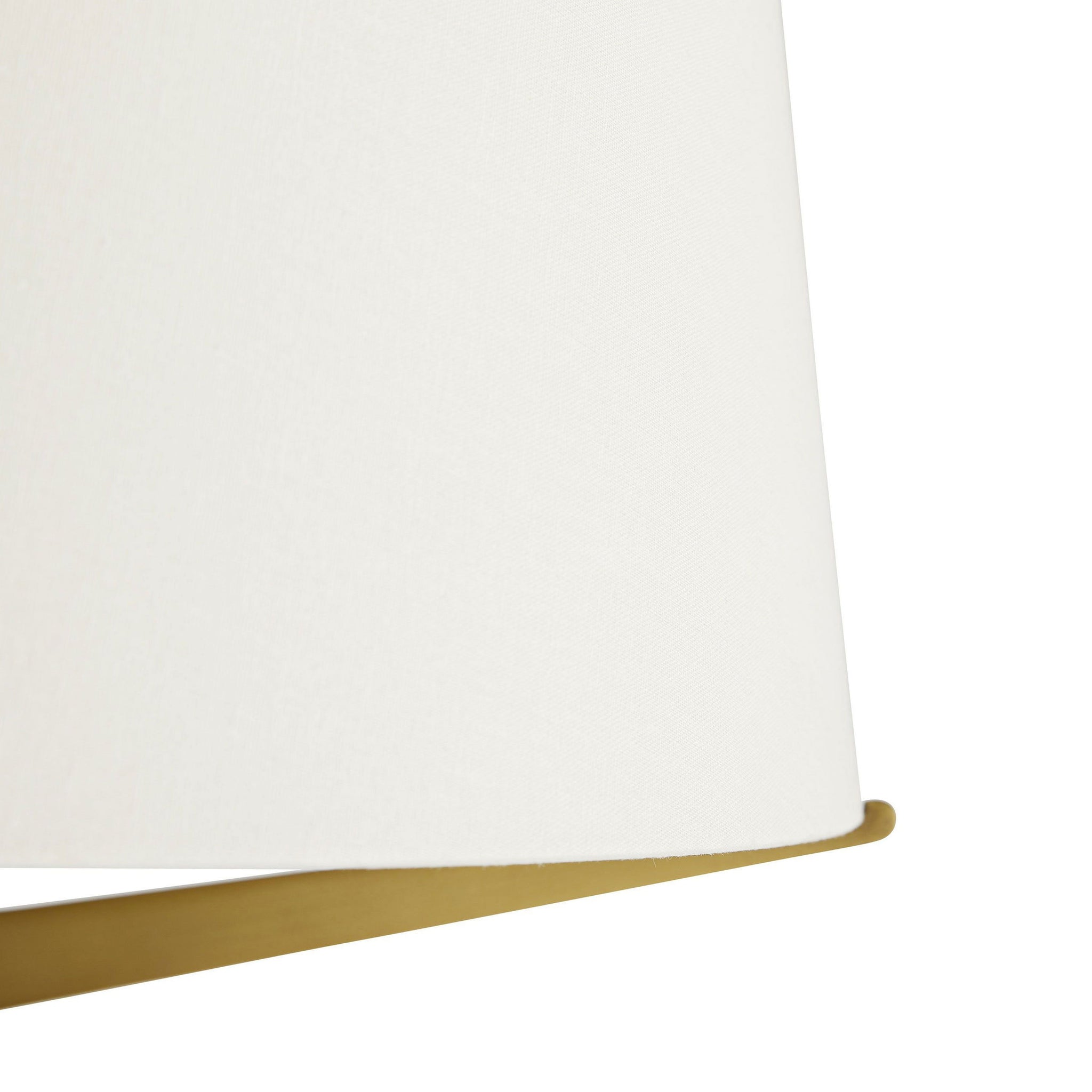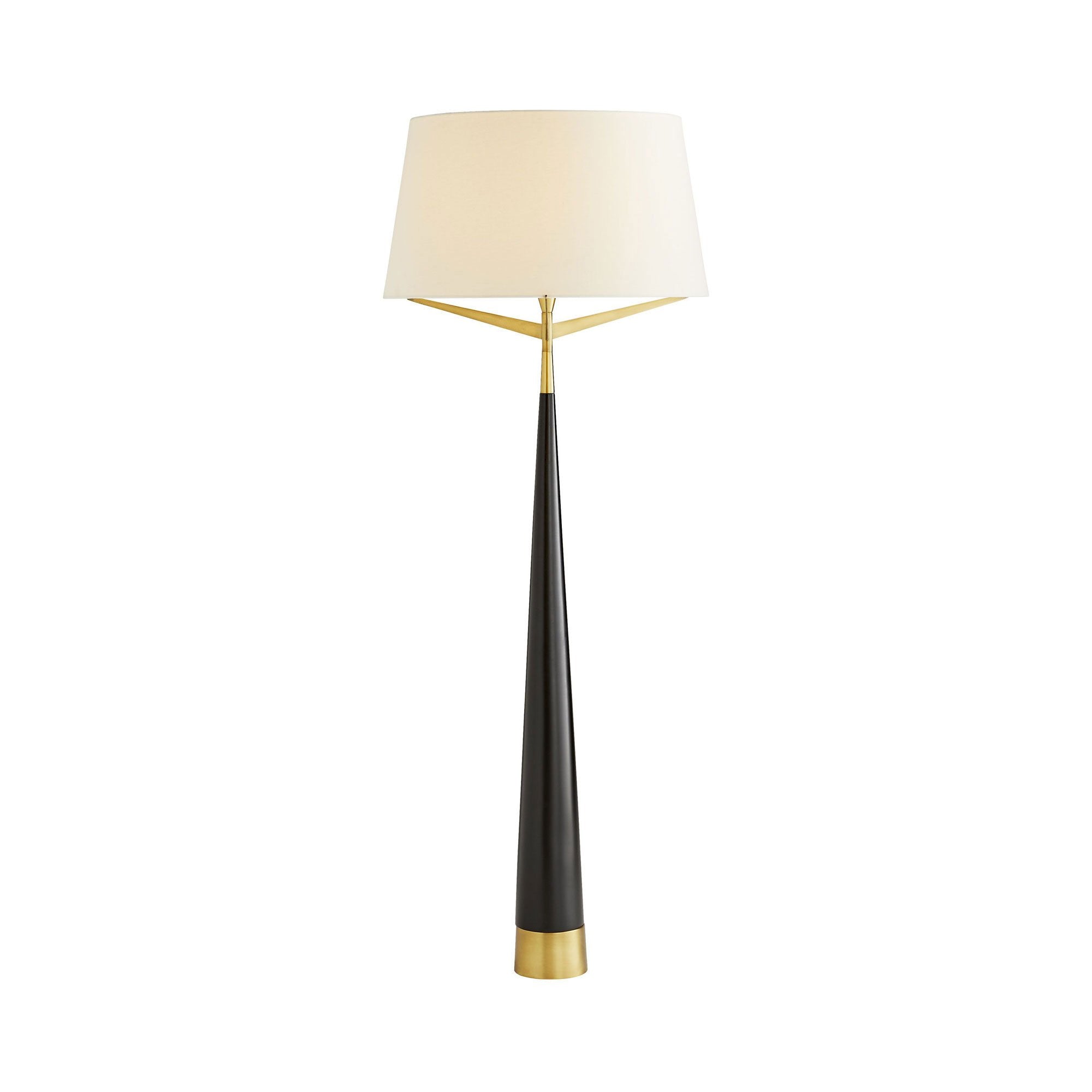 Simple and modern this cone-shaped floor lamp is made of resin finished in black and accented with antique brass. Topped with a unique spider-like frame that supports the white linen shade. No harp is needed for this lamp. Features a full-range dimmer switch on a black cotton cord.