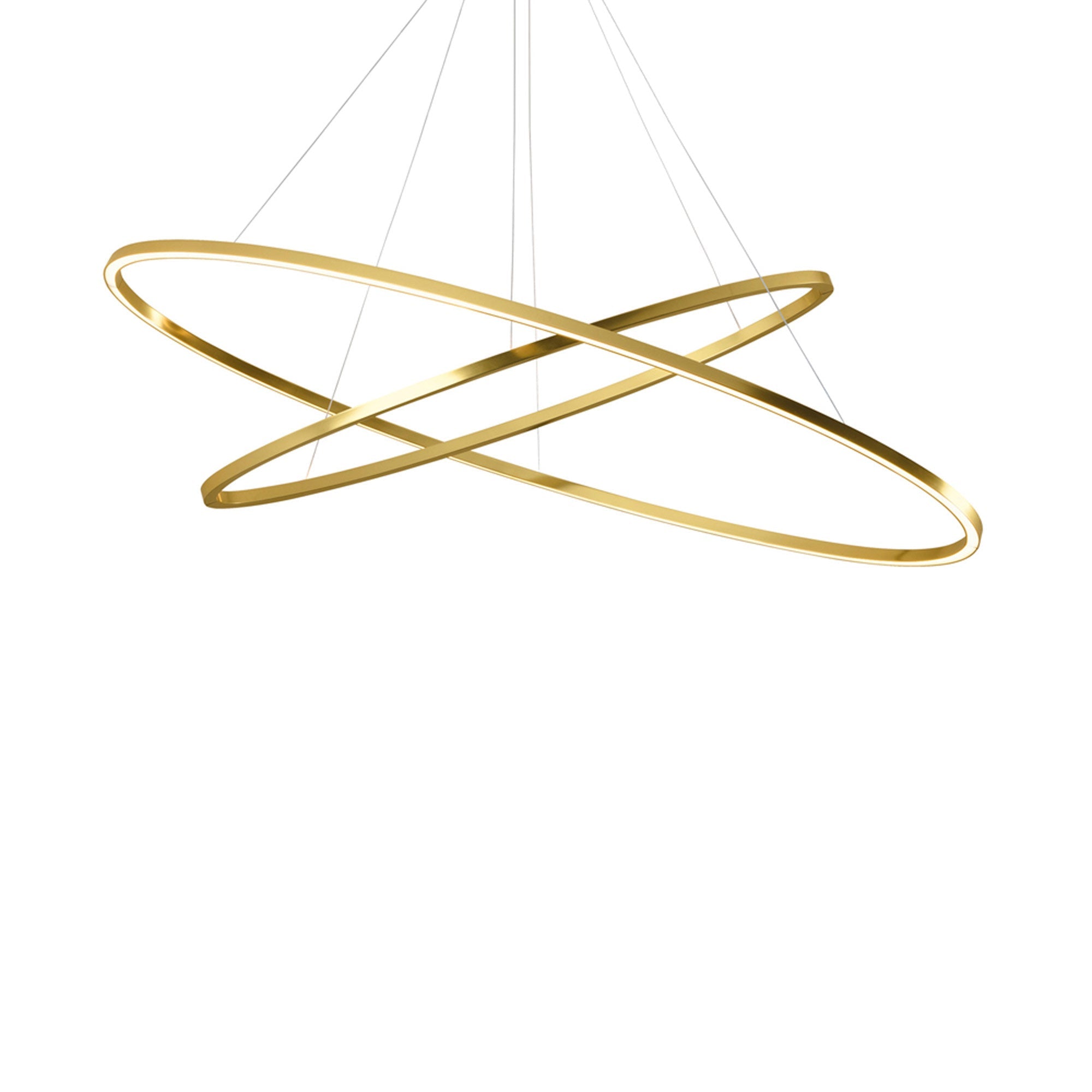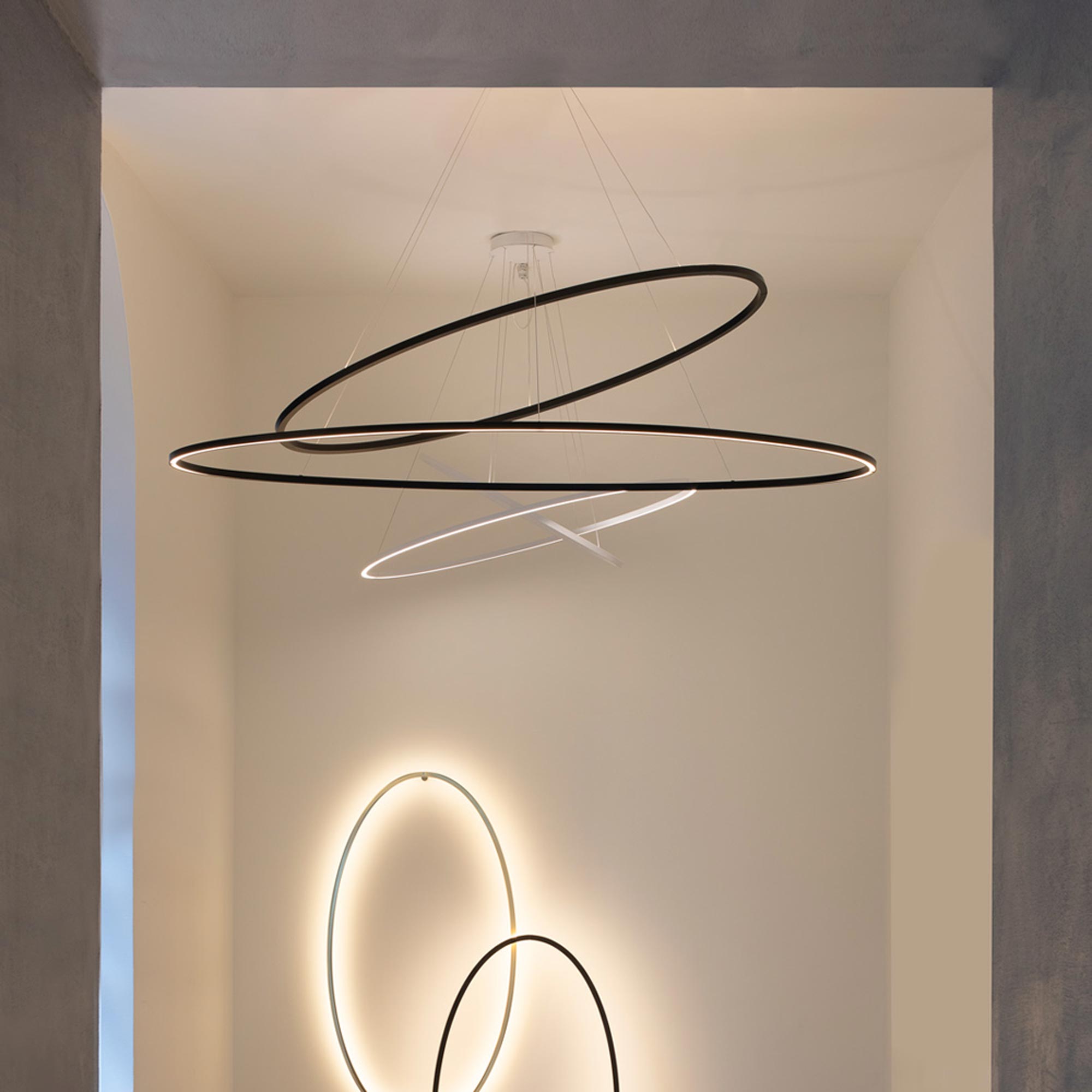 A pair of delicate aluminum halo-inspired frames couple to create intriguing mood lighting effects, as the Ellisse LED Double Pendant Light from NEMO becomes a focal point in a contemporary space. With the benefit of energy-efficient lighting, this gallery-inspired fixture infuses a floating sensation as it emits lighting from tilted rings lined with continuous opal diffusers.