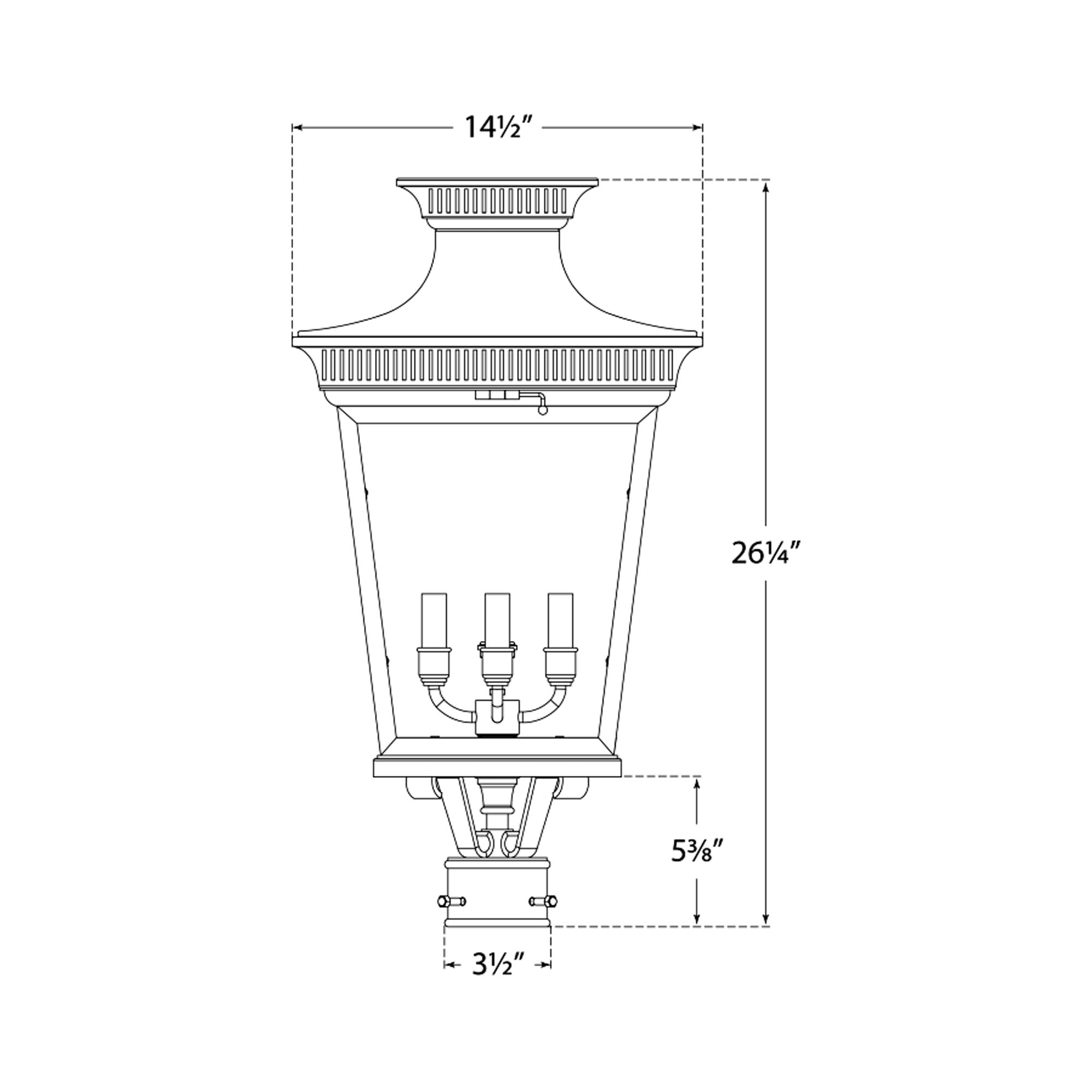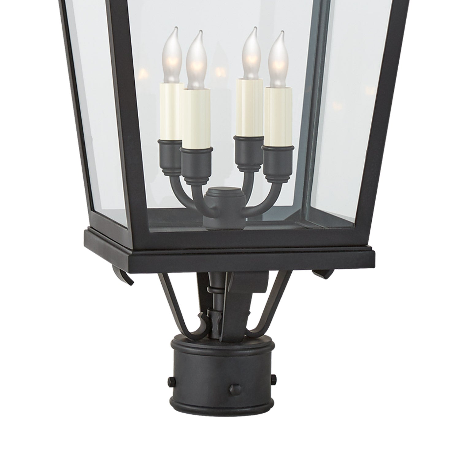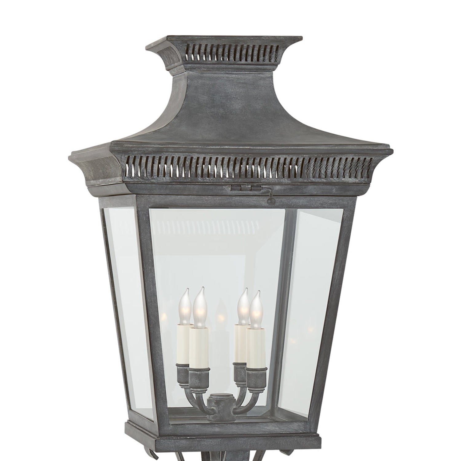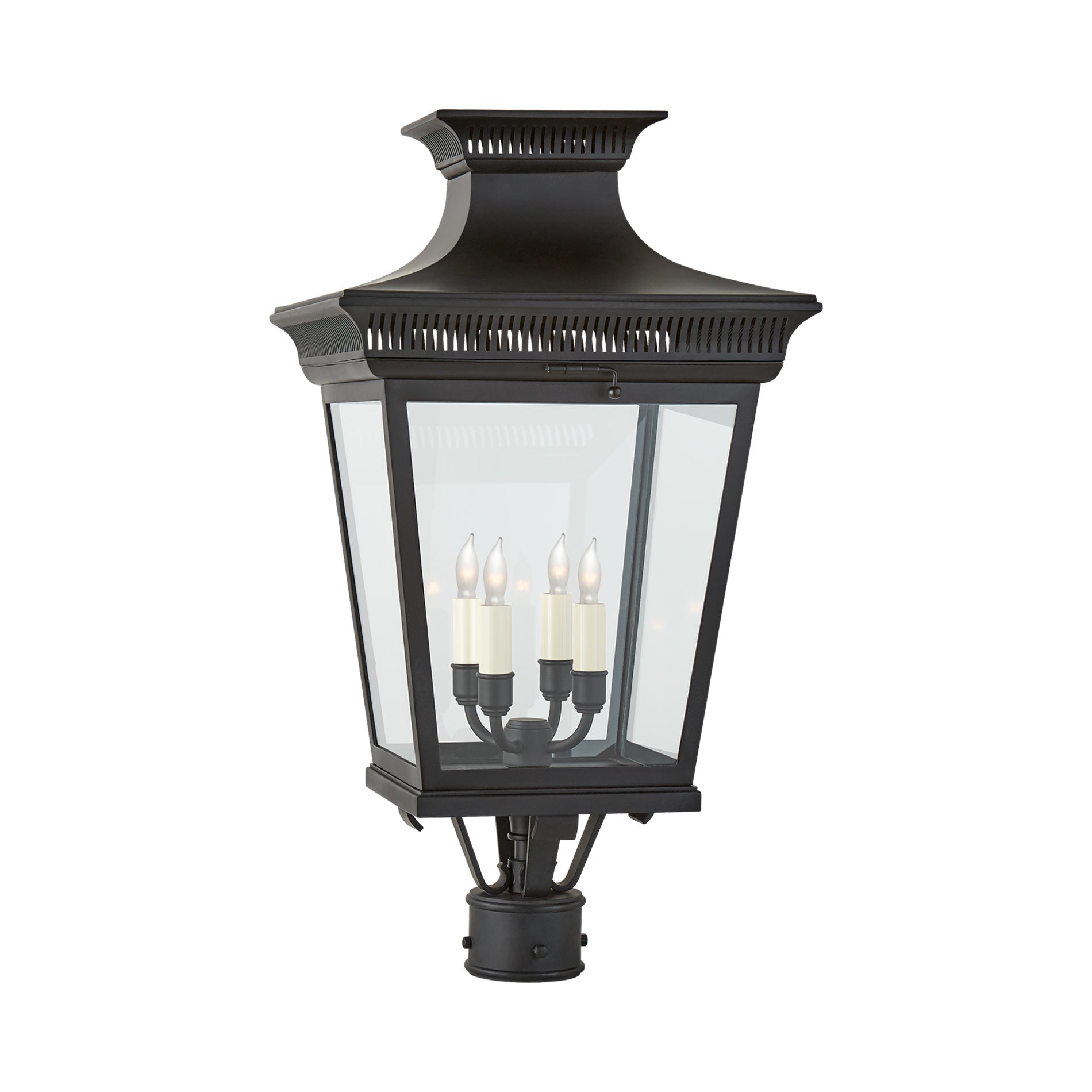 A subtle Asian pagoda motif shapes the artisanal elegance of a classic exterior fixture. Fashioned of metal with clear glass panels, the Elsinore Outdoor Post Light from Visual Comfort Signature elevates the sophistication of a garden or landscaped area, as candelabra bases offer a moody romantic theme.