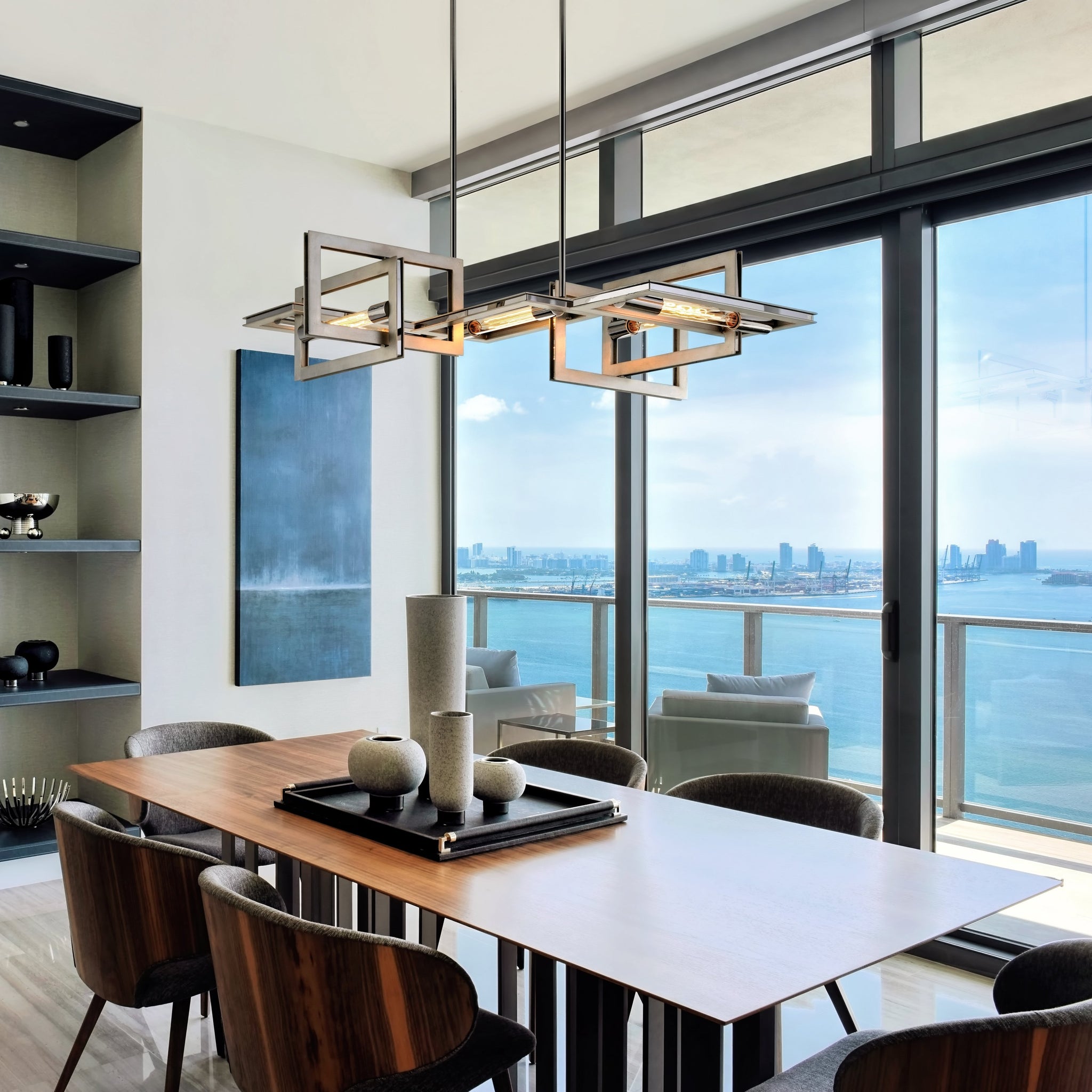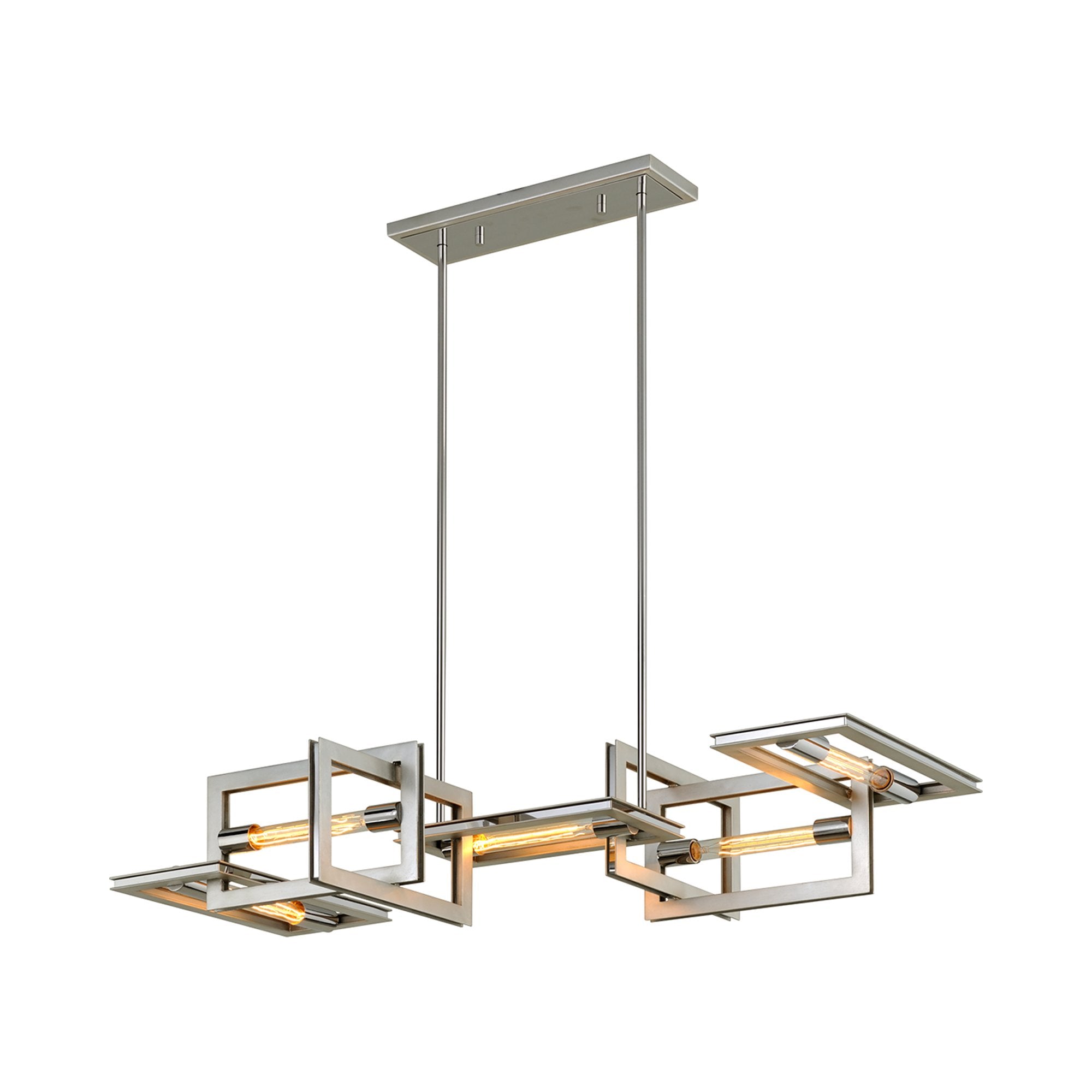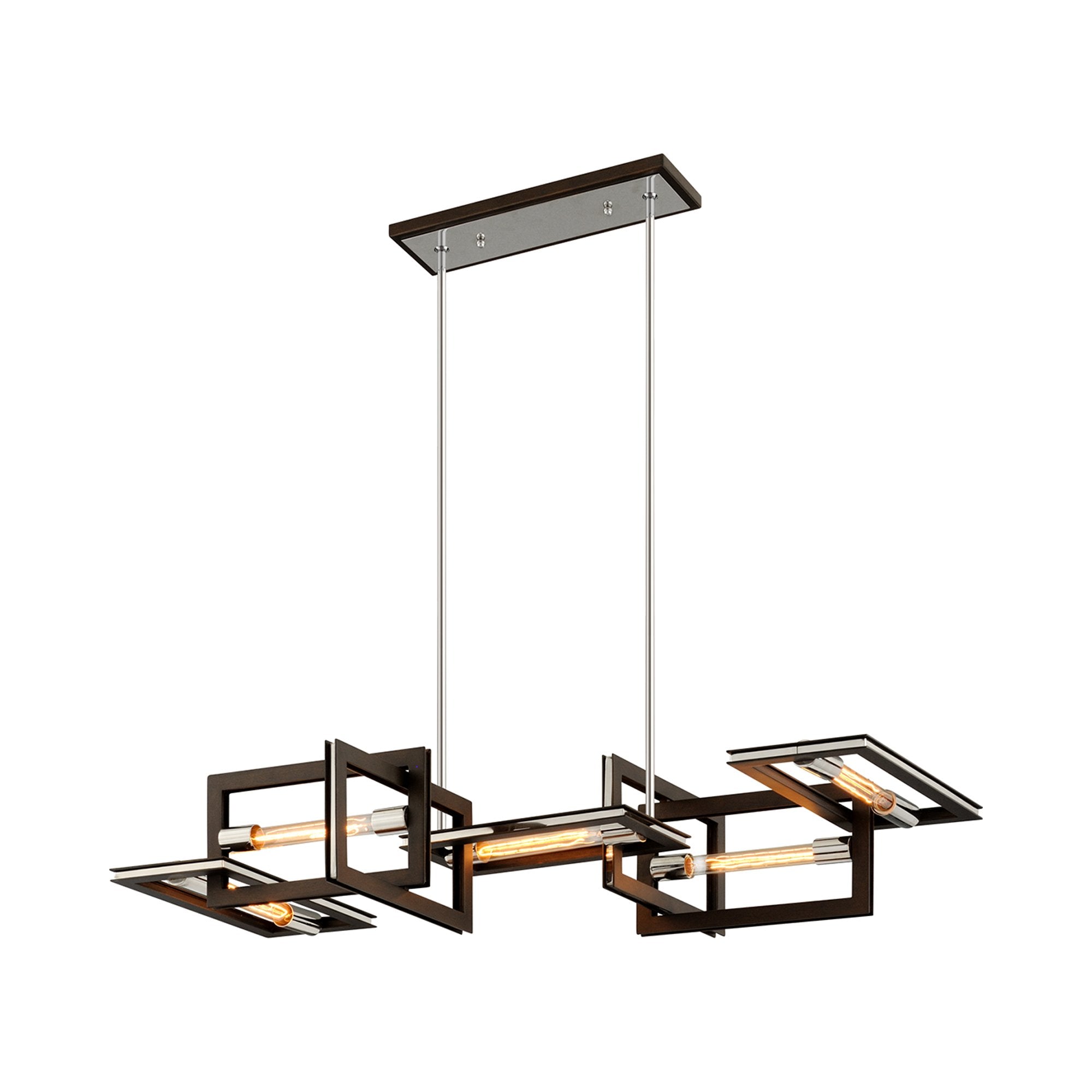 Tubes of glowing light bring a mysterious presence to the interlocking frames showcased in the Enigma Chandelier from Troy Lighting.