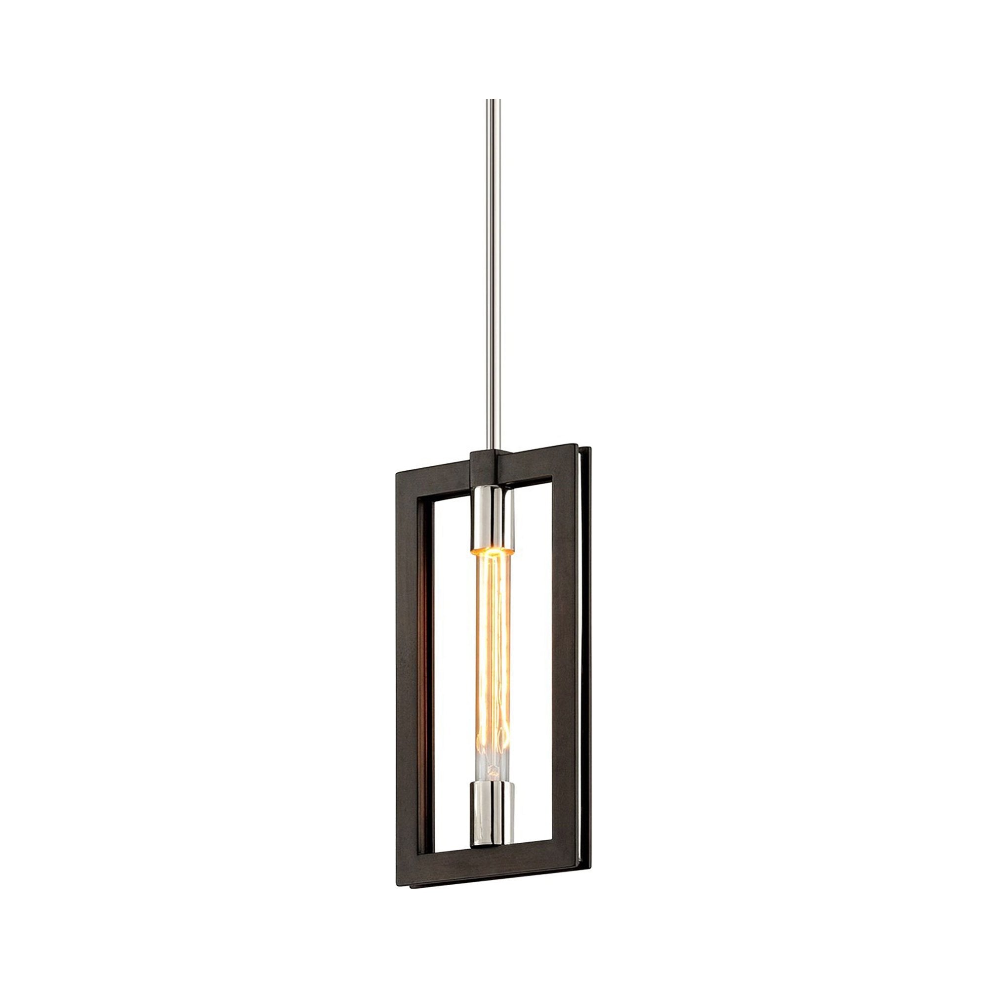 Exposed filaments create a tube of light within the open frame of the sleek Enigma Mini Pendant Light from Troy Lighting.