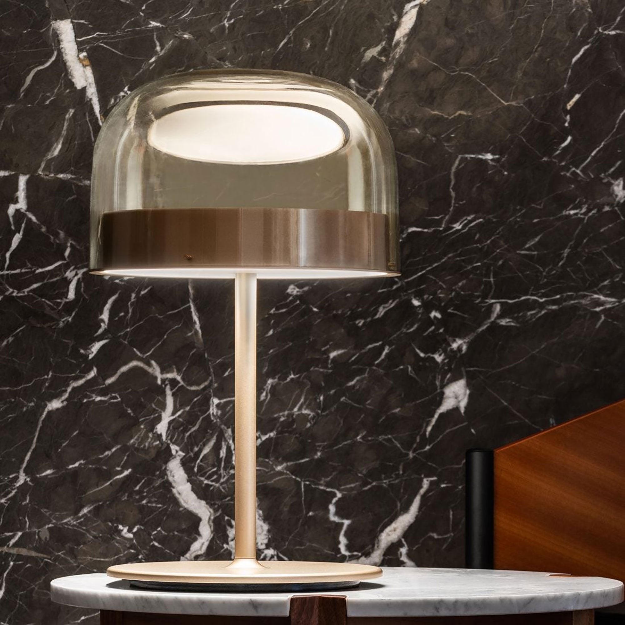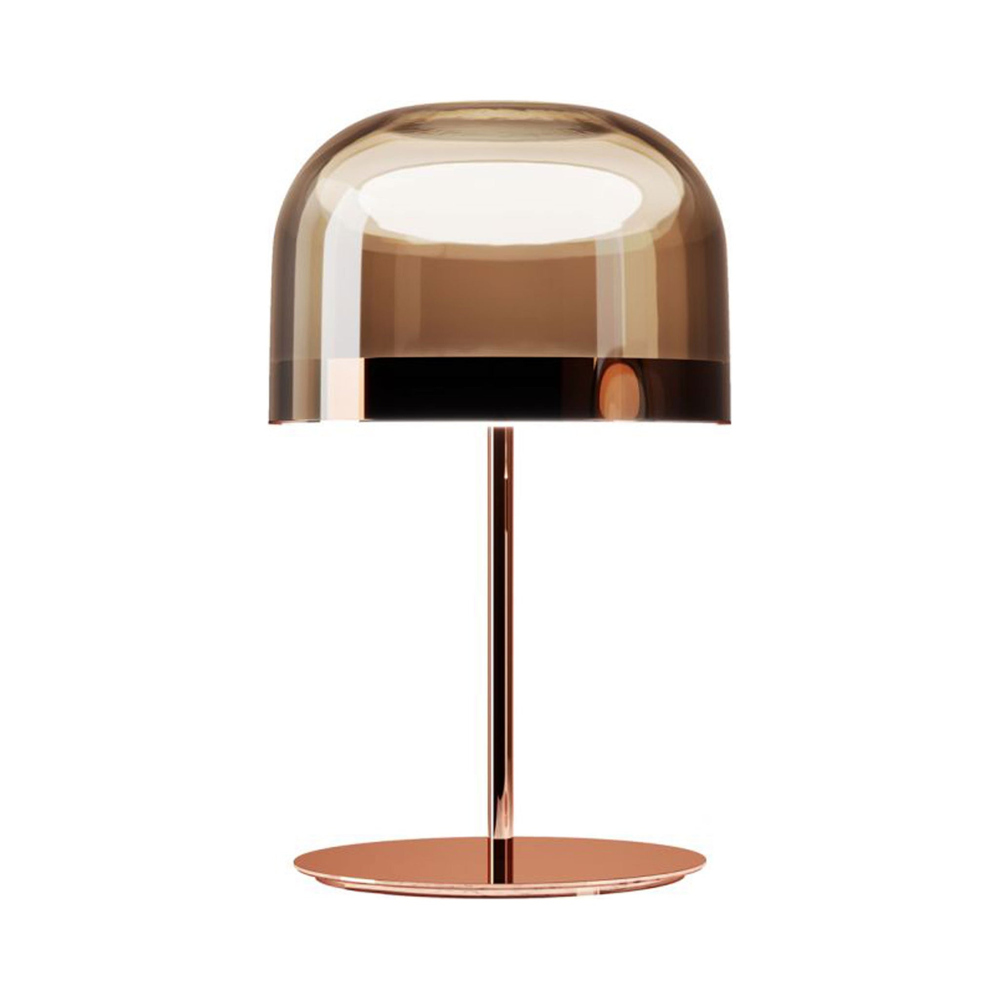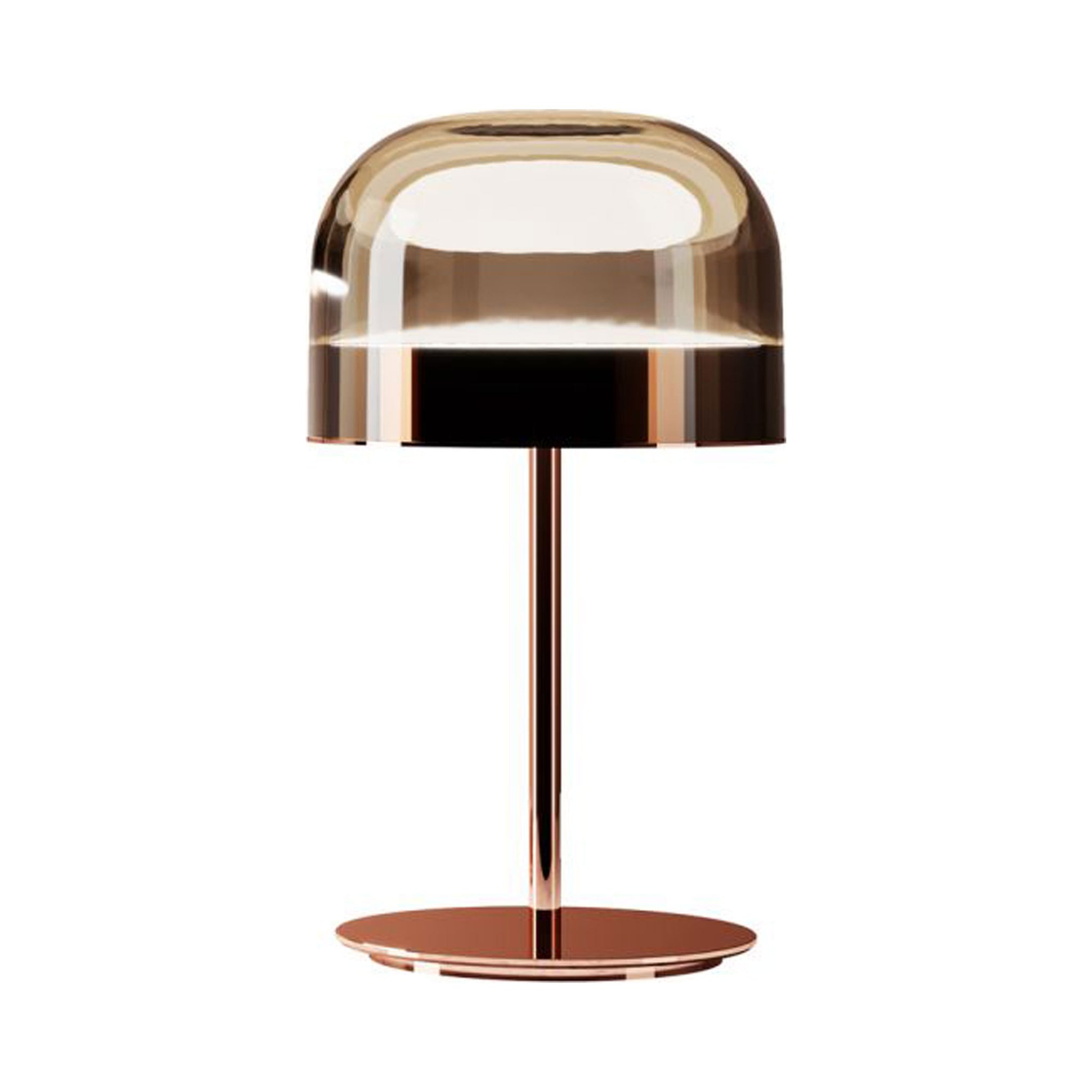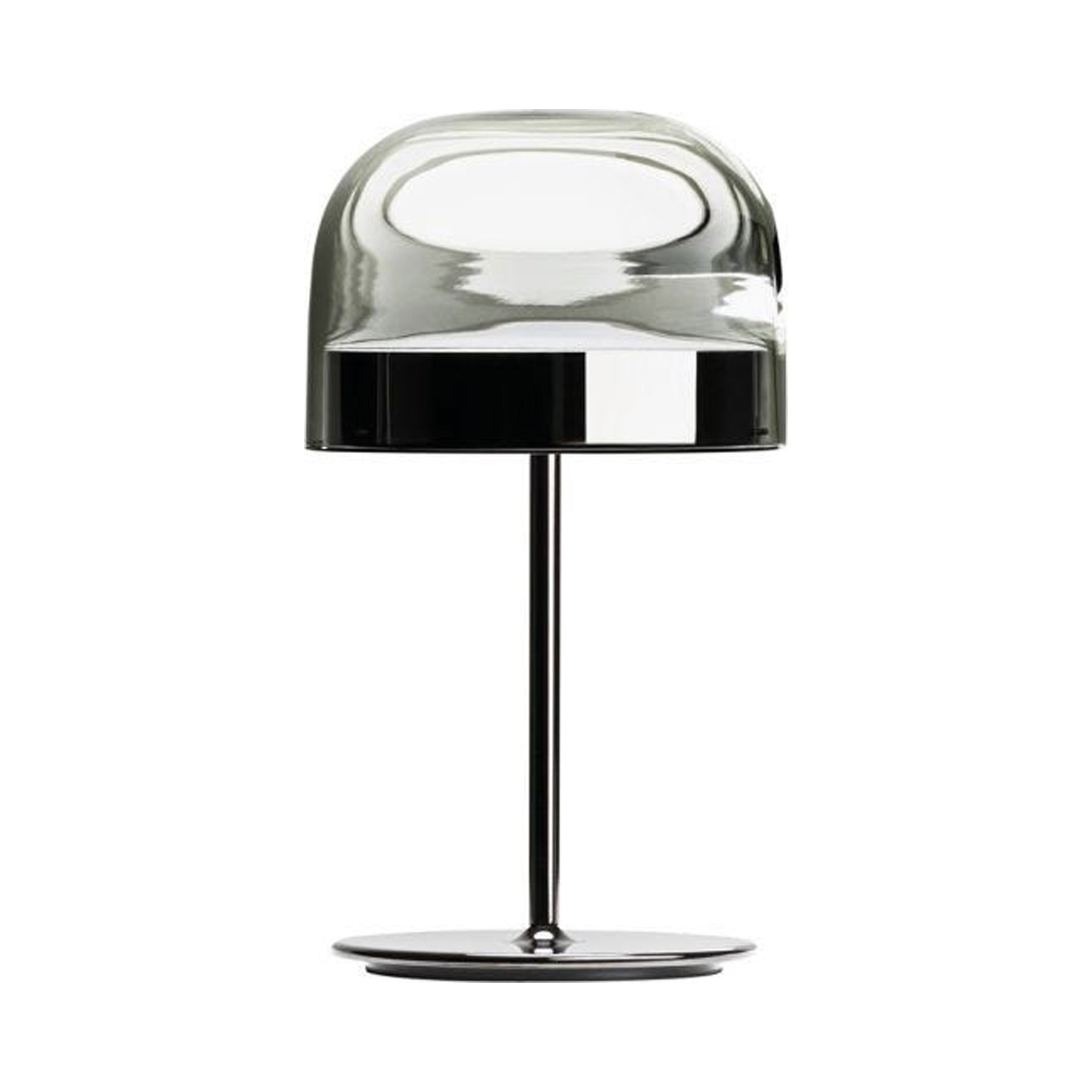 Equatore is a contemporary reinterpretation of the classic lamp with a glass shade. While the traditional abat-jour uses the shade to contain the light source within, in this family of lamps the shade is paradoxically and suggestively empty, with the light being generated by two luminous discs placed inside a central metal band, visible on the shade, that evokes the line of the equator. The light produced by the Leds, thanks to internal screens arranged in layers, is distributed regularly across the surface of the discs, magically illuminating them. The bottom disc directs the light output downward, the upper one illuminates the glass cap for a soft, diffused light. Available in table, floor and ceiling models, in two sizes and two colors: a cooler version in gray with a dark chrome frame, and a warmer version with a transparent dove gray cap and a copper-colored frame.