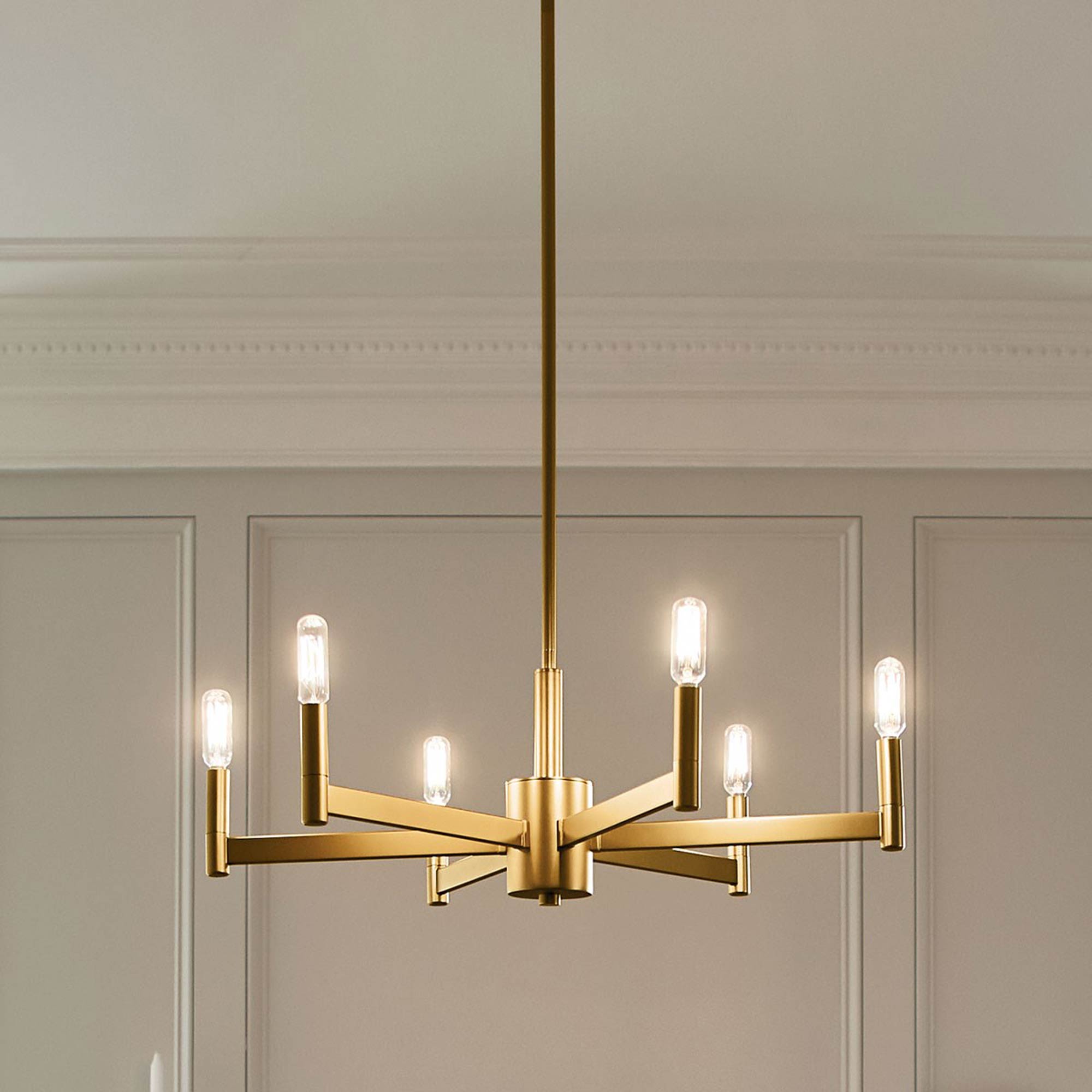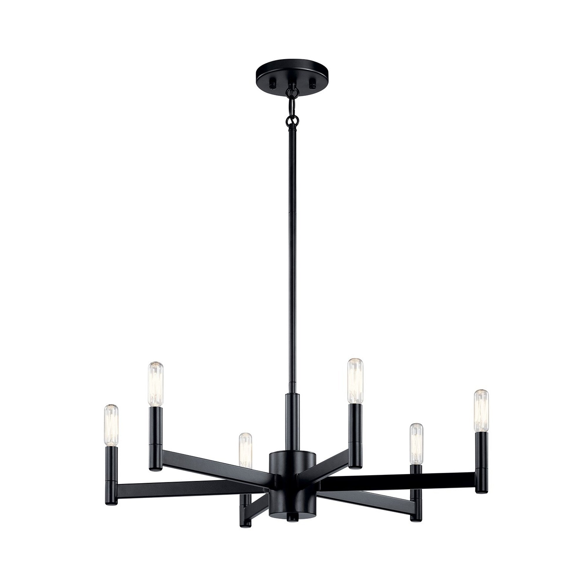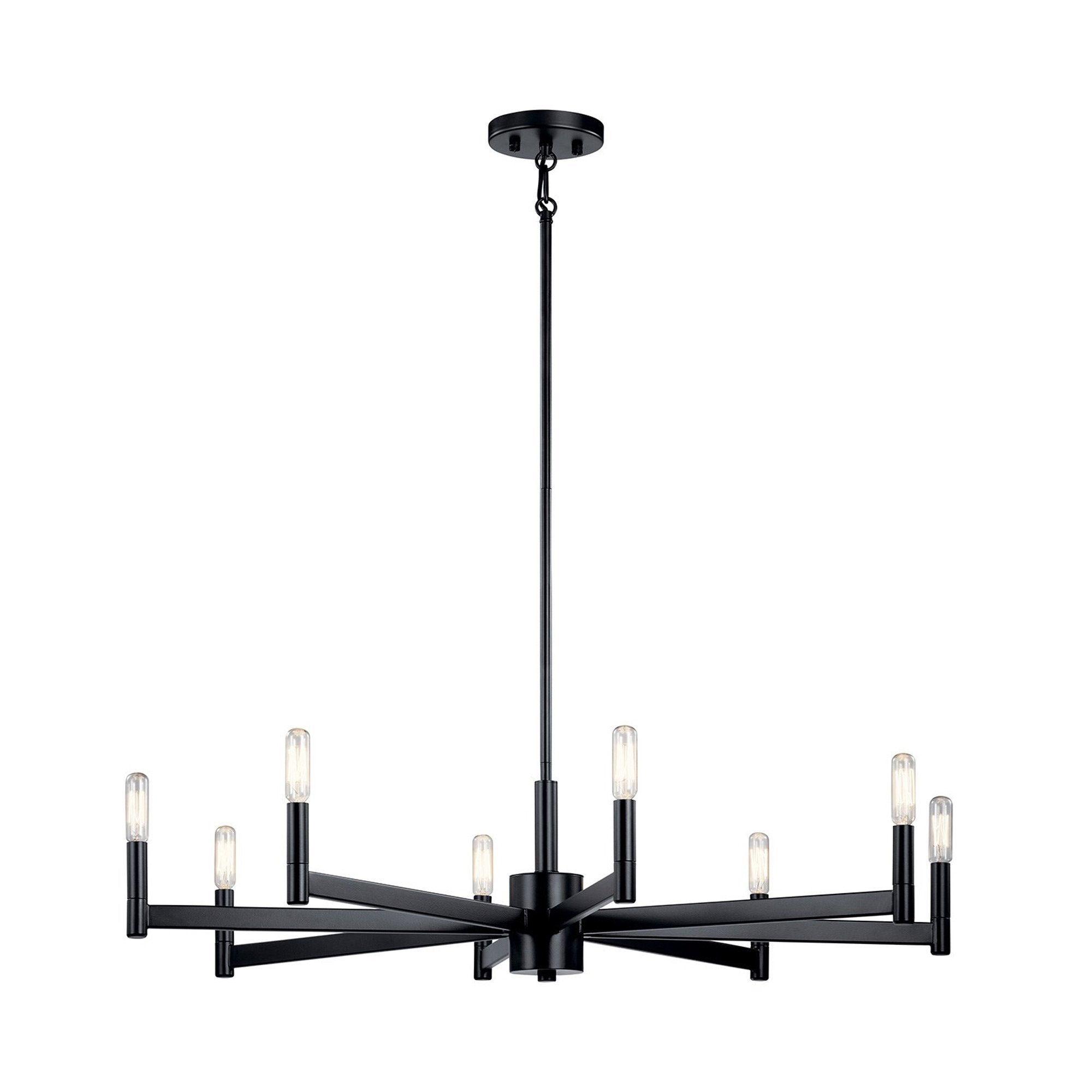 The Erzo Chandelier in Black, Natural Brass and Satin Nickel finish features simple clean lines. The Erzo chandelier is perfect in contemporary or mid century modern environments.